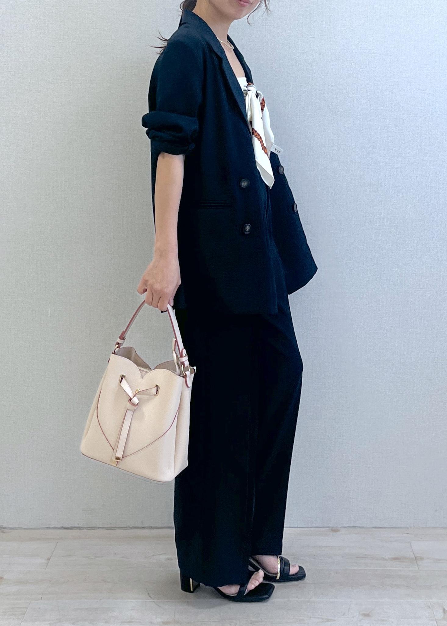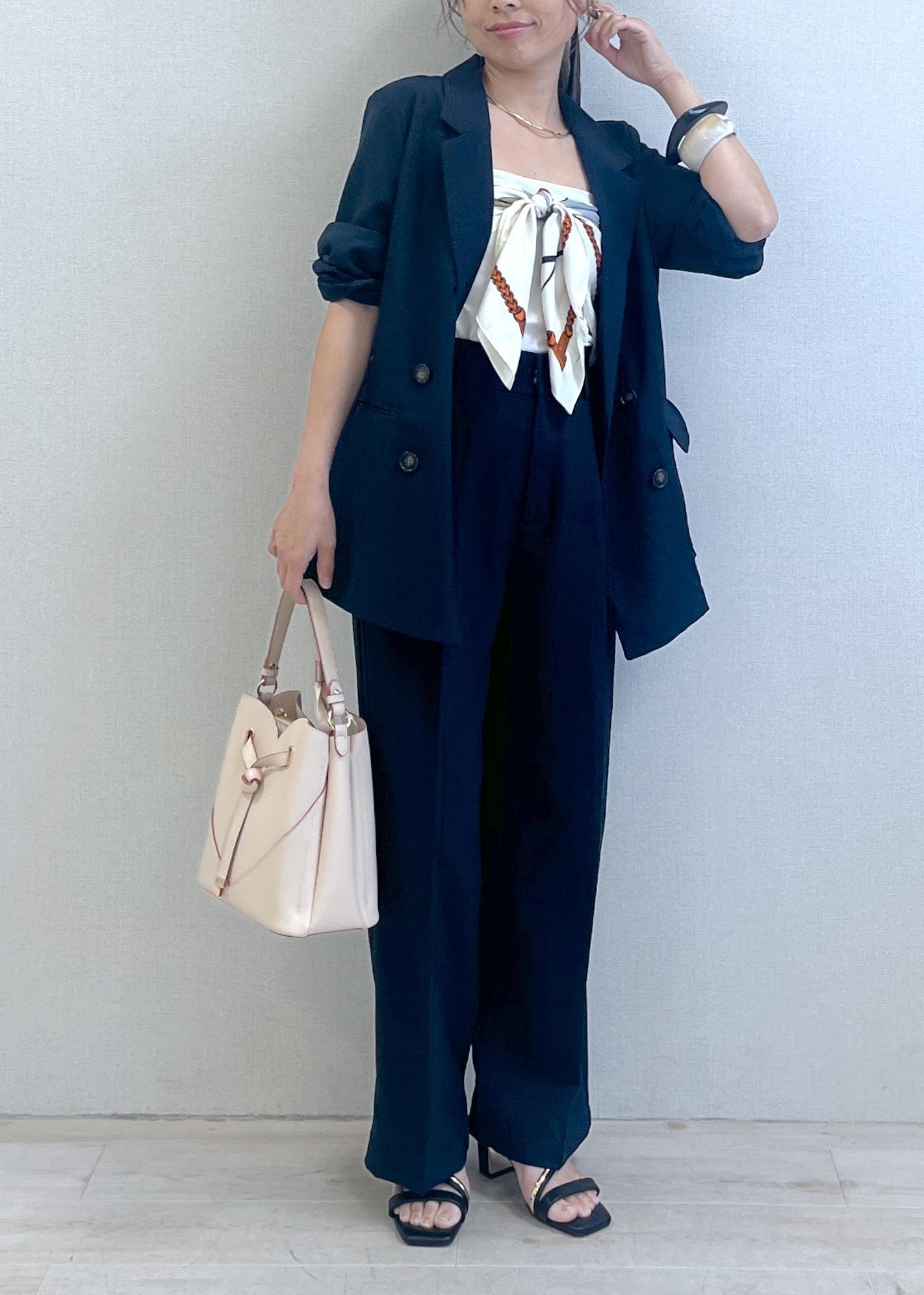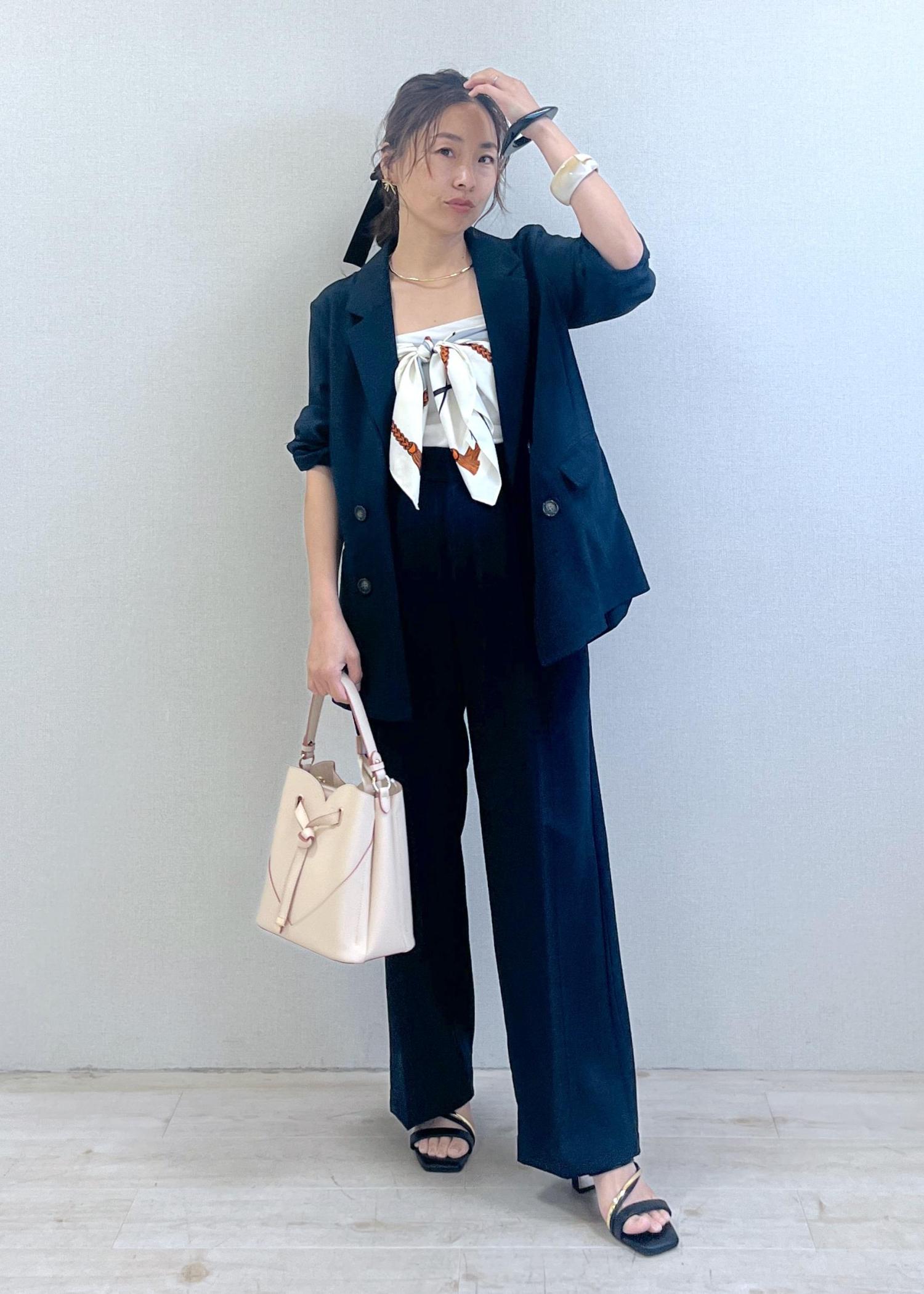 シンプルなジャケット×ワイドパンツに、スカーフをトップス風にアレンジして遊び心をプラス。落ち着いたネイビーに映える柔らかなベージュのバッグが、コーデ全体を軽やかに引き上げます。オンにもオフにも使える、大人の余裕漂う着こなし。