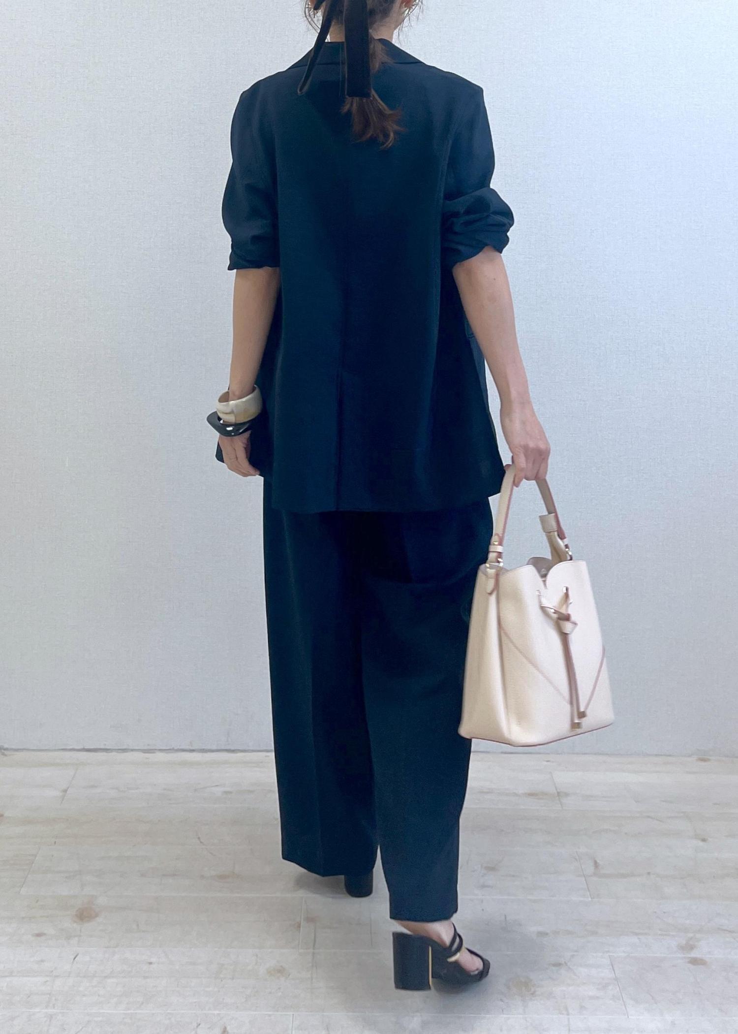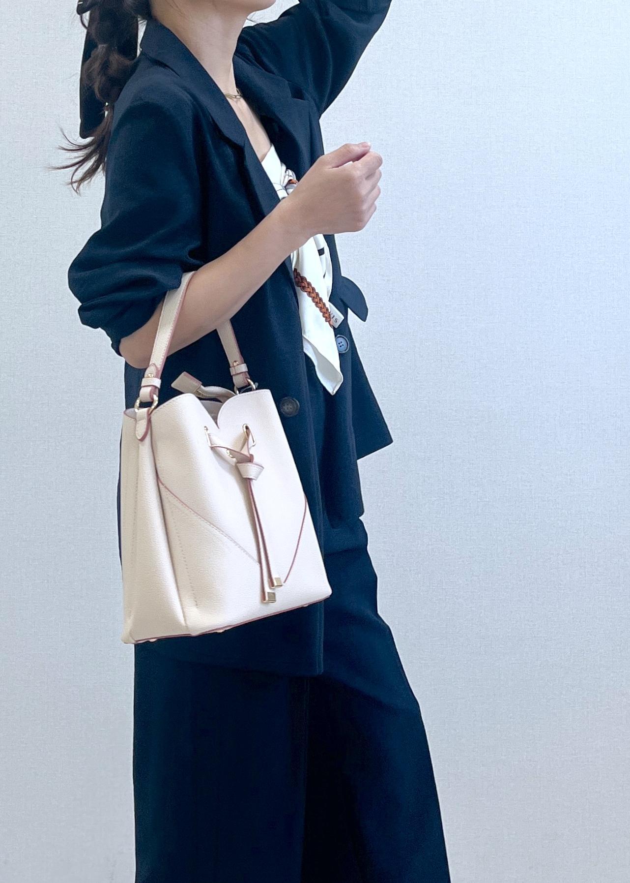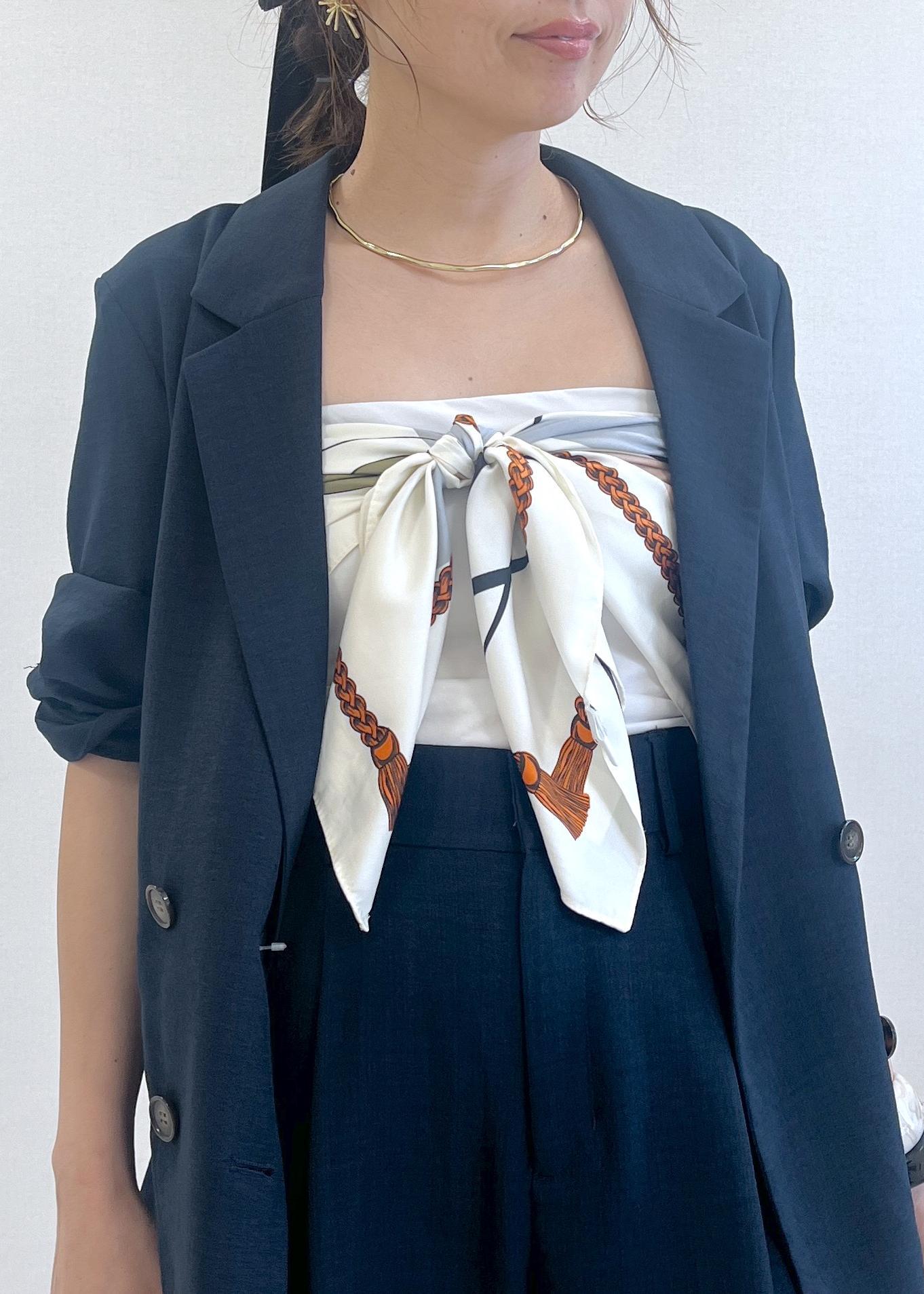 シンプルなジャケット×ワイドパンツに、スカーフをトップス風にアレンジして遊び心をプラス。落ち着いたネイビーに映える柔らかなベージュのバッグが、コーデ全体を軽やかに引き上げます。オンにもオフにも使える、大人の余裕漂う着こなし。
