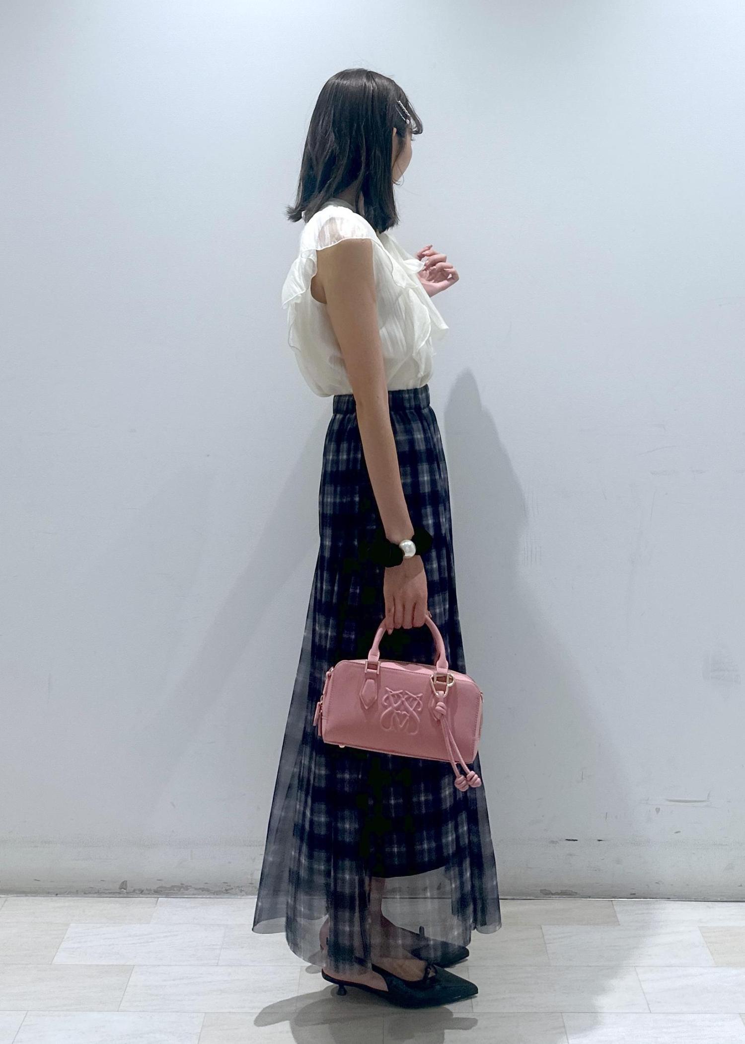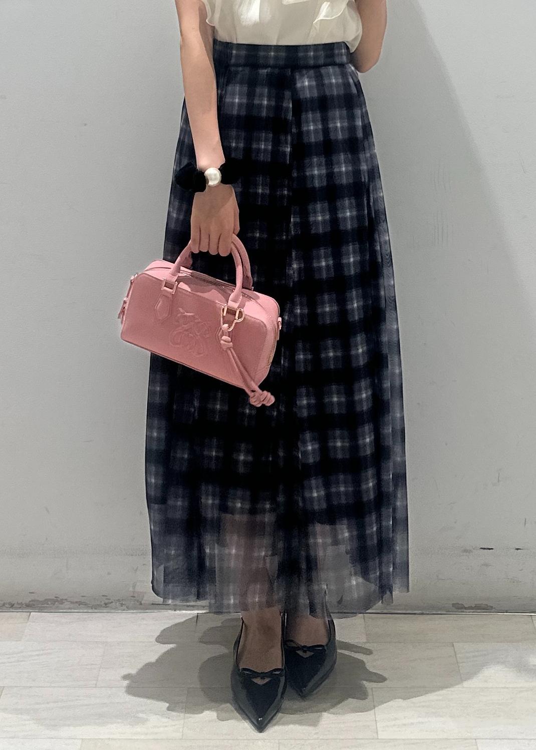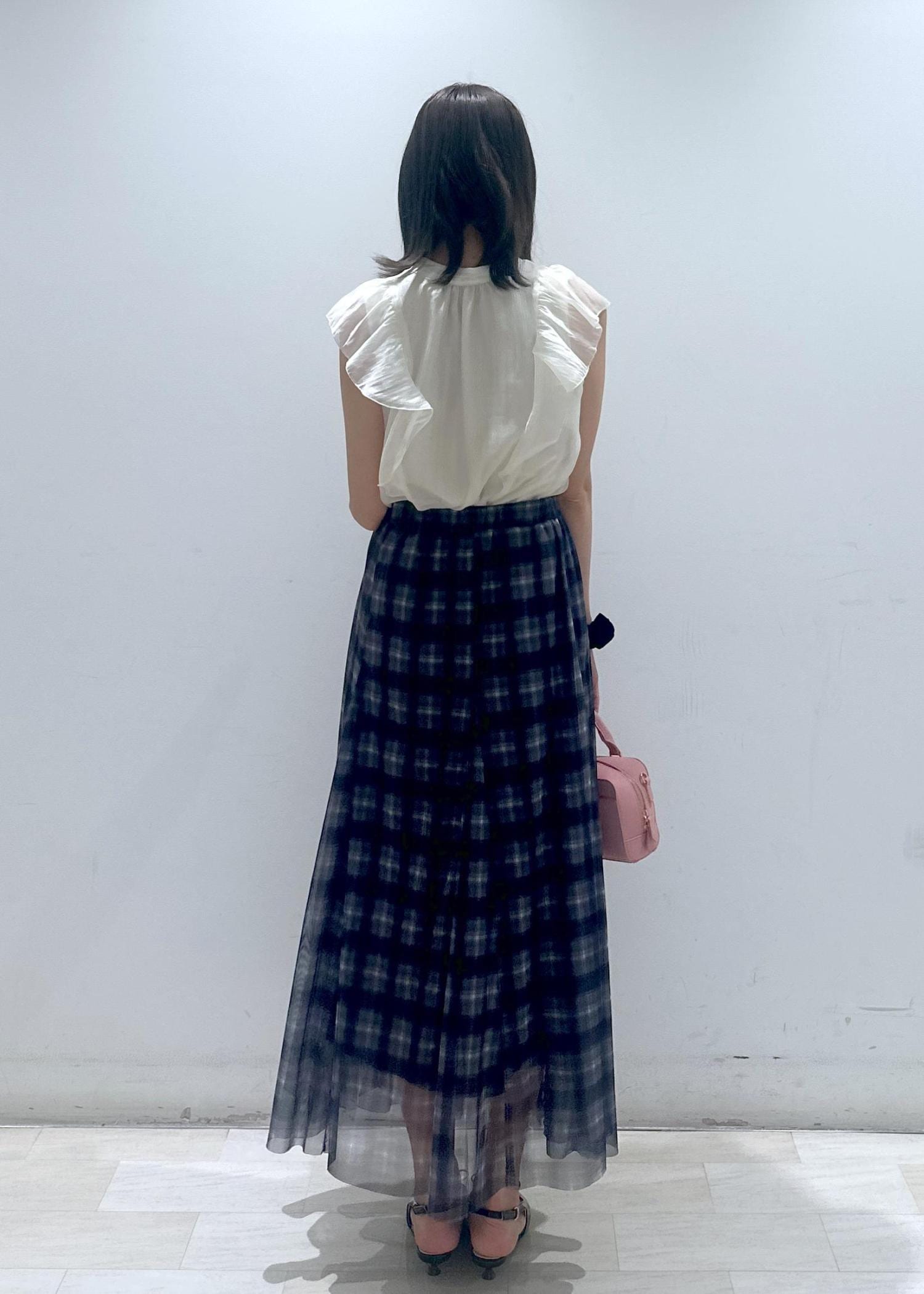 VIS【洗える】チュールプリントチェックスカートブラック系 / F¥4,612レビュー柔らかく透け感のあるチュール素材にトレンドのオンブレーチェックをプリントしたセミフレアスカート。