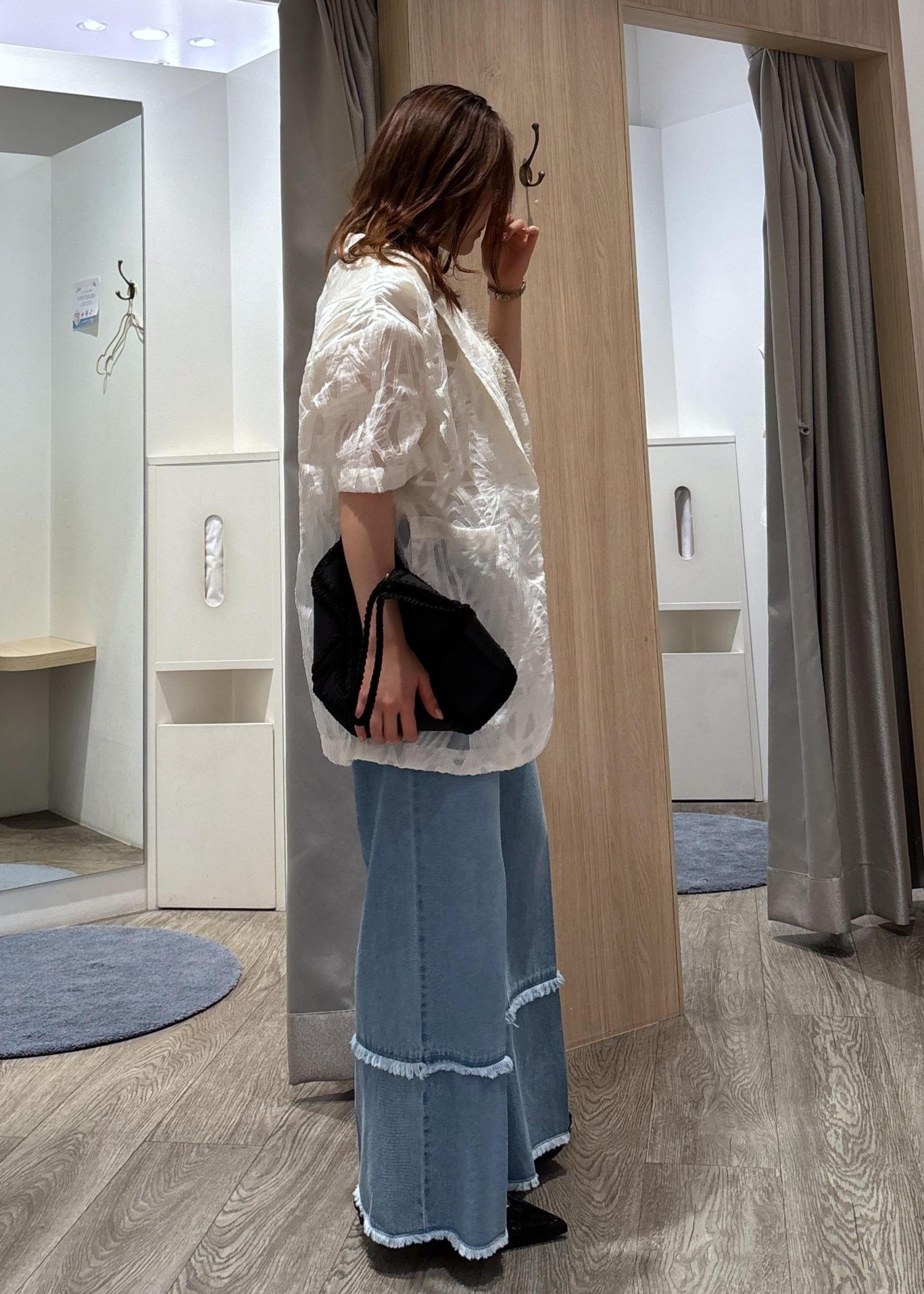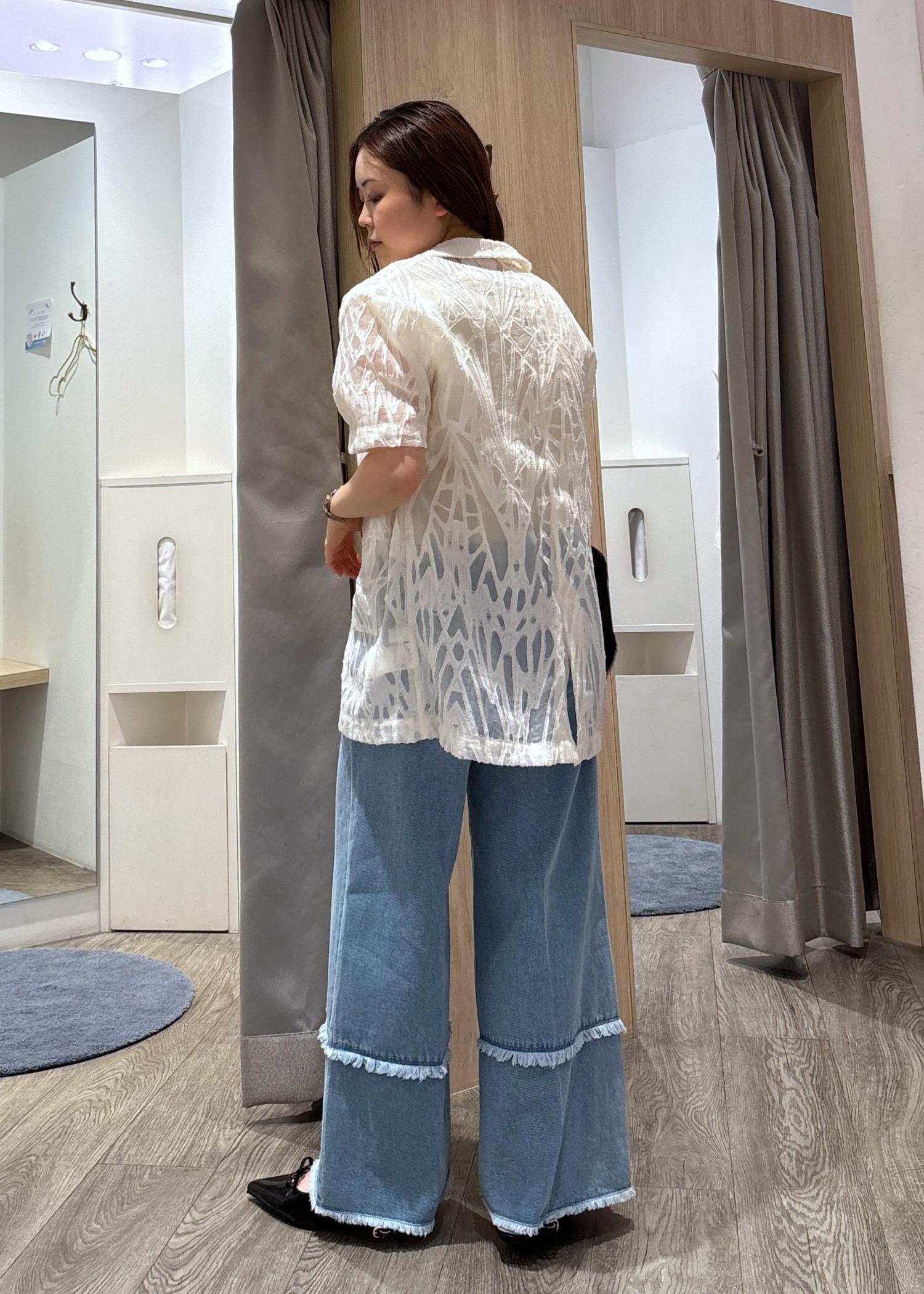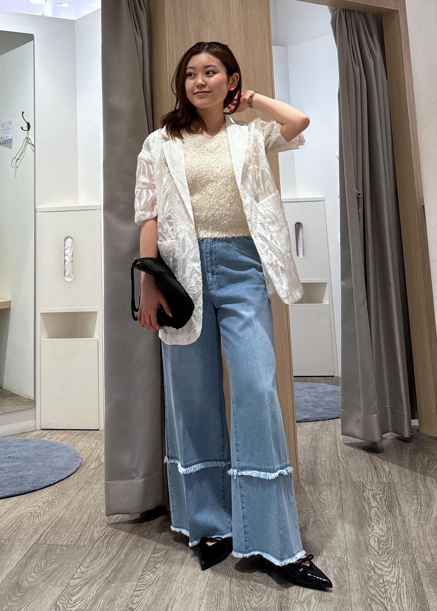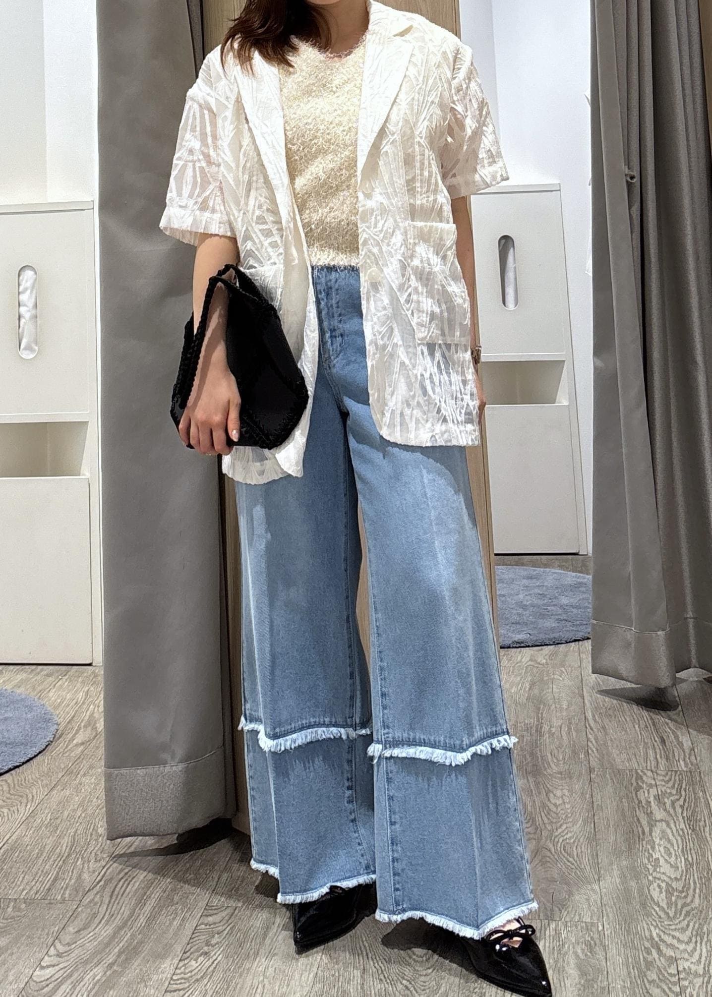 VISフリンジフレアデニムサックス / S¥4,395レビュー身長150センチでsサイズフラットシューズ合わせでも床にギリギリつきませんでした