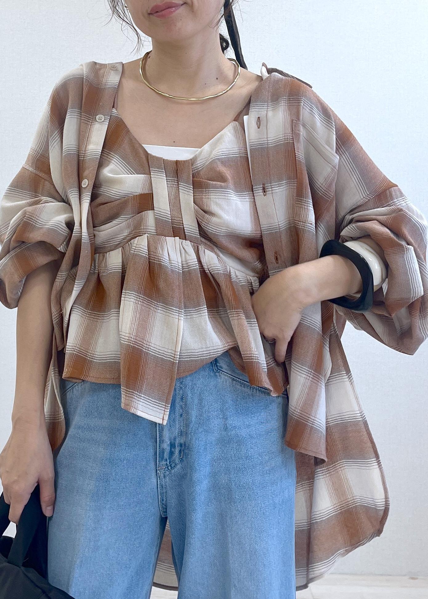 152cmで着丈はお尻がすっぽり隠れるくらいの長め丈。オーバーサイズですが、トロミのある素材なので横に広がることなく下にストンっと落ちてくれるので、こなれ感を演出してくれました!サイドスリット入りなので横からの見え方に抜け感も出せ◎羽織りにも、腰に巻いたりとチェックシャツは今の時期から大活躍なアイテムです。
