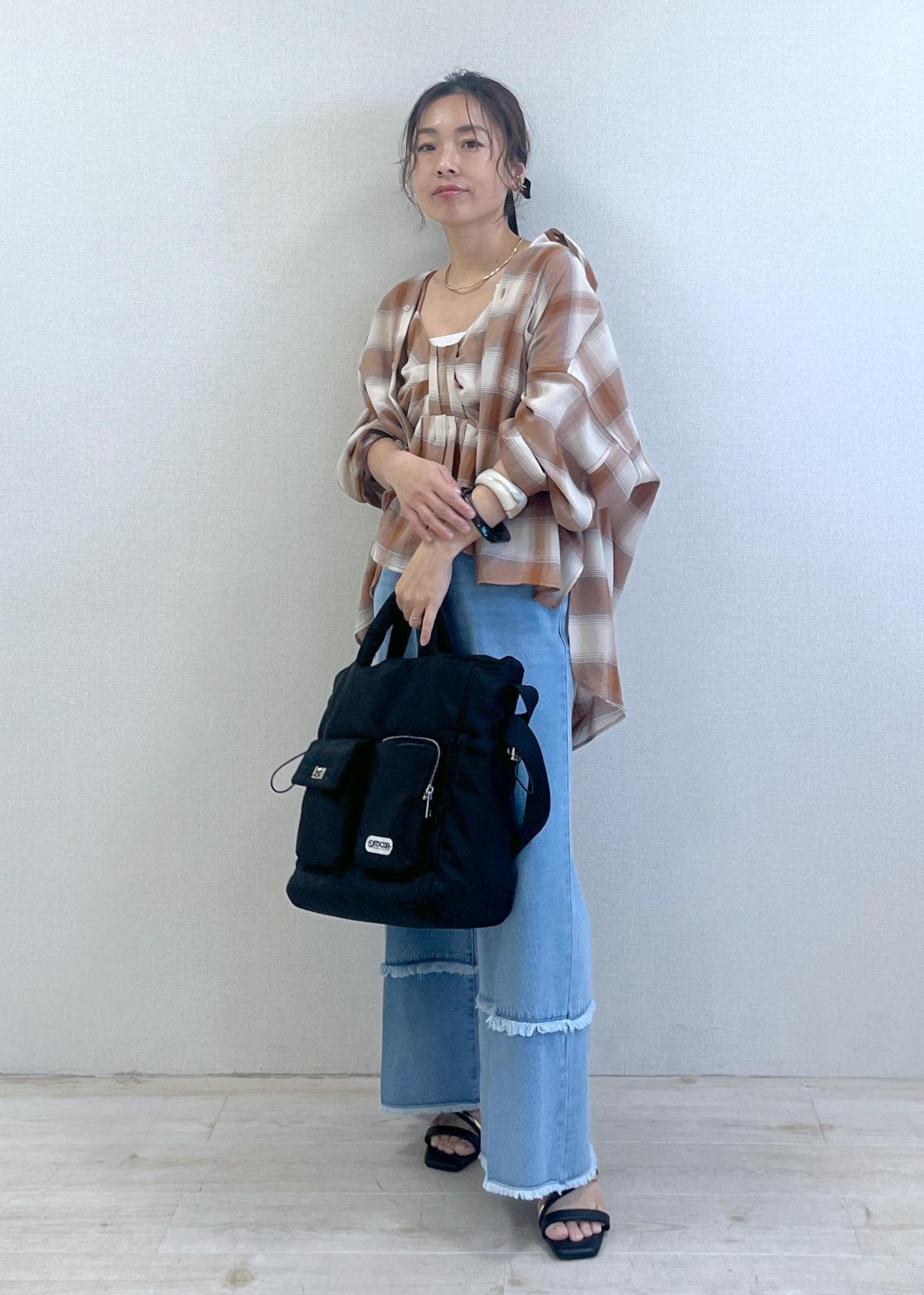 ほんのり秋色を感じるブラウンチェックを主役にしたカジュアルコーデ。