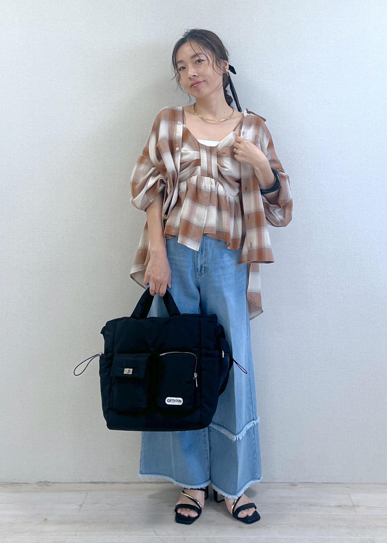 ラフに羽織ったシャツで抜け感を出しつつ、黒小物で大人っぽく引き締めました。