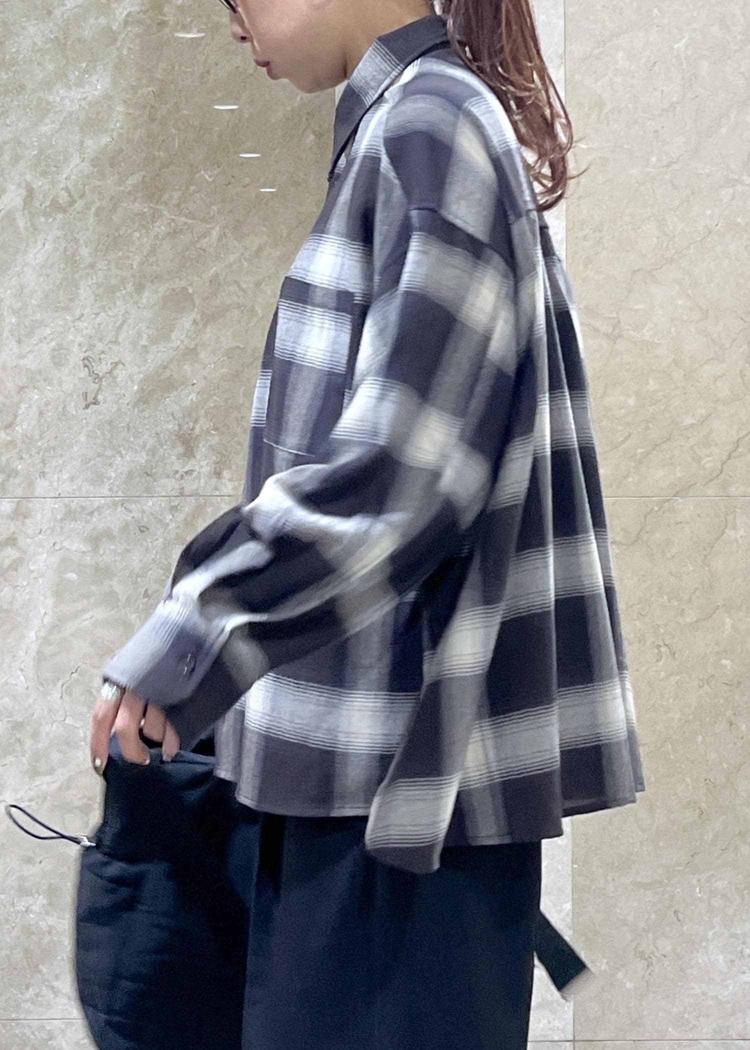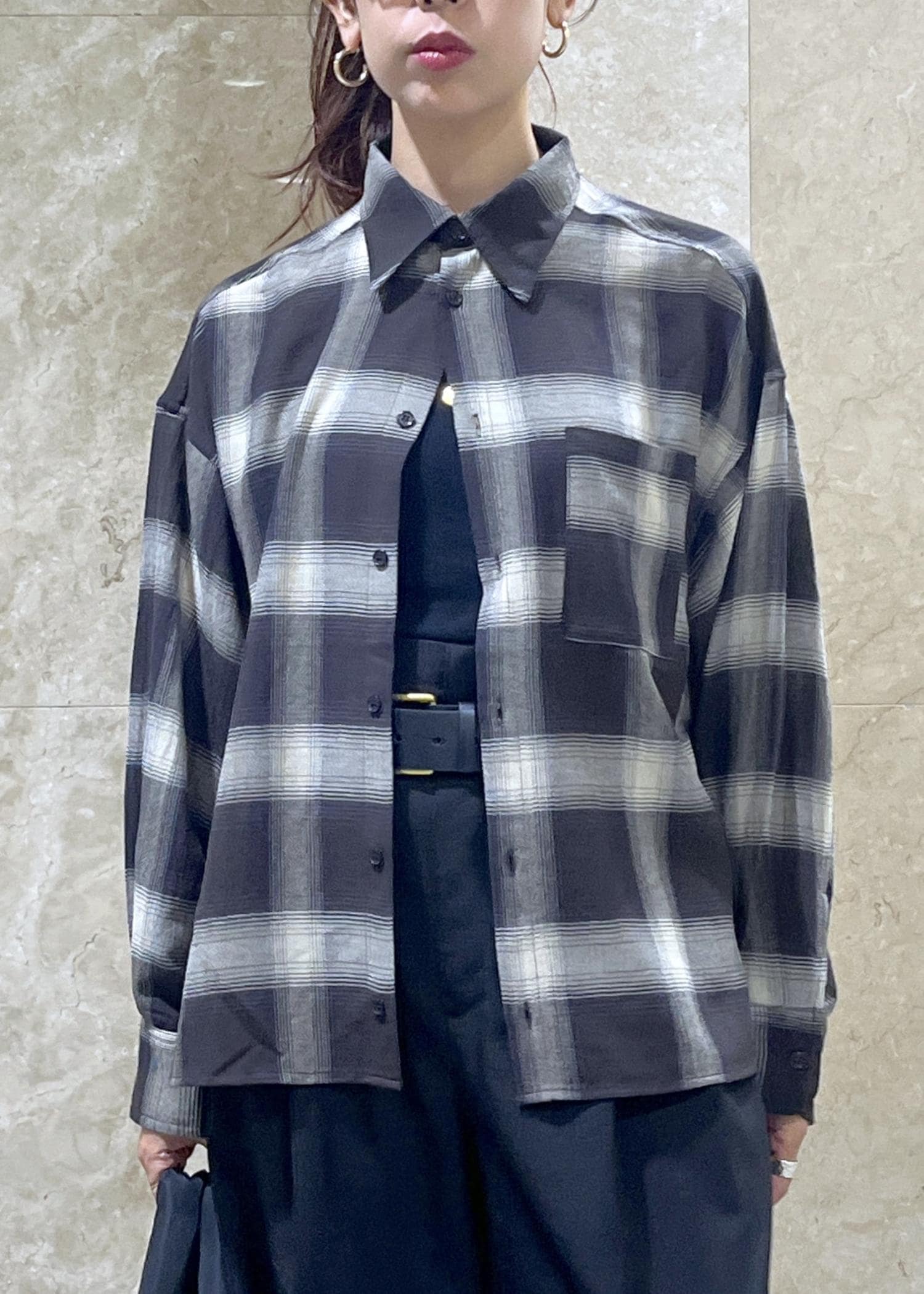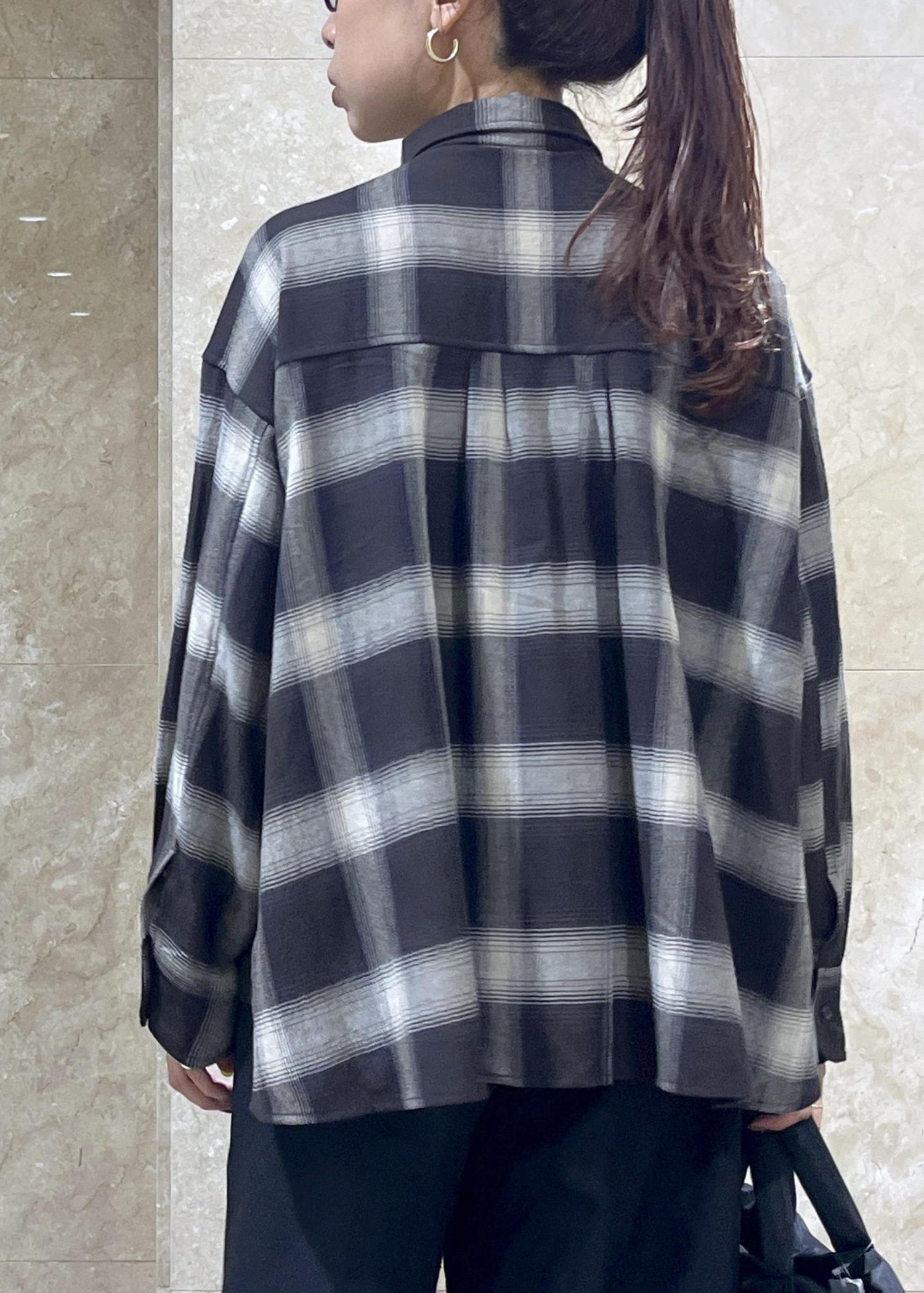 VISオンブレチェックオーバーシャツブラック系 / F¥6,589レビュー身長158cm、ゆったりとしたオーバーサイズで着丈は少し前後差があり後ろはおしりがすっぽりと隠れるほど。
