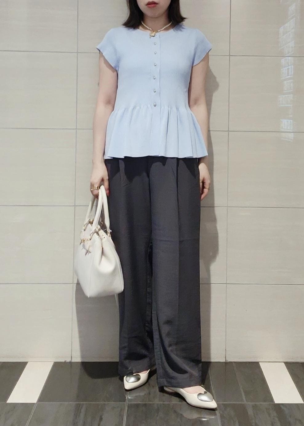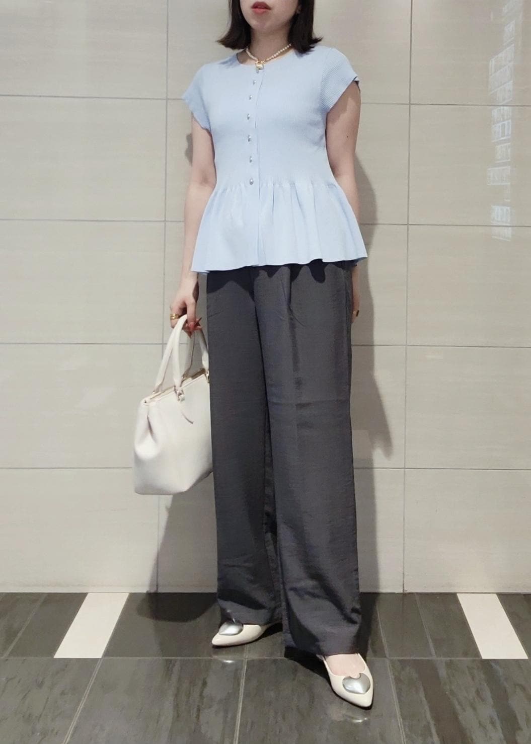 ボトムは定番のワイドパンツできちんと感を出したオフィスカジュアルコーデです。