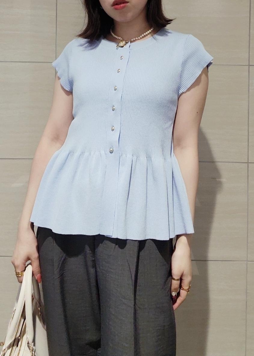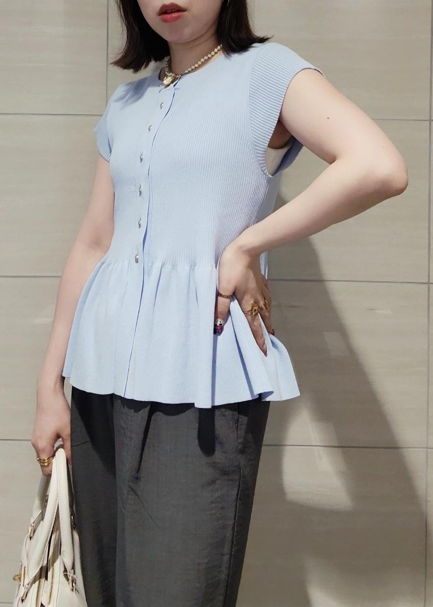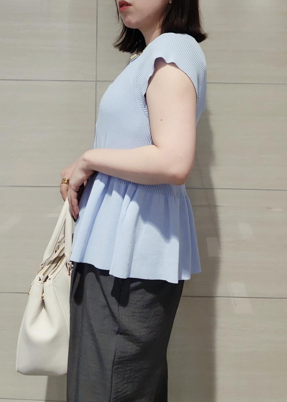 VIS【アンチピリング/洗える】美SMARTショートスリーブペプラムニットサックス / F¥5,489レビューお袖丈は肩山から少し下がるほどで1枚着として着やすいです。