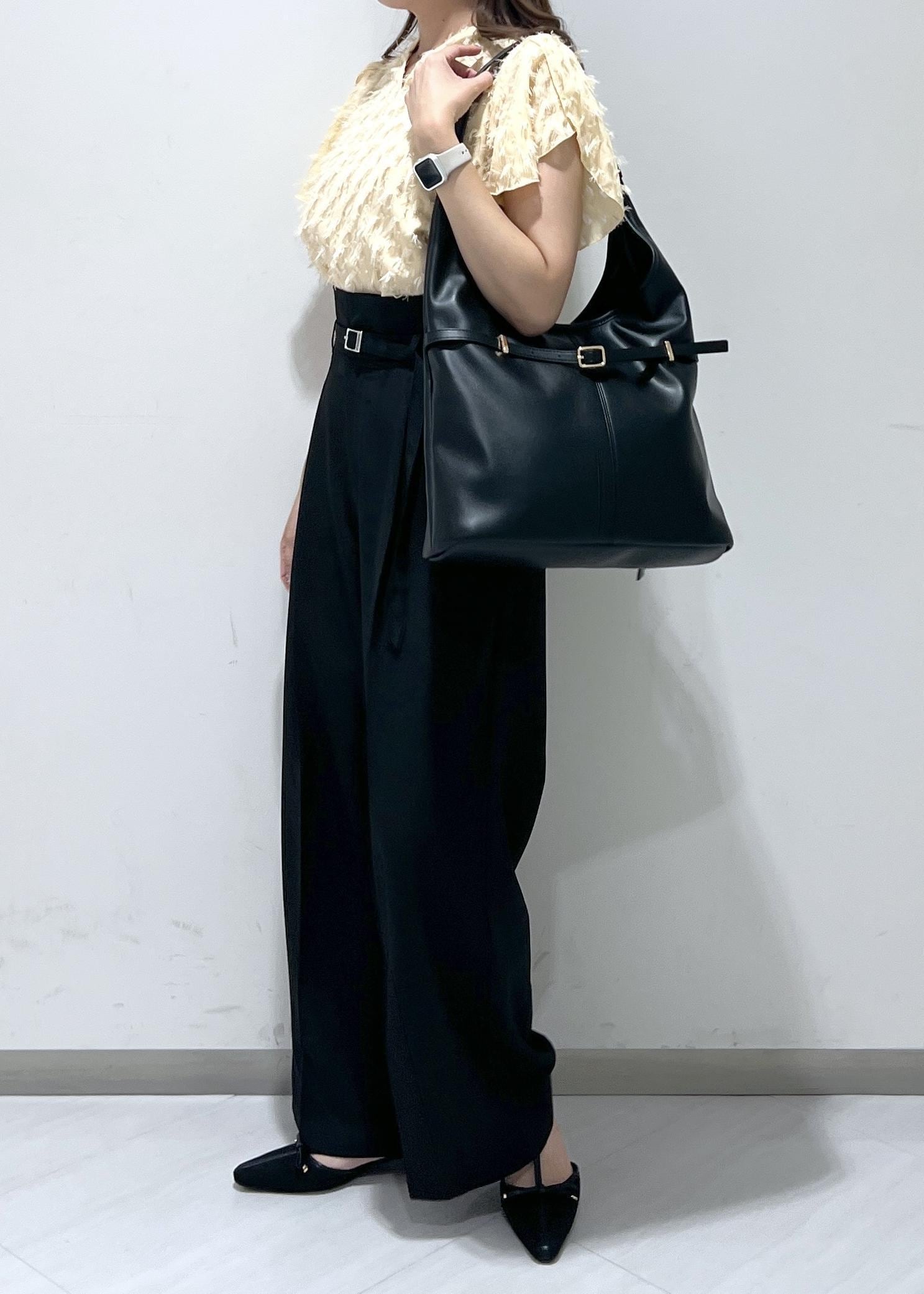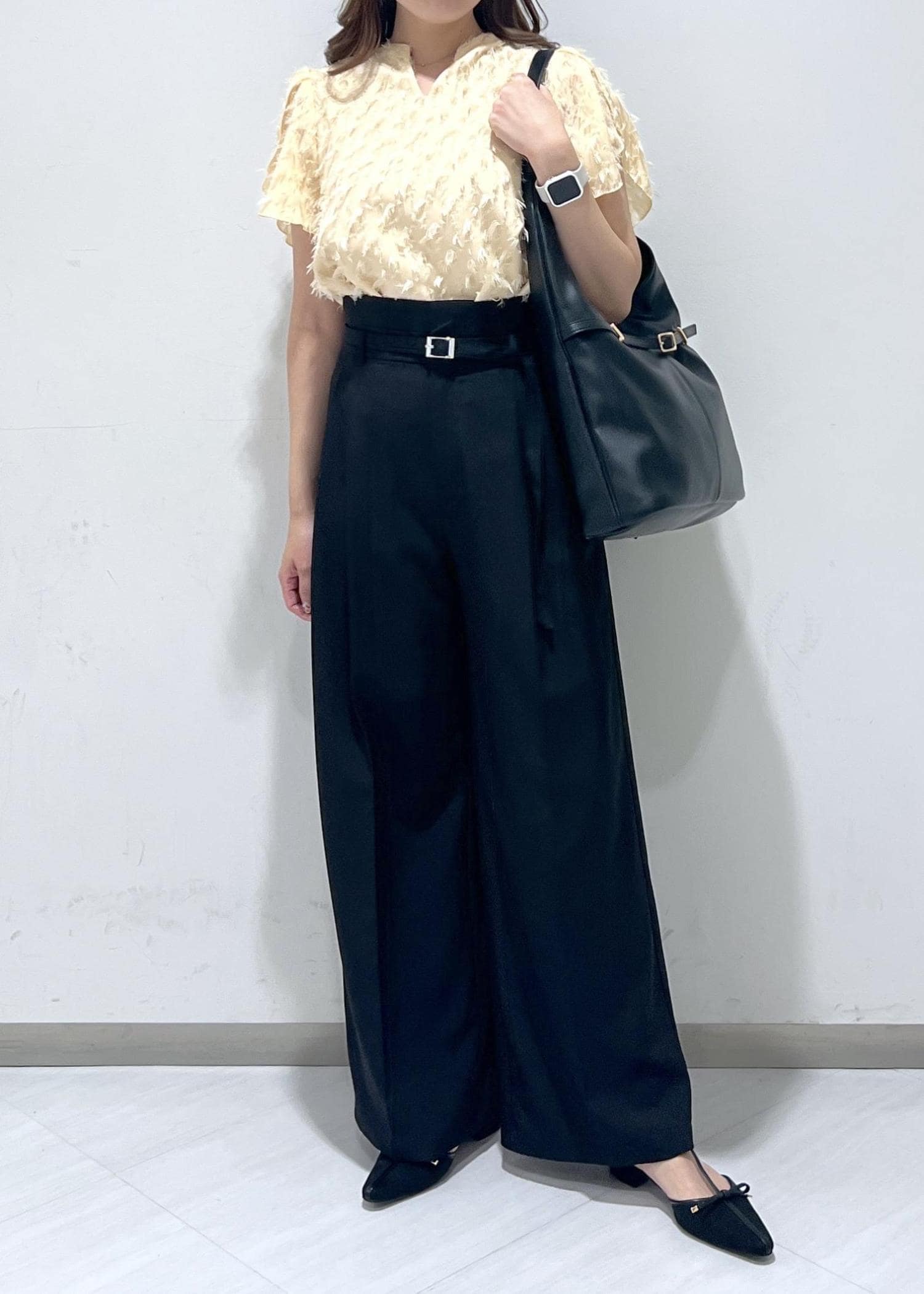 VIS【新色追加】【防シワ/接触冷感】ベルトディテールタックワイドスラックスパンツブラック / M¥6,589レビュー身長164cm、Mサイズ着用でくるぶし下の丈感です!太もも周りはゆったりしたサイズ感になってます◎気分でお持ちのベルトで雰囲気を変えてコーディネート出来ます。