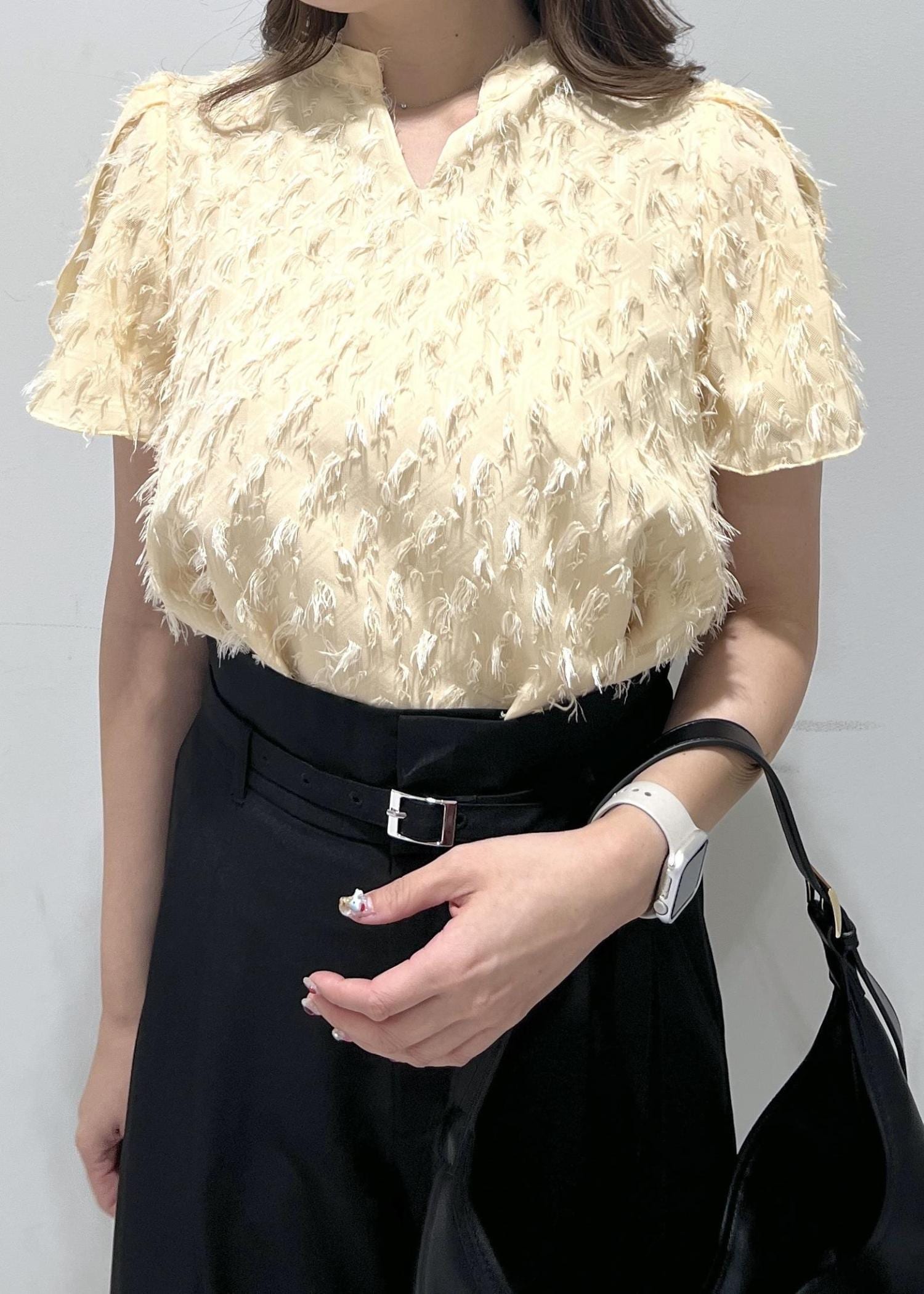 VISチューリップスリーブジャガードスキッパーブラウスオレンジ系 / F¥2,963レビュー着丈は長過ぎず、腰にかかるくらいなのでお好みでイン/アウトスタイルどちらでも着用いただけます◎