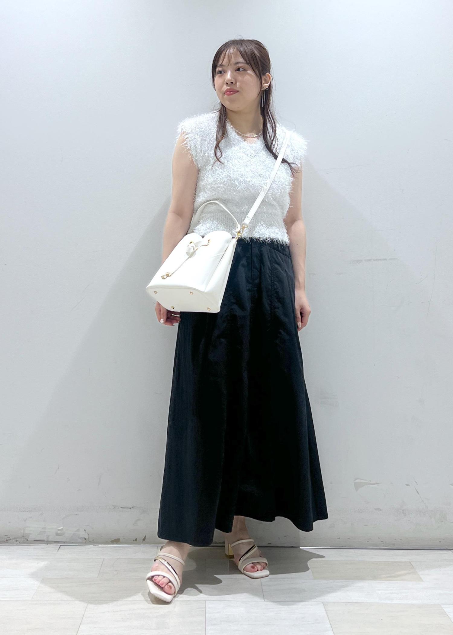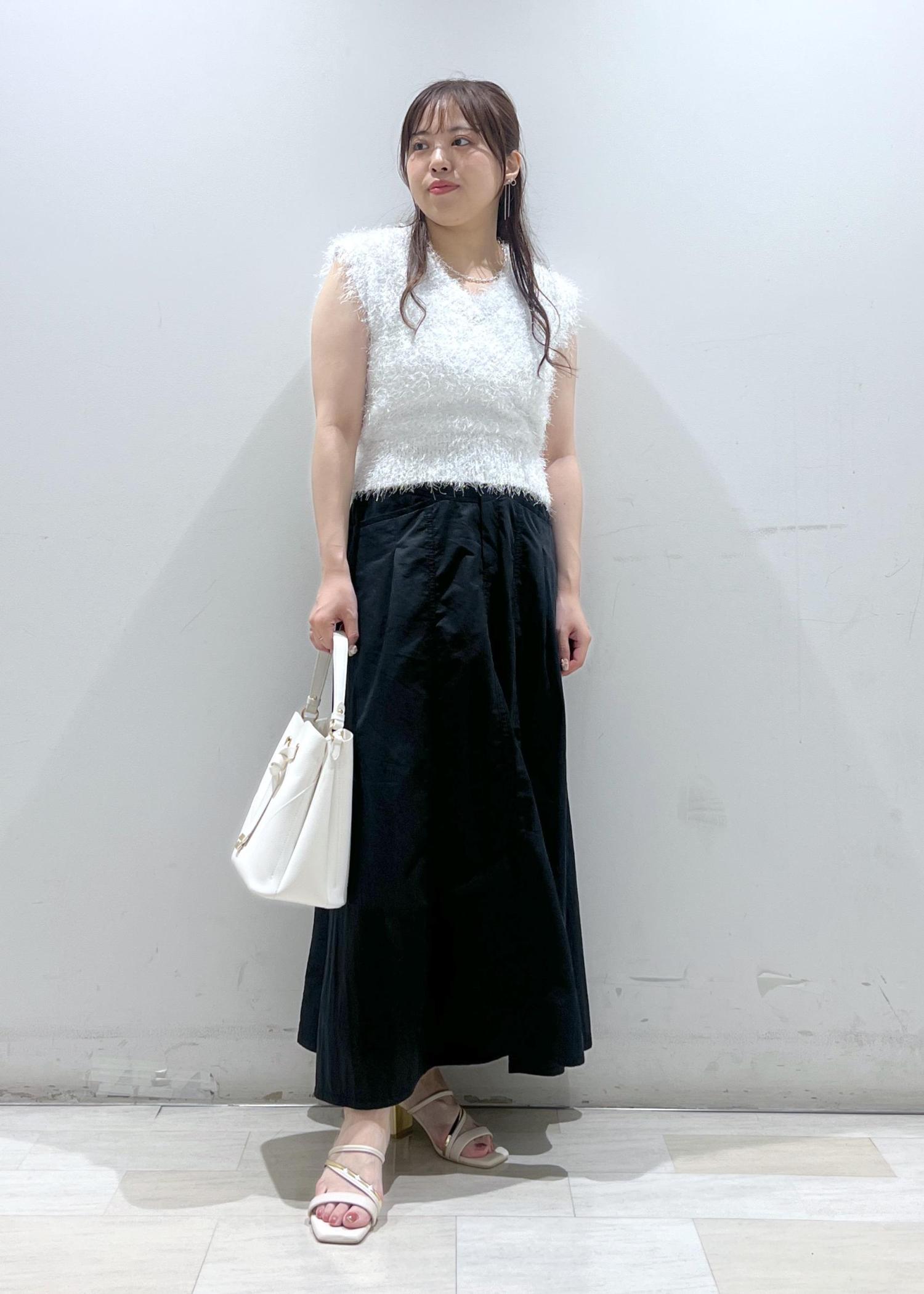 Aラインシルエットが綺麗なのでトップスはコンパクトなデザインのものを合わせるのがおすすめです。