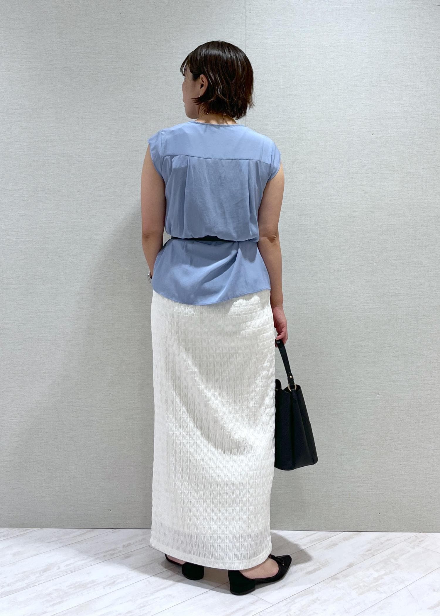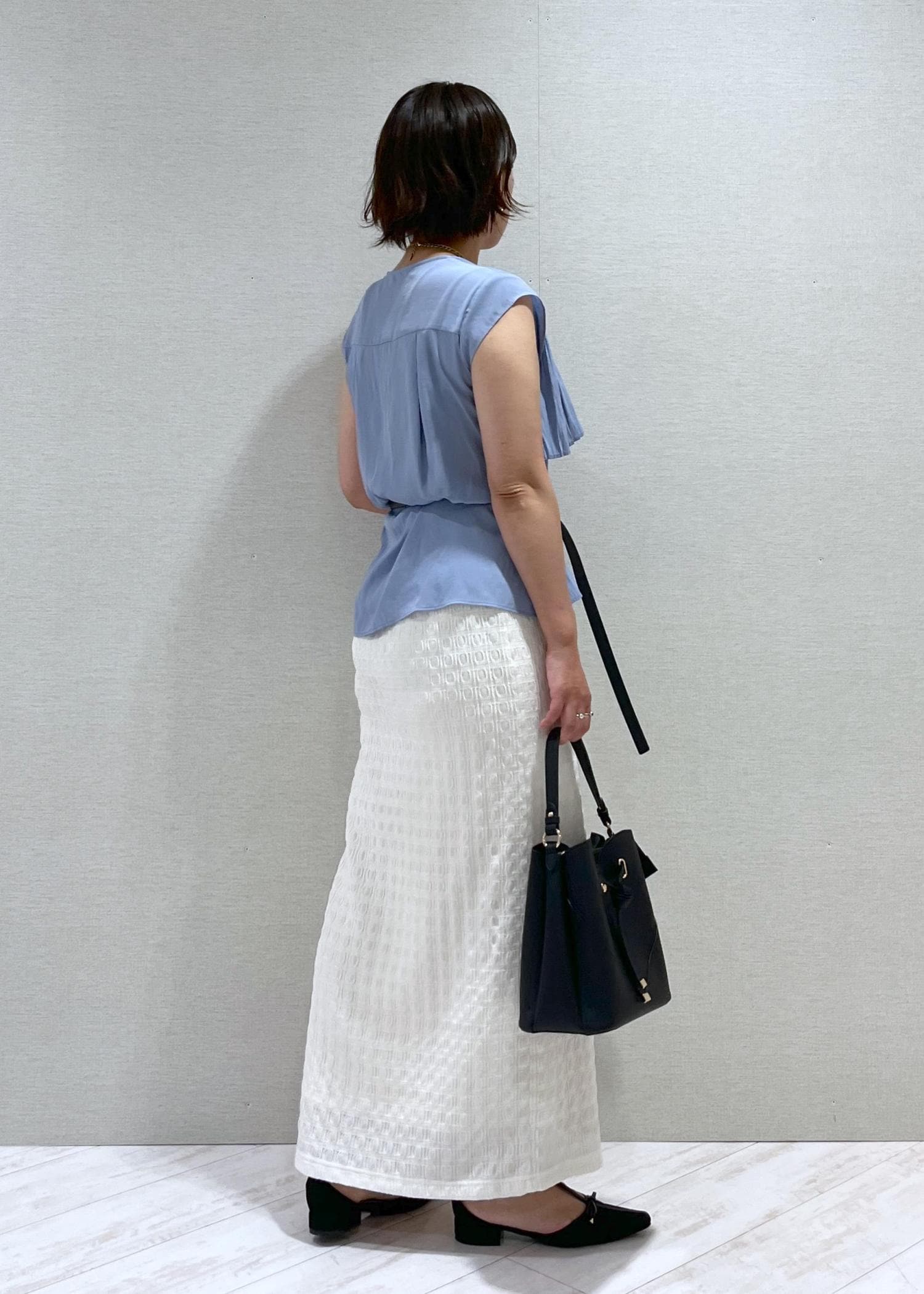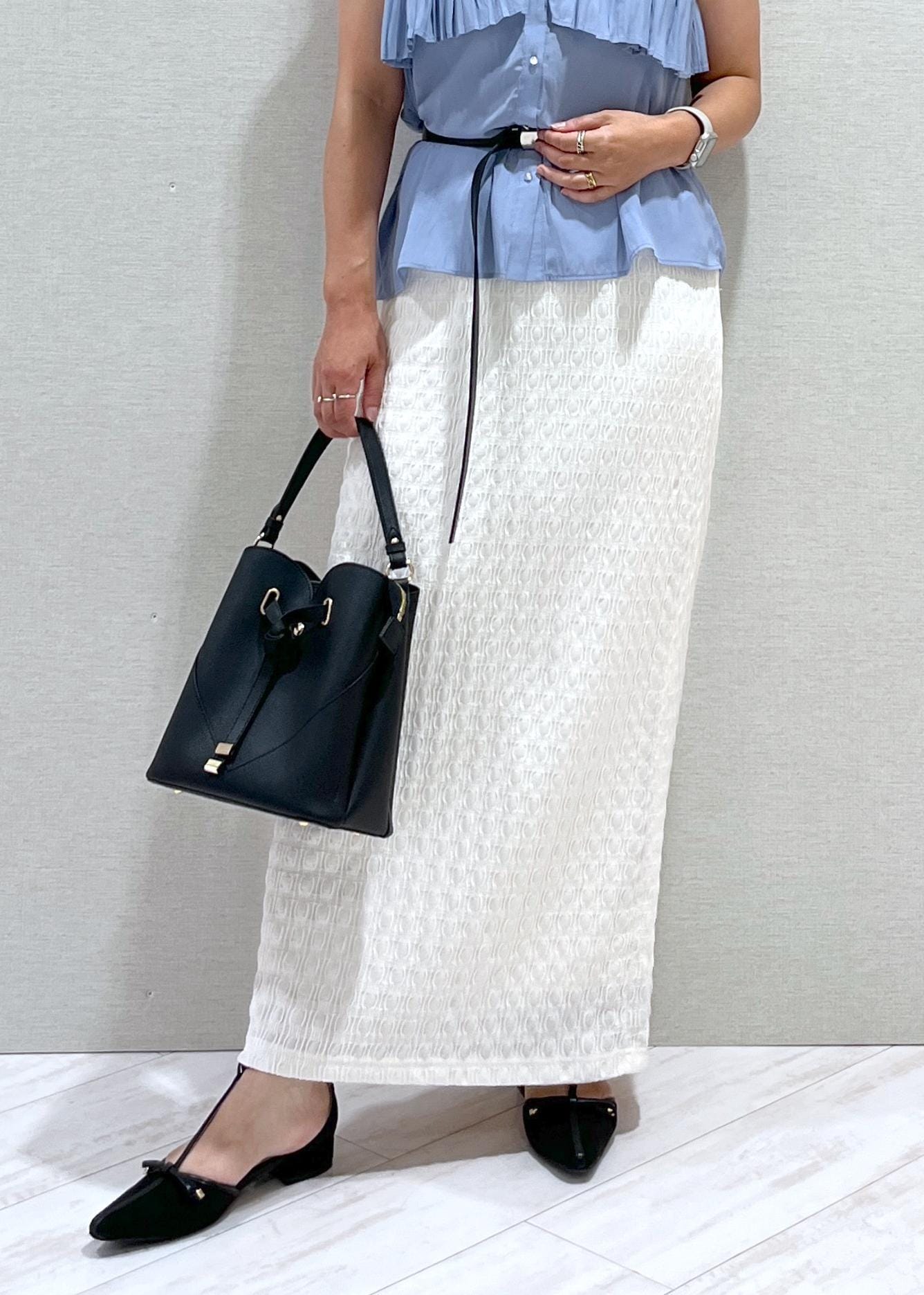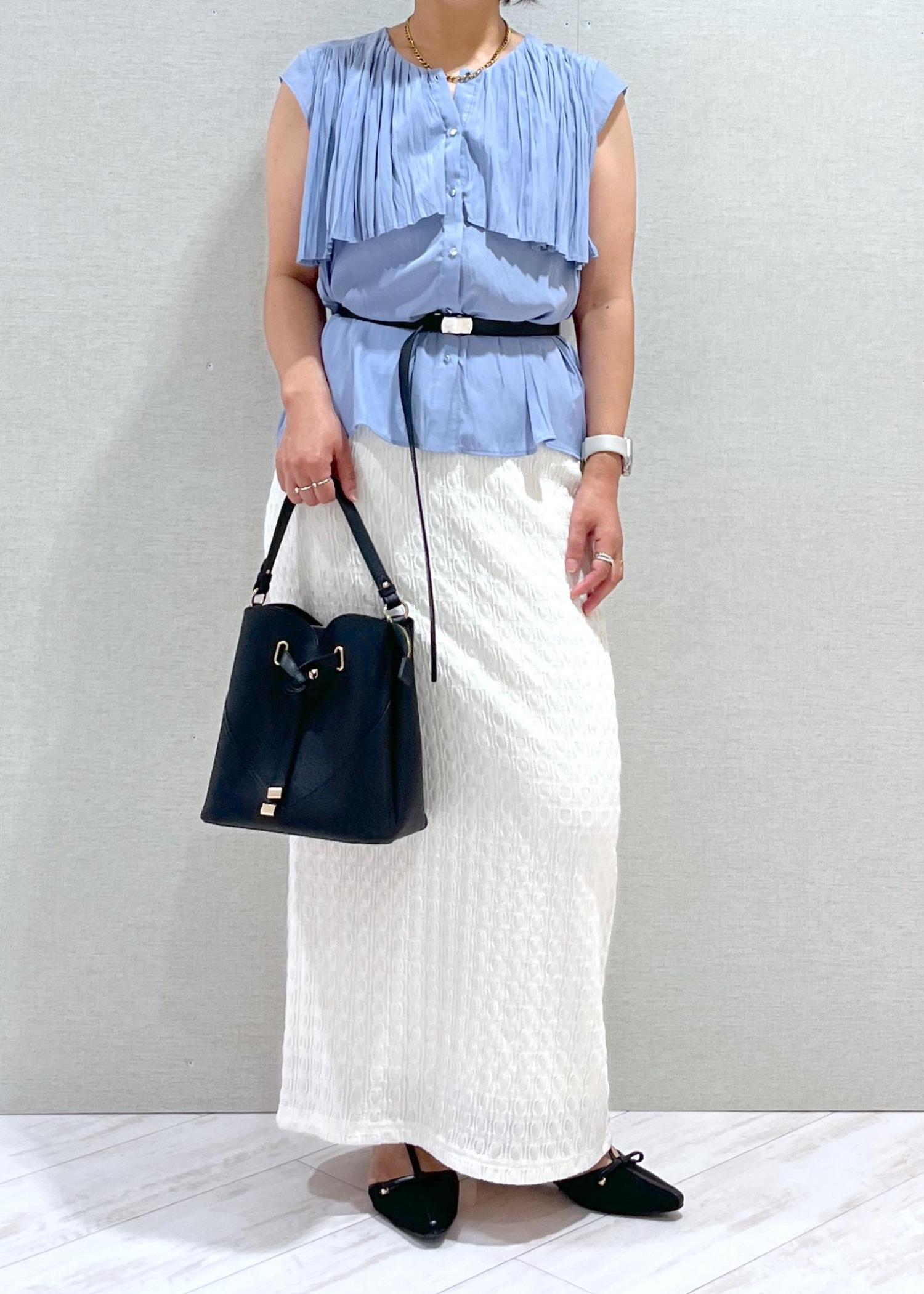 鮮やかなブルーのブラウスに爽やかに白のスカートを合わせました。