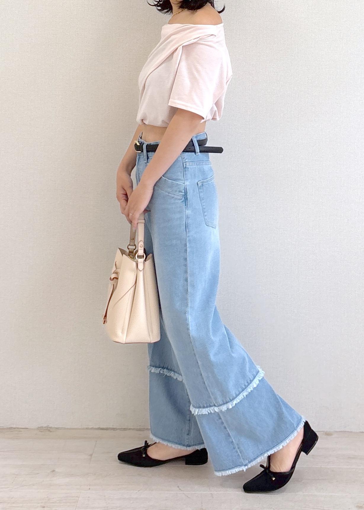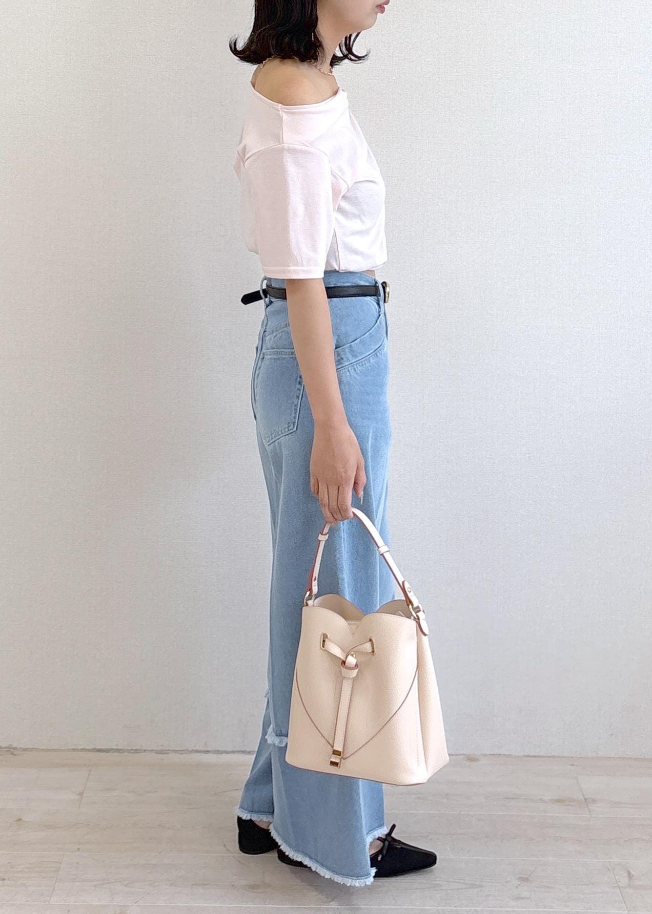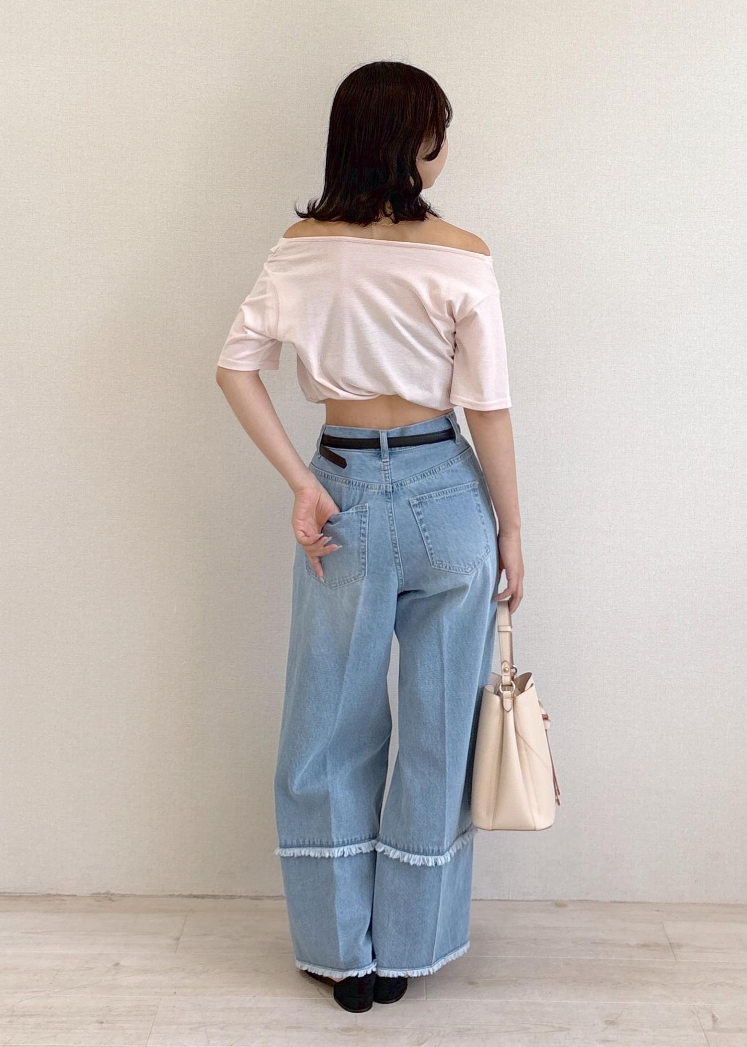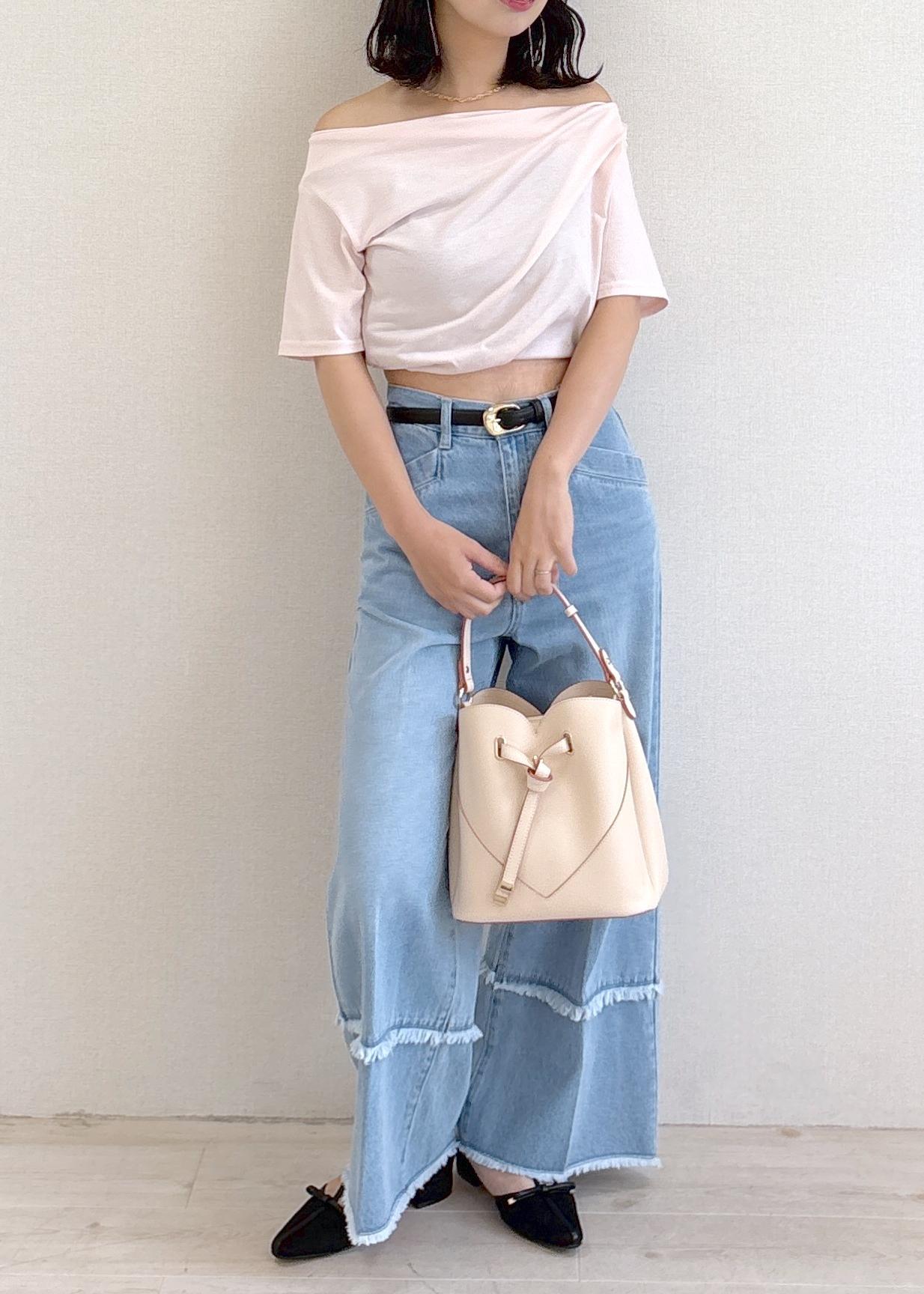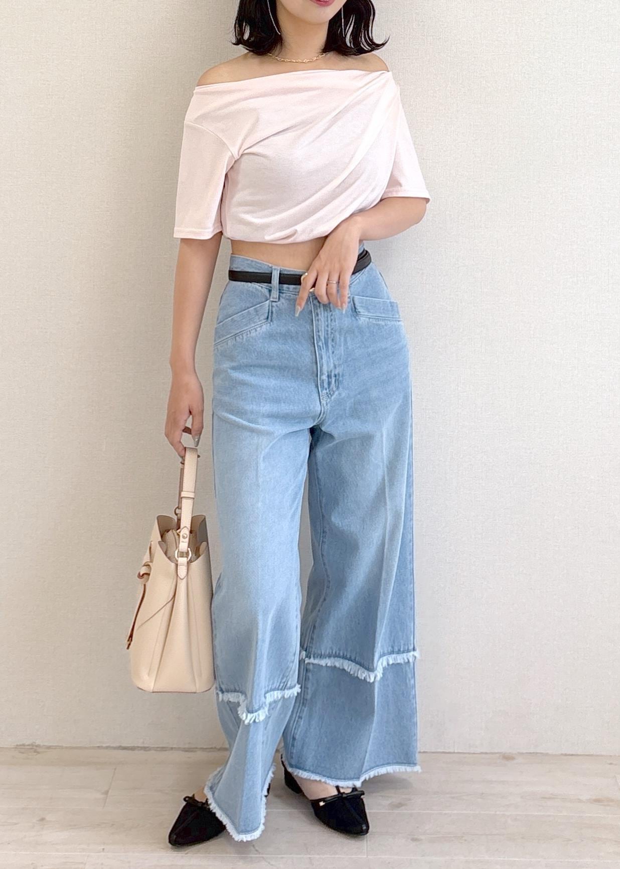 ドレープ素材のカットソーをワンショルダーにしてみたり、オフショルダーにしてみたり、ヘアゴムで裾を結んでクロップトップスにアレンジしてみたりと、アイデア次第で着こなしの幅が広がるのが面白いです♡