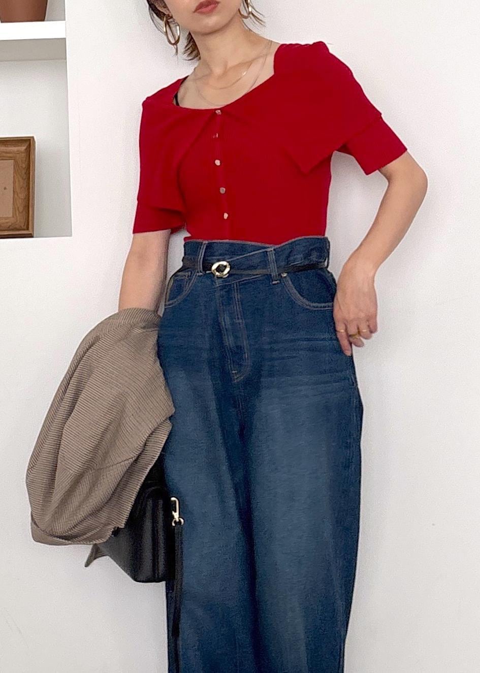 VISビックカラーオフショルハーフスリーブニットレッド / F¥2,963レビュービックカラーが特徴の大人可愛いニット♪とても柔らかいので、大きめな襟も優しく馴染むデザイン。オフショル風で肩にマチがあるので安心感とデコルテがとてもキレイに見え、一枚で女性らしい印象に◎全体的にほどよくフィット、着丈は腰が隠れるくらいの長さでインスタイルもしやすいです。