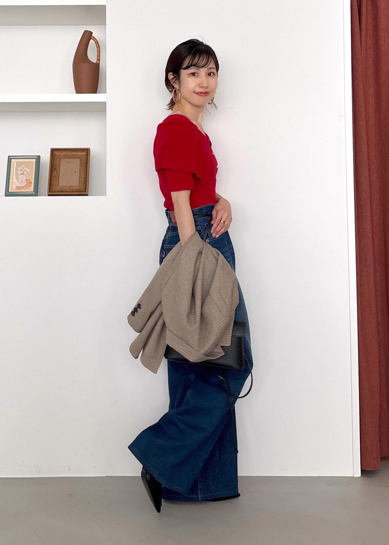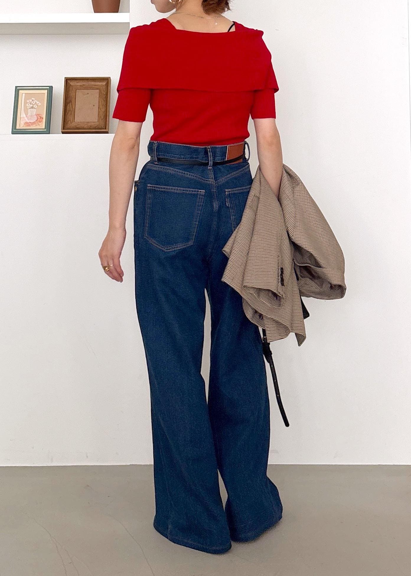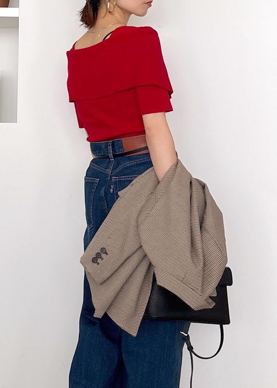 ビックカラーとオフショル風、着映え効果抜群のデザイントップスをポイントに、デニムでカジュアルダウンさせた大人カジュアルスタイル♪程よいフィット感のあるトップスなので、少し緩めなボトムと合わせるのが好み。まだ暑い日が続きますが、こちらはハーフ袖と肌あたりの良いリブ使いで今から着れます◎夏から少し秋らしさも欲しい方へオススメのスイッチコーデ。