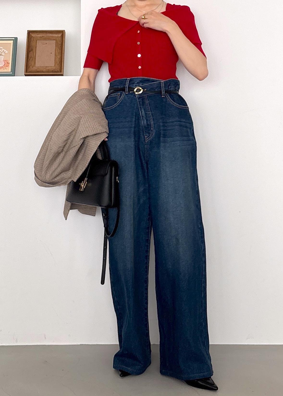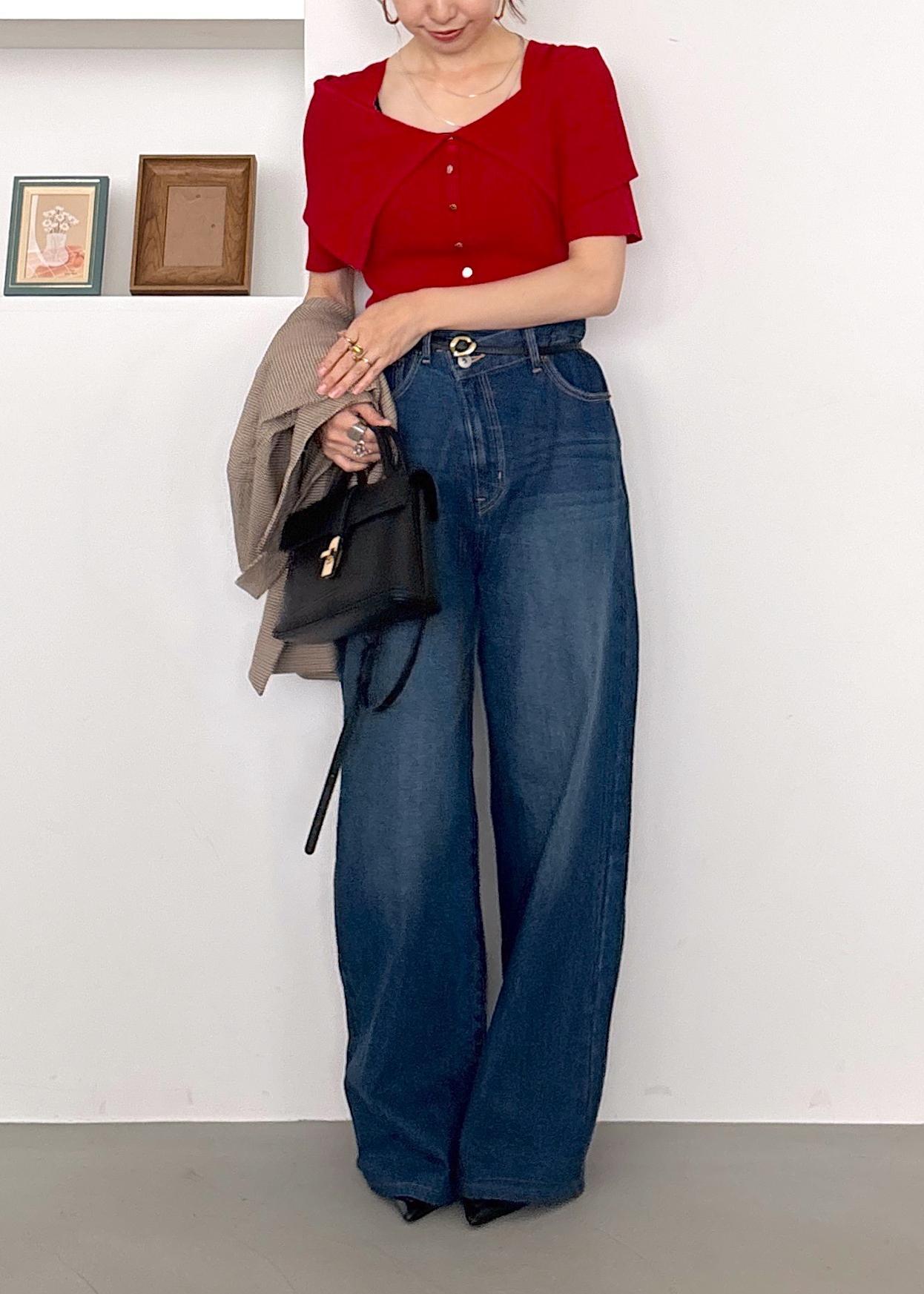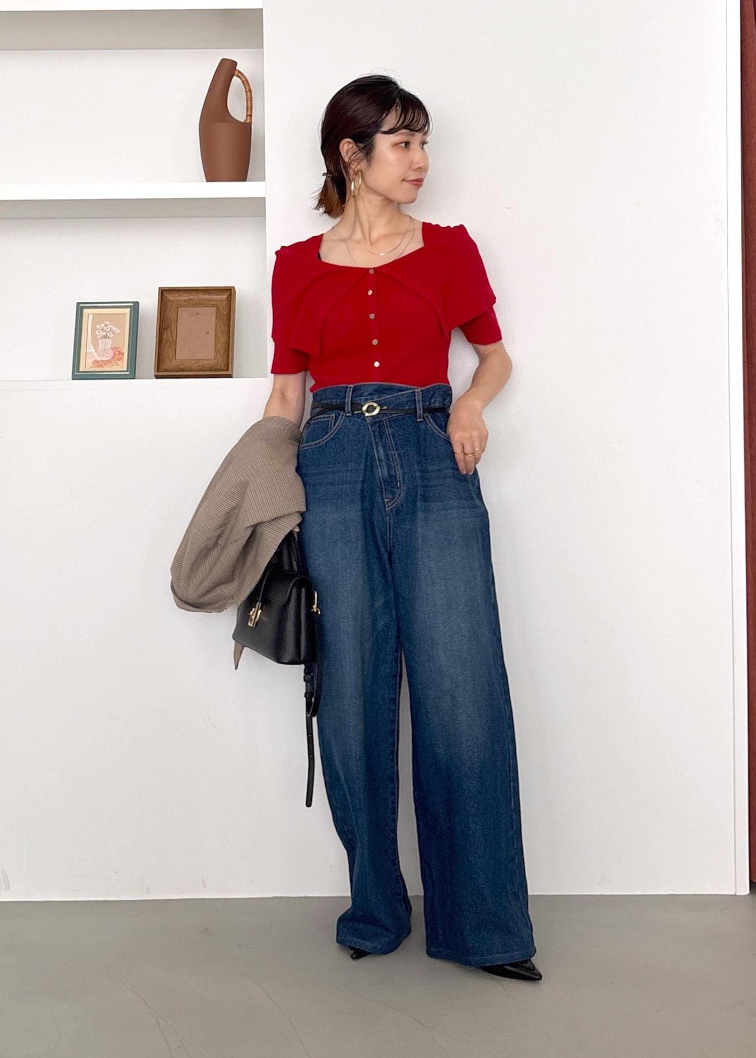 ビックカラーとオフショル風、着映え効果抜群のデザイントップスをポイントに、デニムでカジュアルダウンさせた大人カジュアルスタイル♪程よいフィット感のあるトップスなので、少し緩めなボトムと合わせるのが好み。まだ暑い日が続きますが、こちらはハーフ袖と肌あたりの良いリブ使いで今から着れます◎夏から少し秋らしさも欲しい方へオススメのスイッチコーデ。