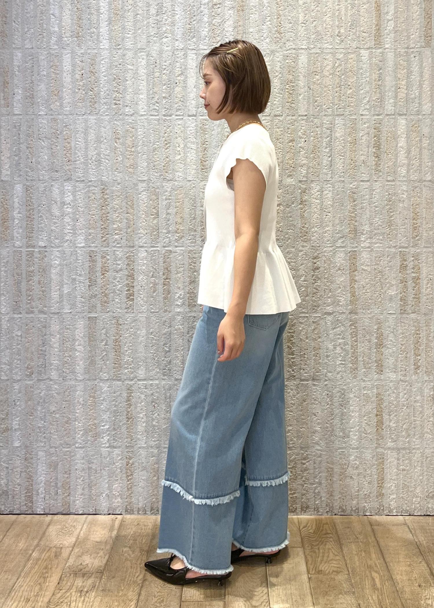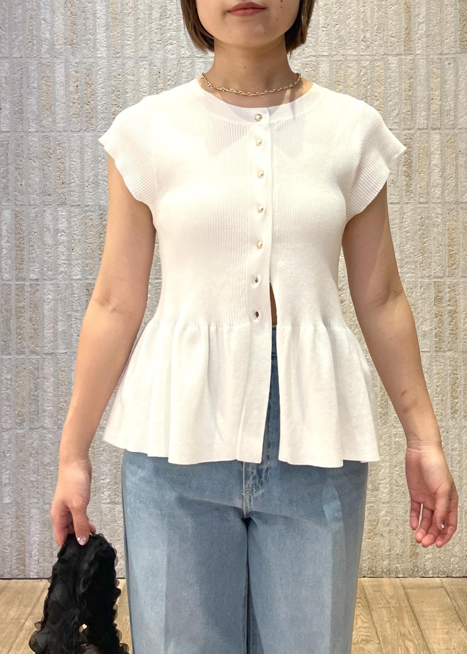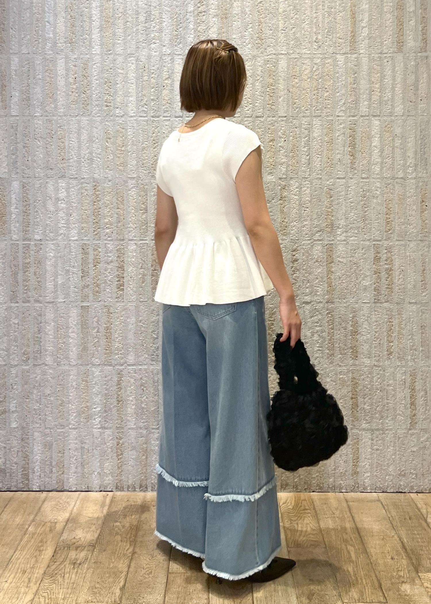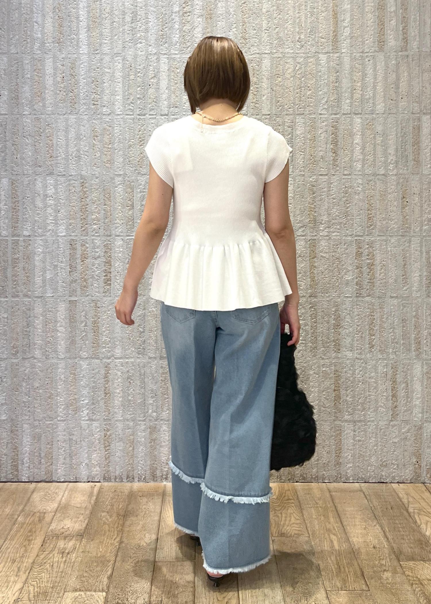 ホワイトのペプラムニットでフェミニンさを出しつつも、