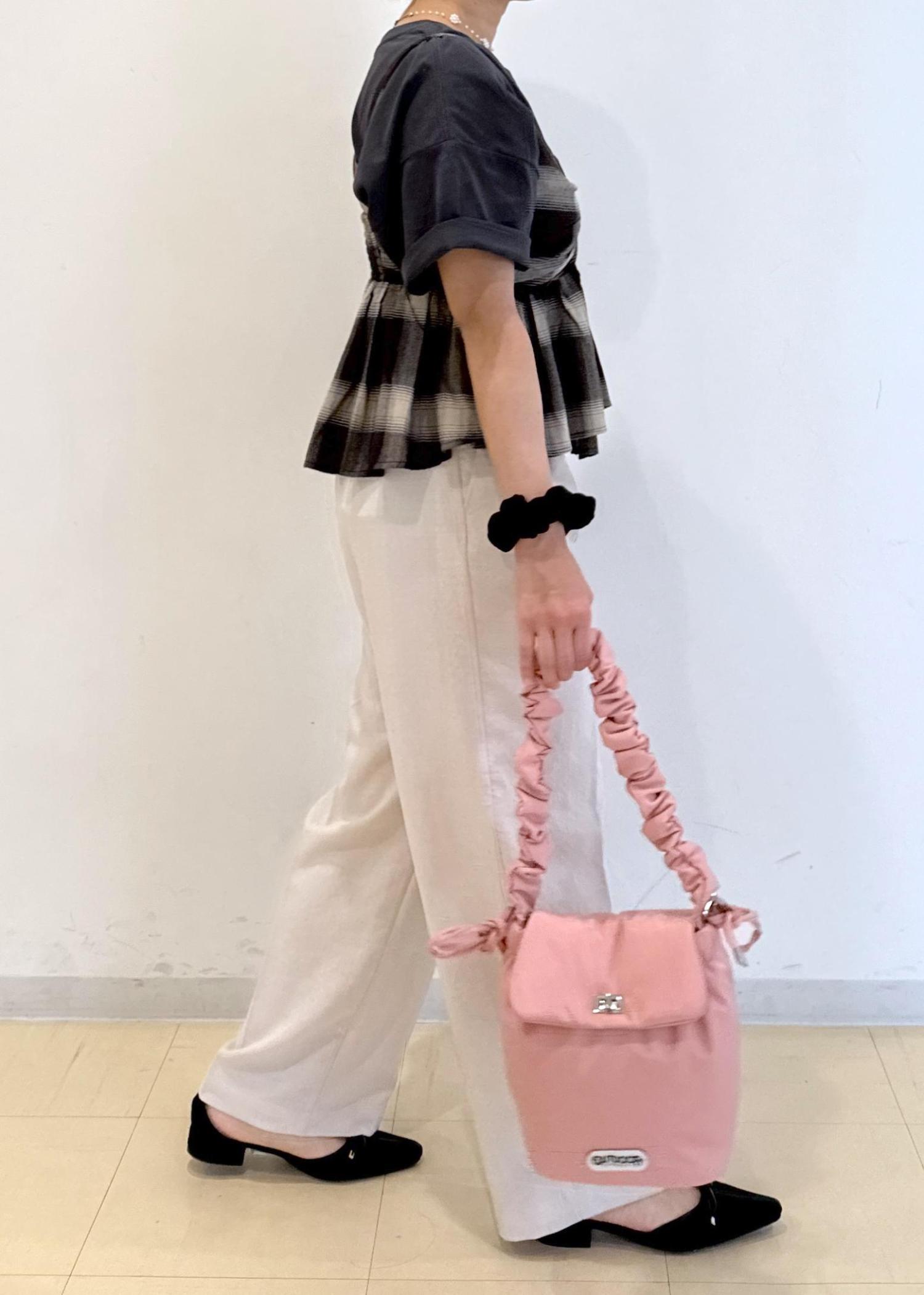 モノトーンで組み、パンツスタイルのかっこいい印象のコーディネートにリボンのビスチェやピンクで可愛らしさもプラスしました。