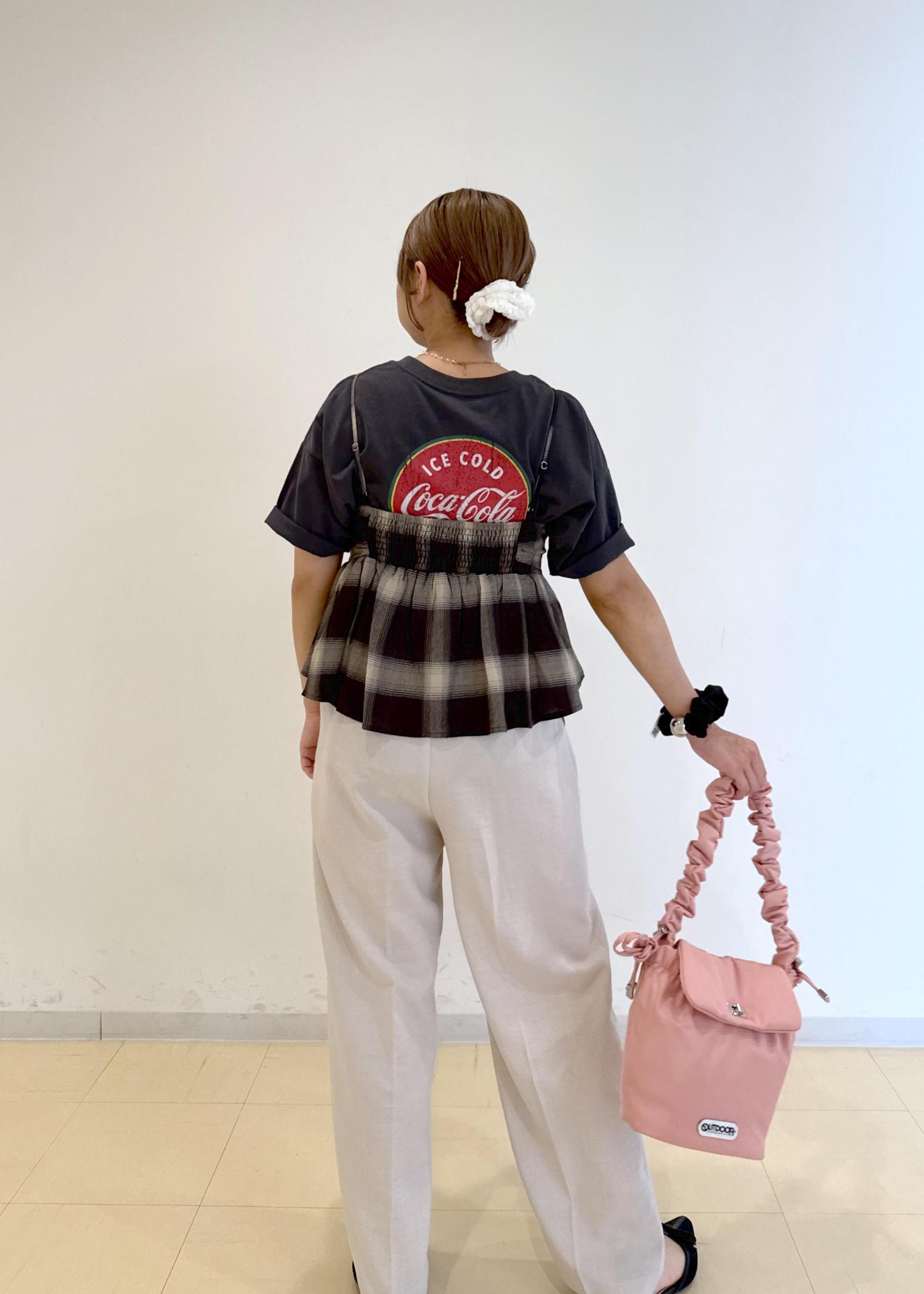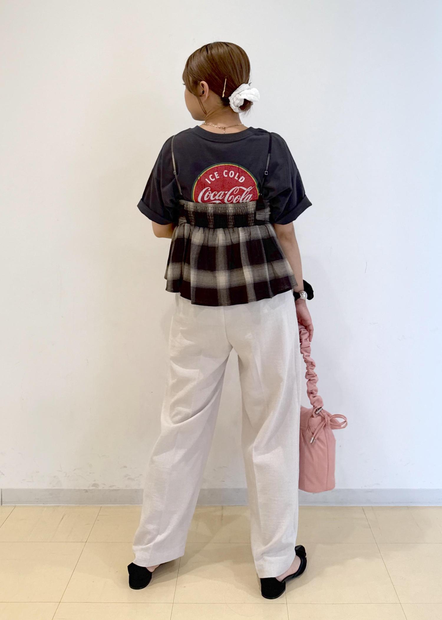 VISオンブレチェックリボンビスチェブラック系 / F¥5,489レビュー中にゆったりサイズのTシャツを着るとフィット感を感じるくらいのサイズ感です!