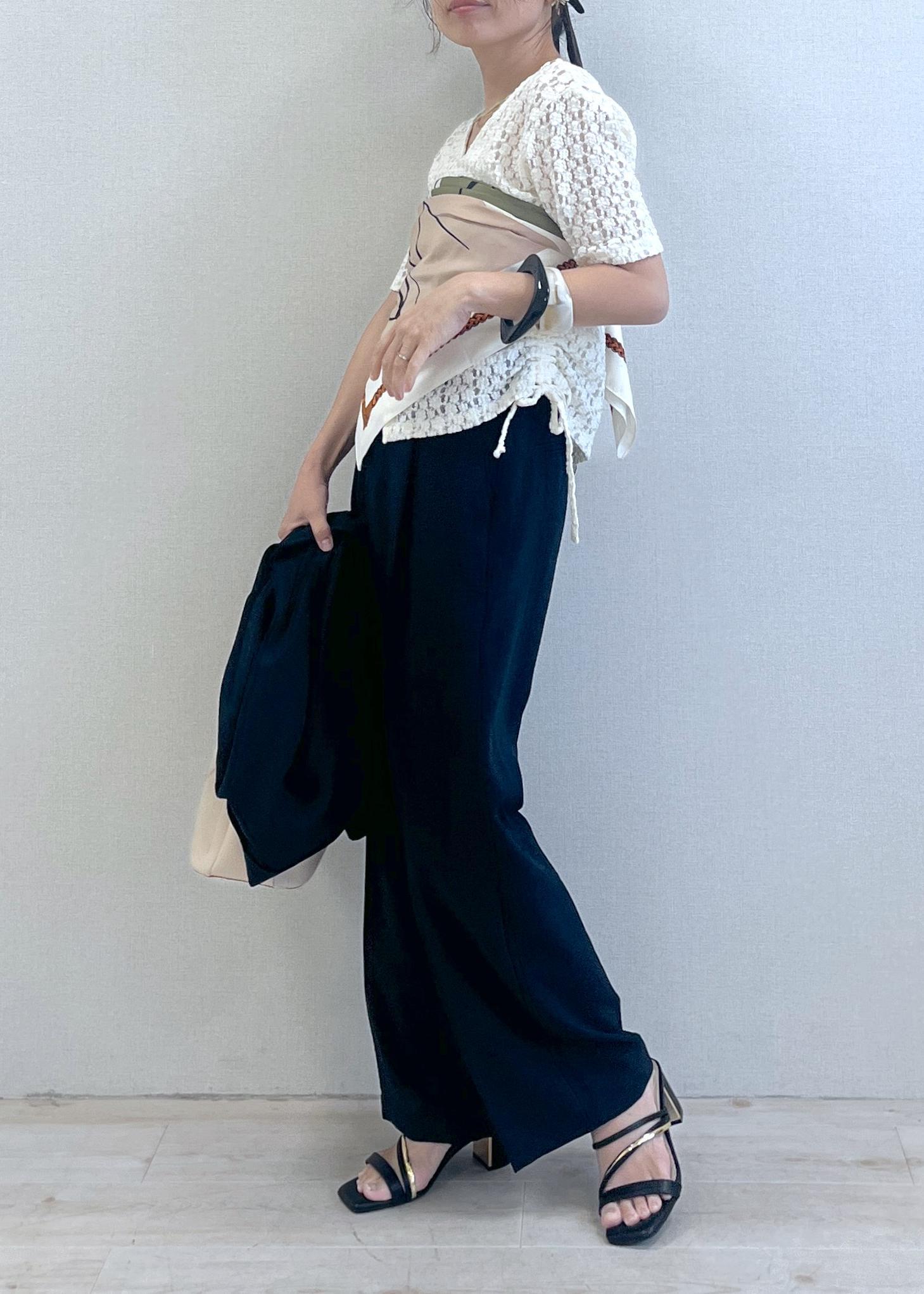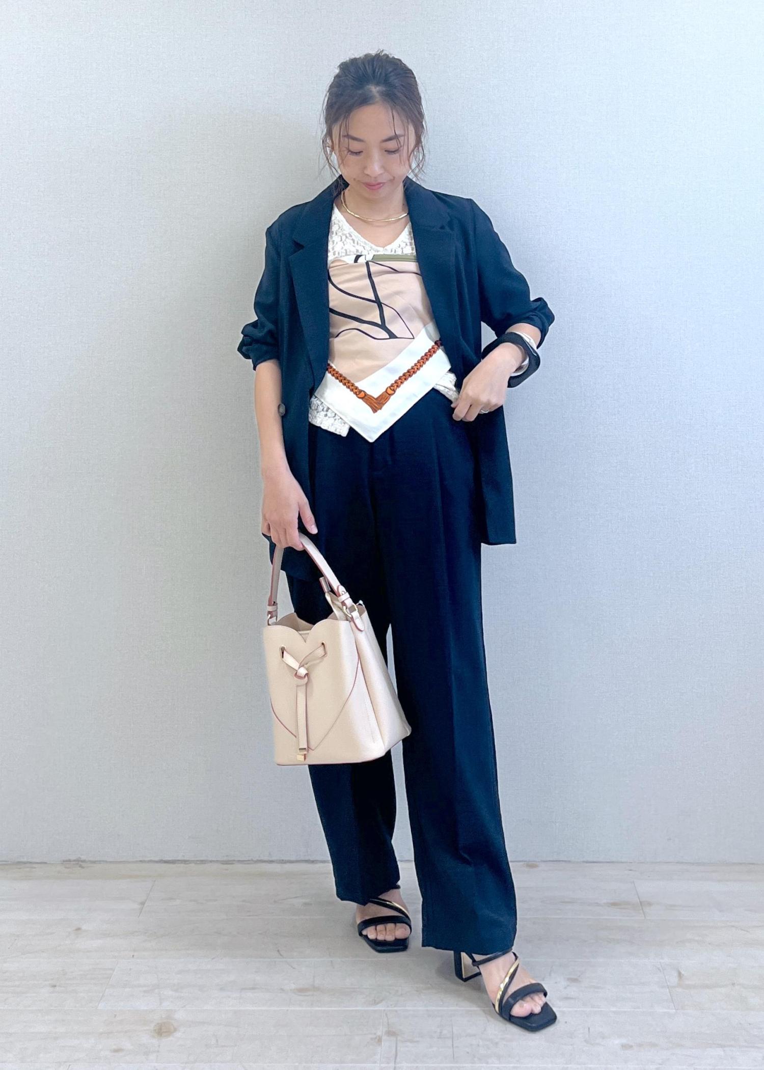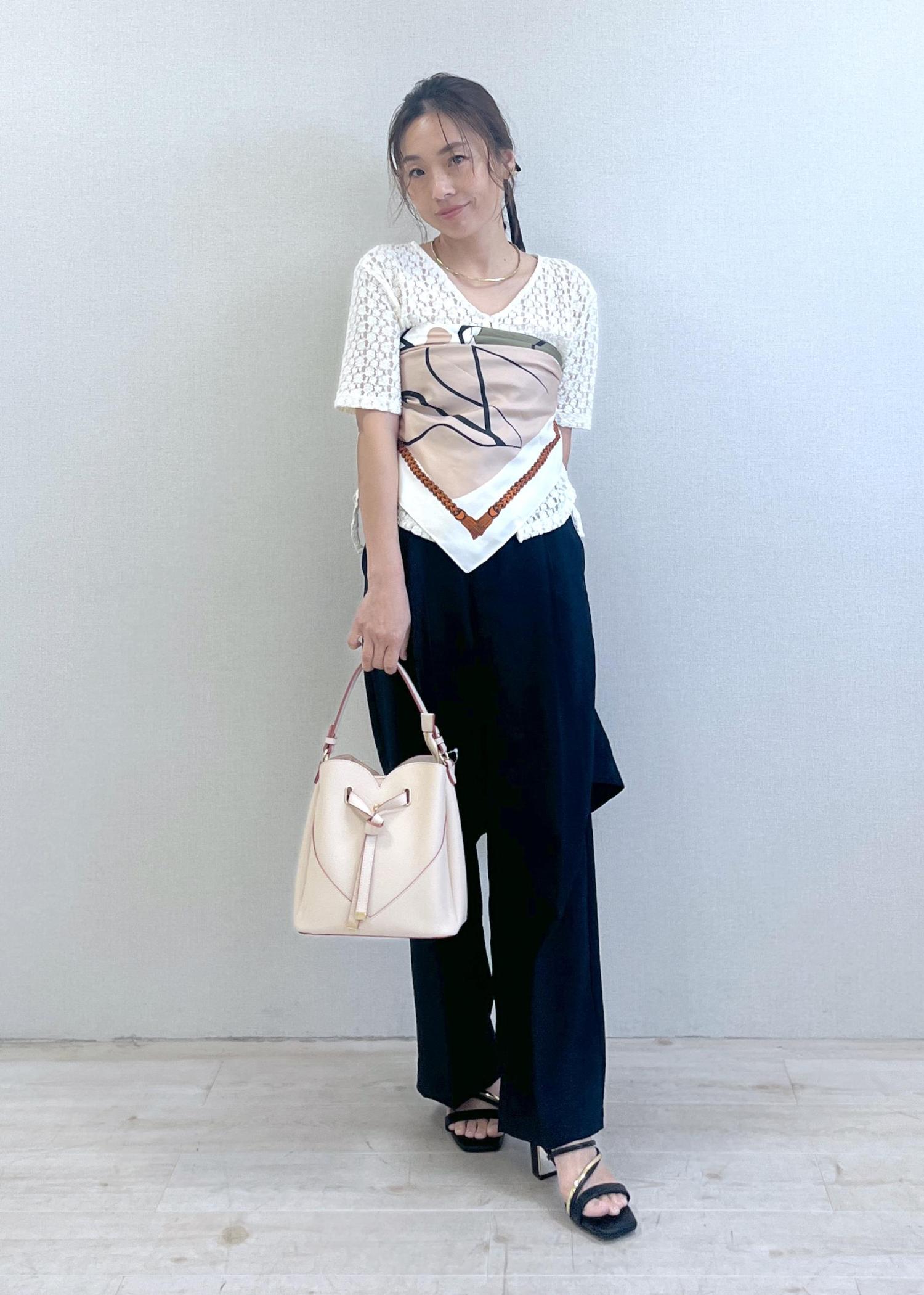 スカーフを主役にしたきれいめパンツスタイル。シンプルなパンツも一気に華やぎ、女っぽさを引き立ててくれる着こなしに。ベージュ小物を添えて、やわらかさと上品さをプラスしました。もちろんジャケットを羽織っても◎