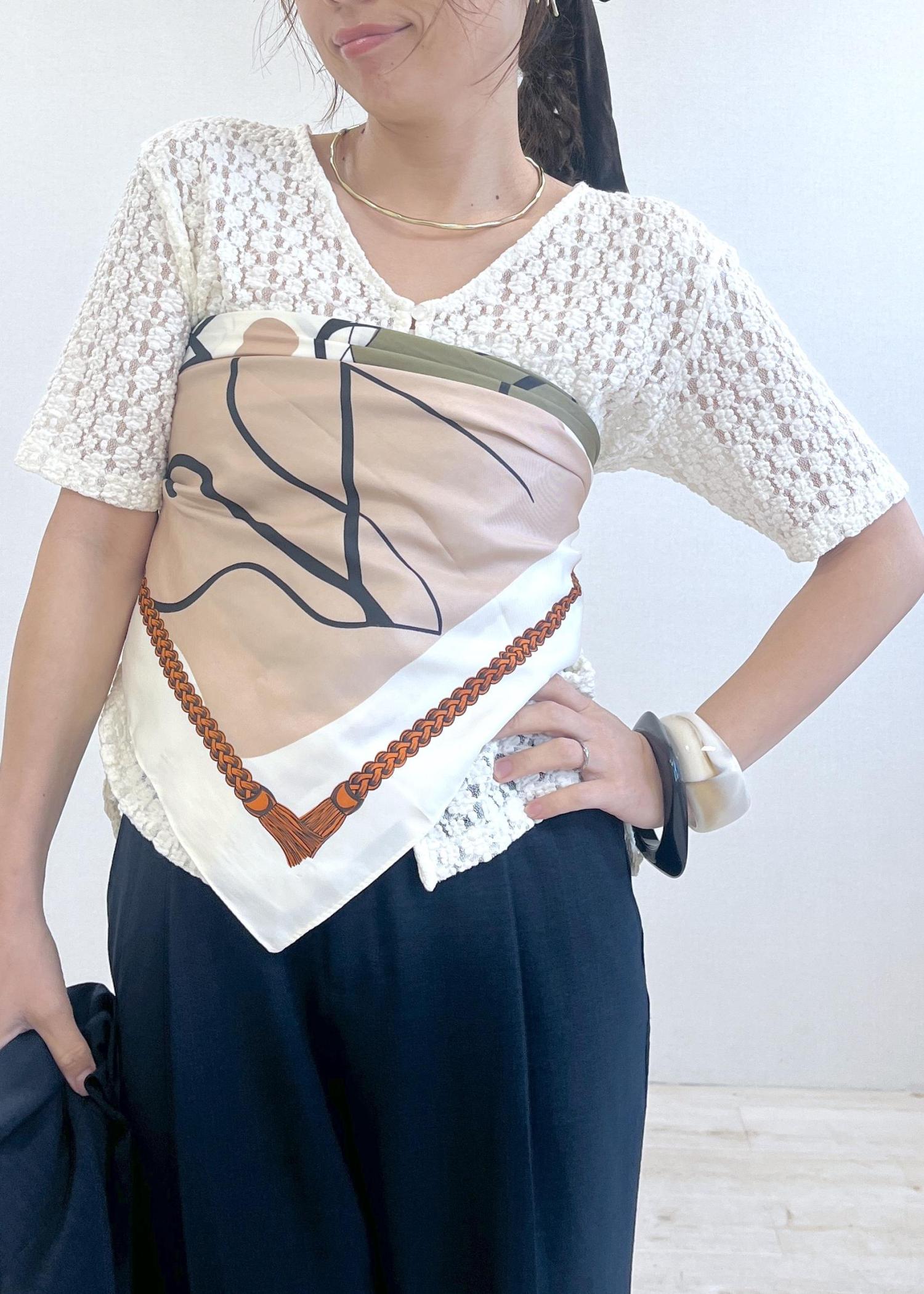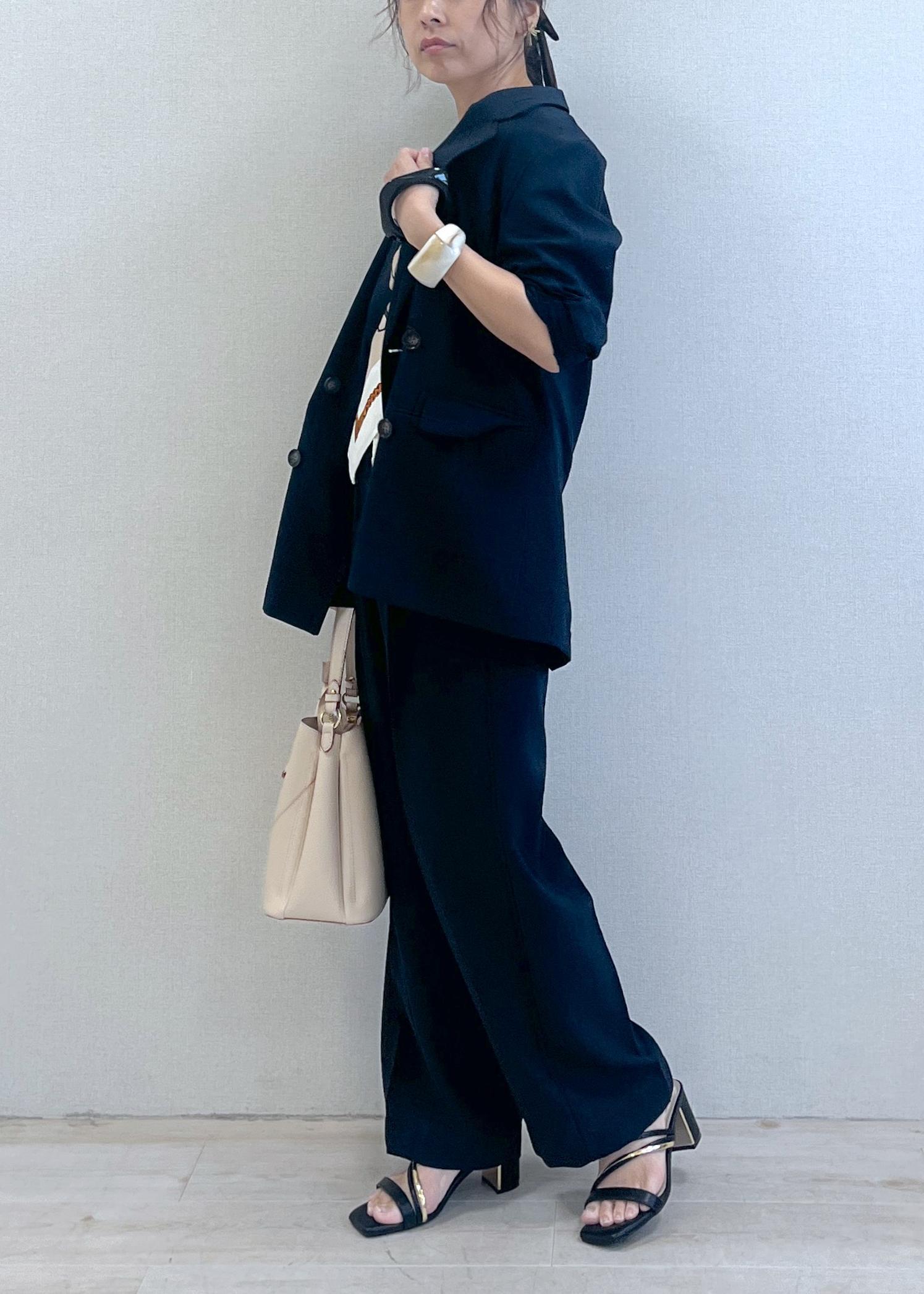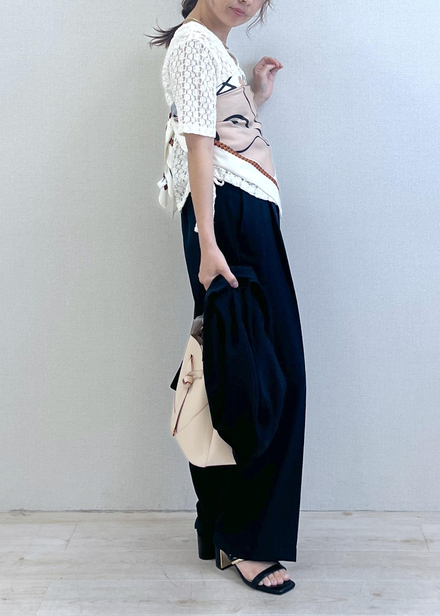 スカーフを主役にしたきれいめパンツスタイル。シンプルなパンツも一気に華やぎ、女っぽさを引き立ててくれる着こなしに。ベージュ小物を添えて、やわらかさと上品さをプラスしました。もちろんジャケットを羽織っても◎