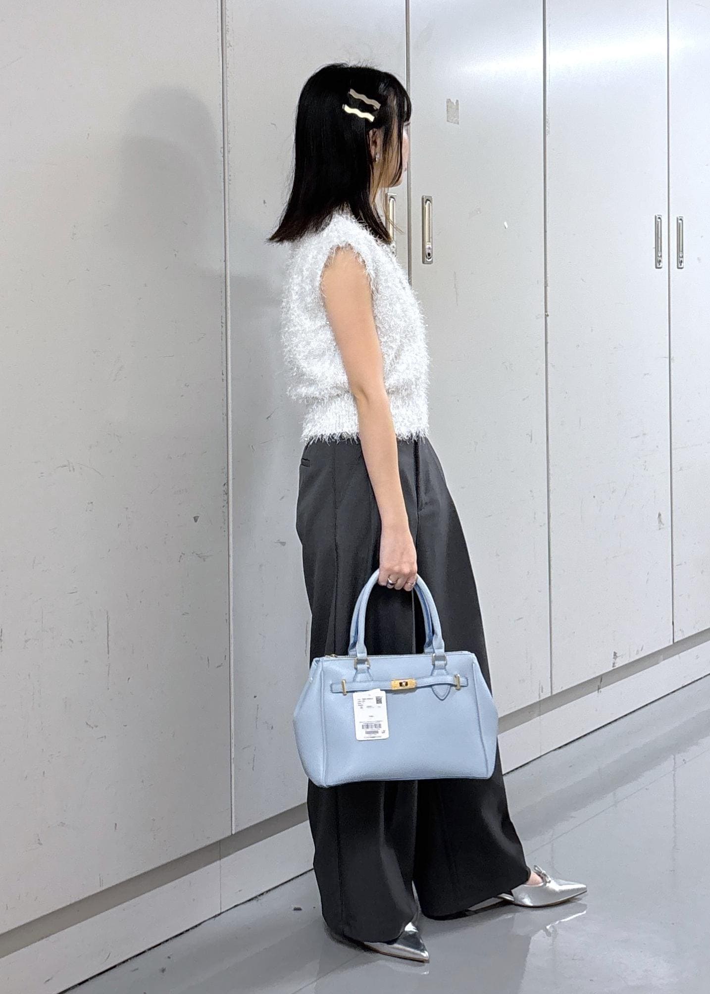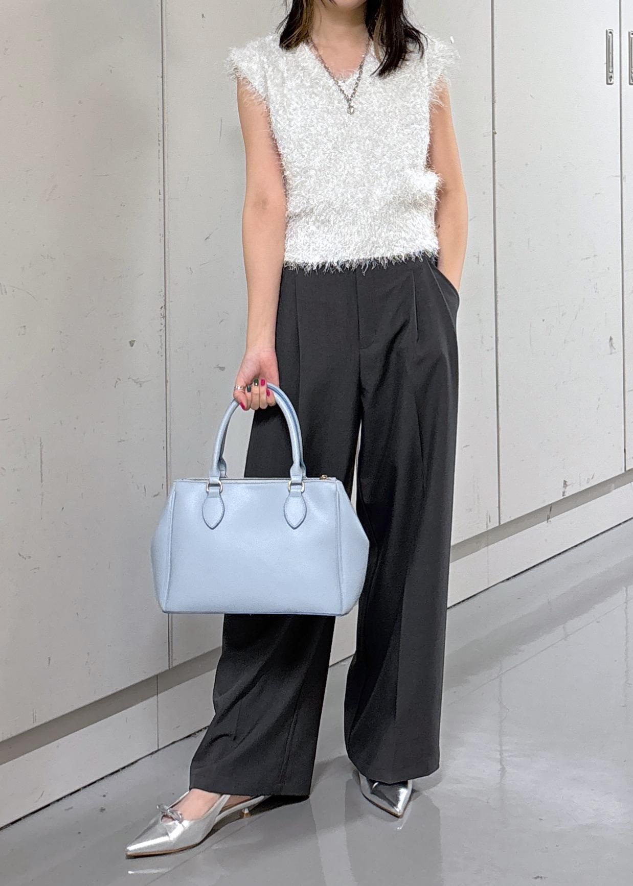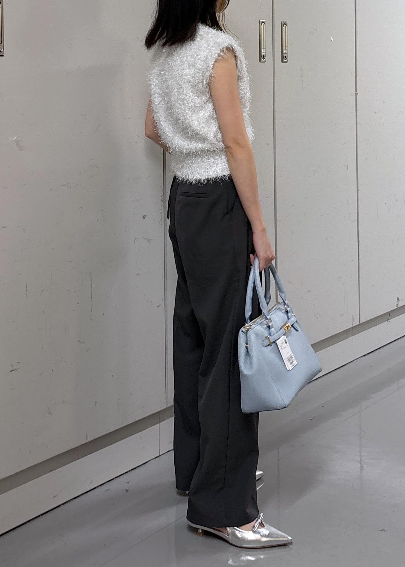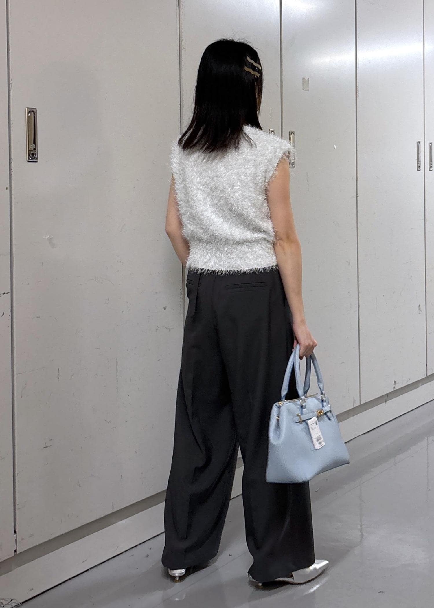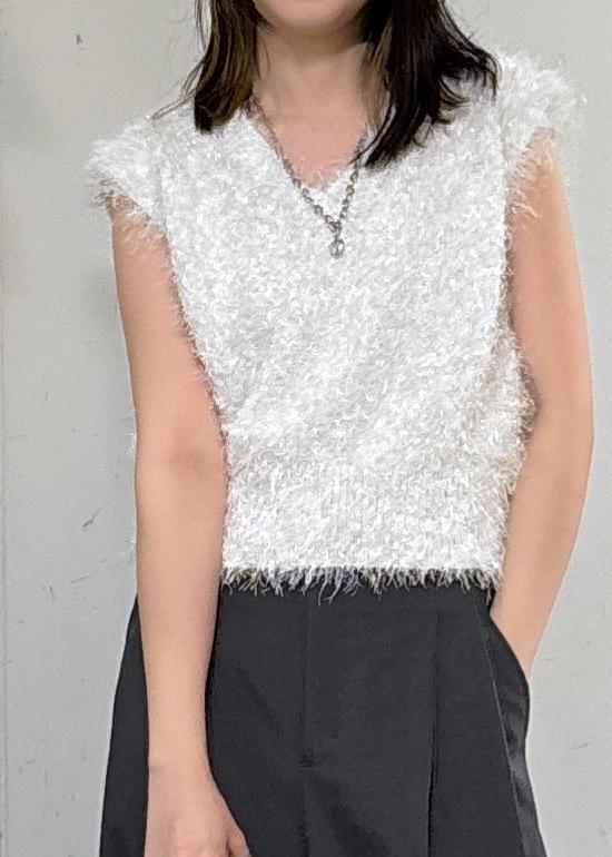 シルバーのラメ糸とグレー寄りのホワイトの毛足長めモケモケニットは、グレーやシルバーのアイテムと相性抜群ですね✨