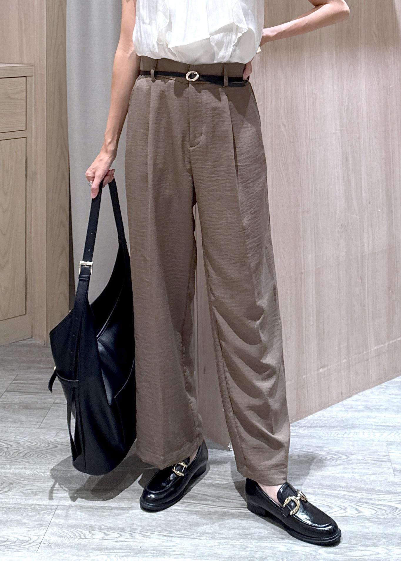 ホワイト系のボウタイブラウスにブラウン味のあるカーキパンツを合わせて、晩夏のお仕事コーデにしました。