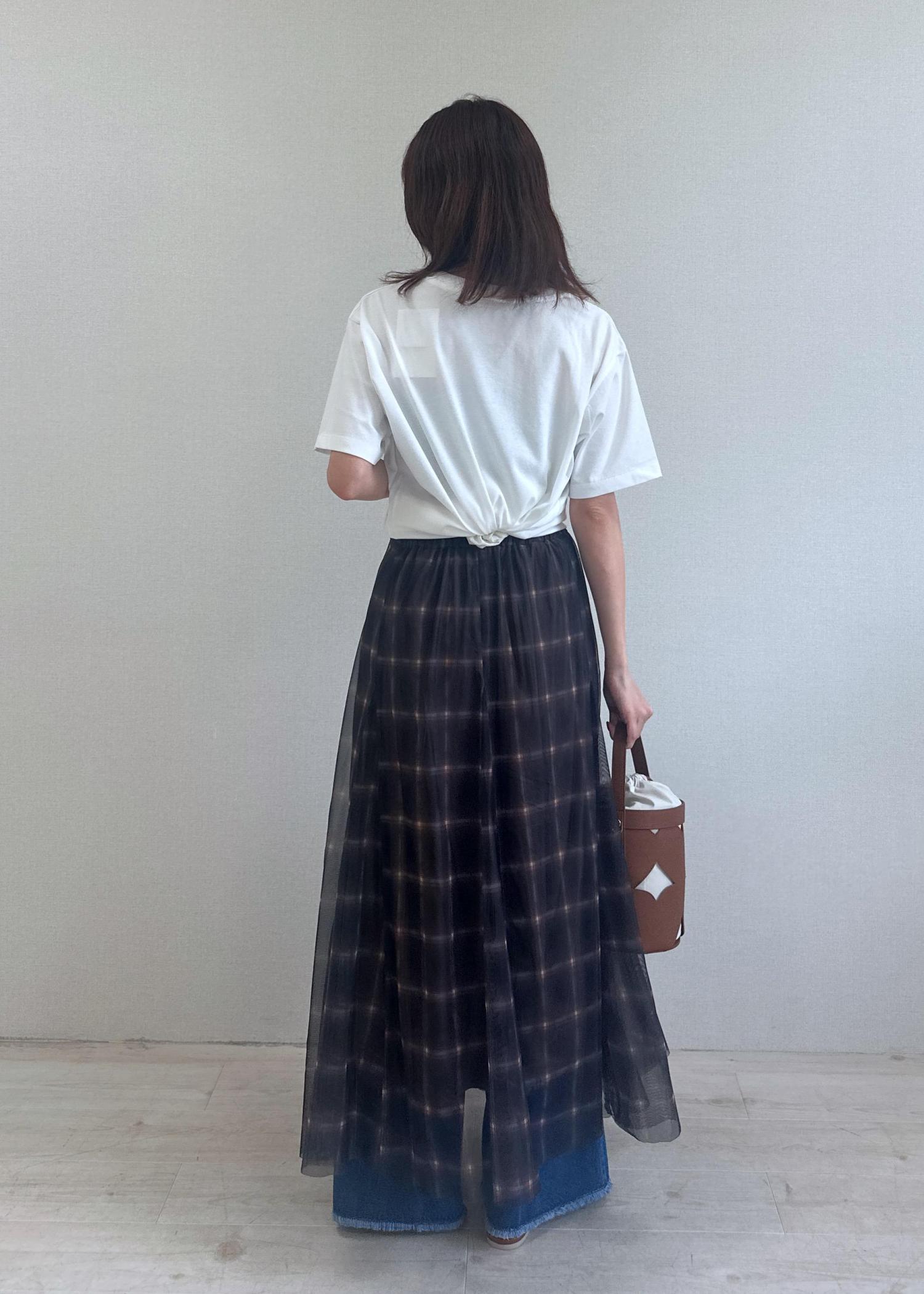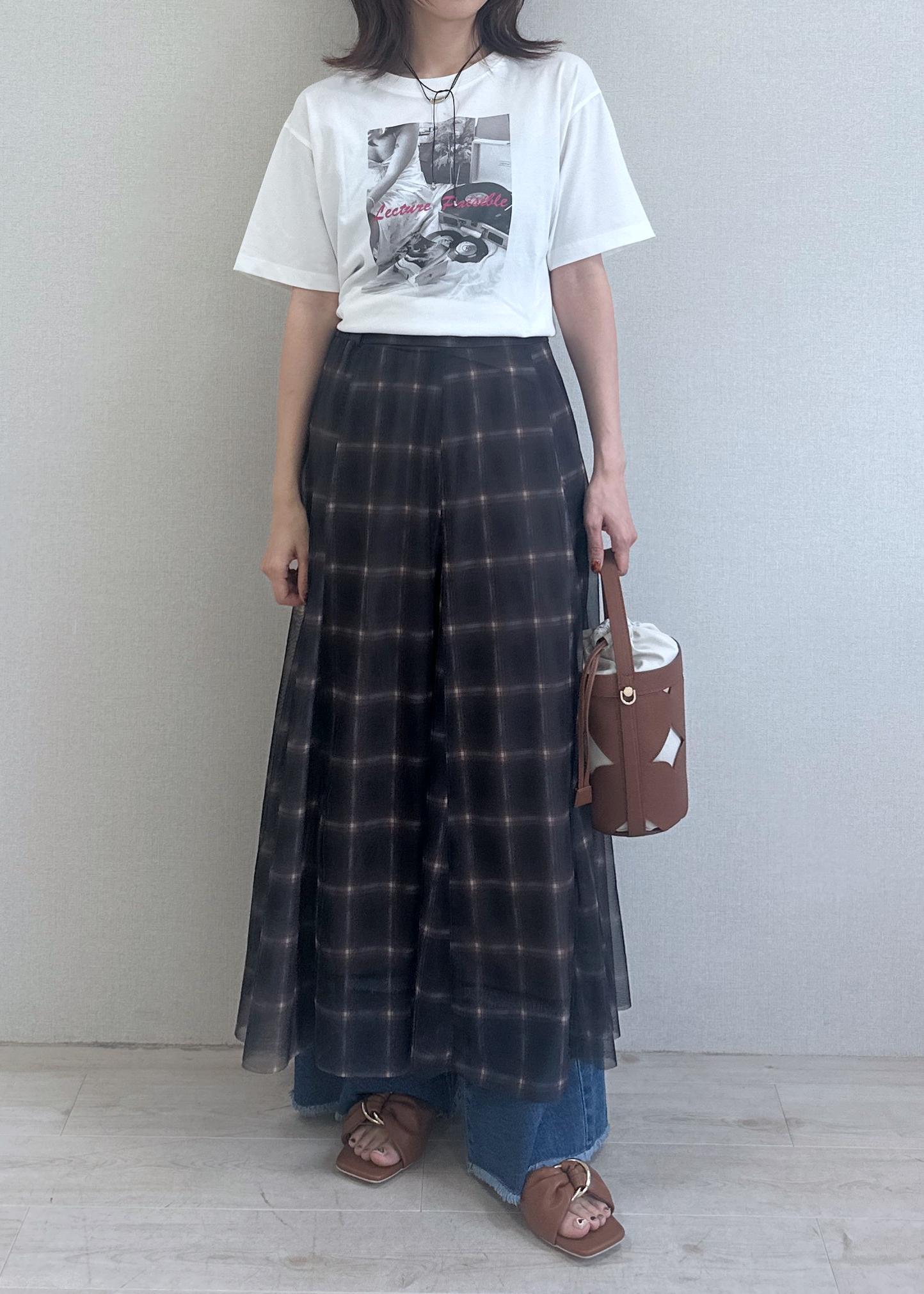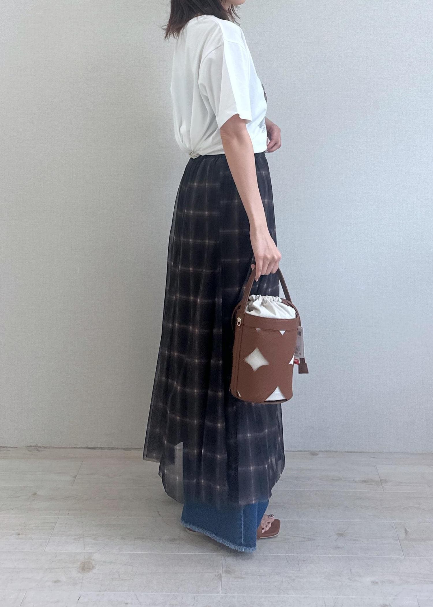 VIS【洗える】チュールプリントチェックスカートダークブラウン系 / F¥4,612レビュー162cmで足首が見えるぐらいの長さでした。