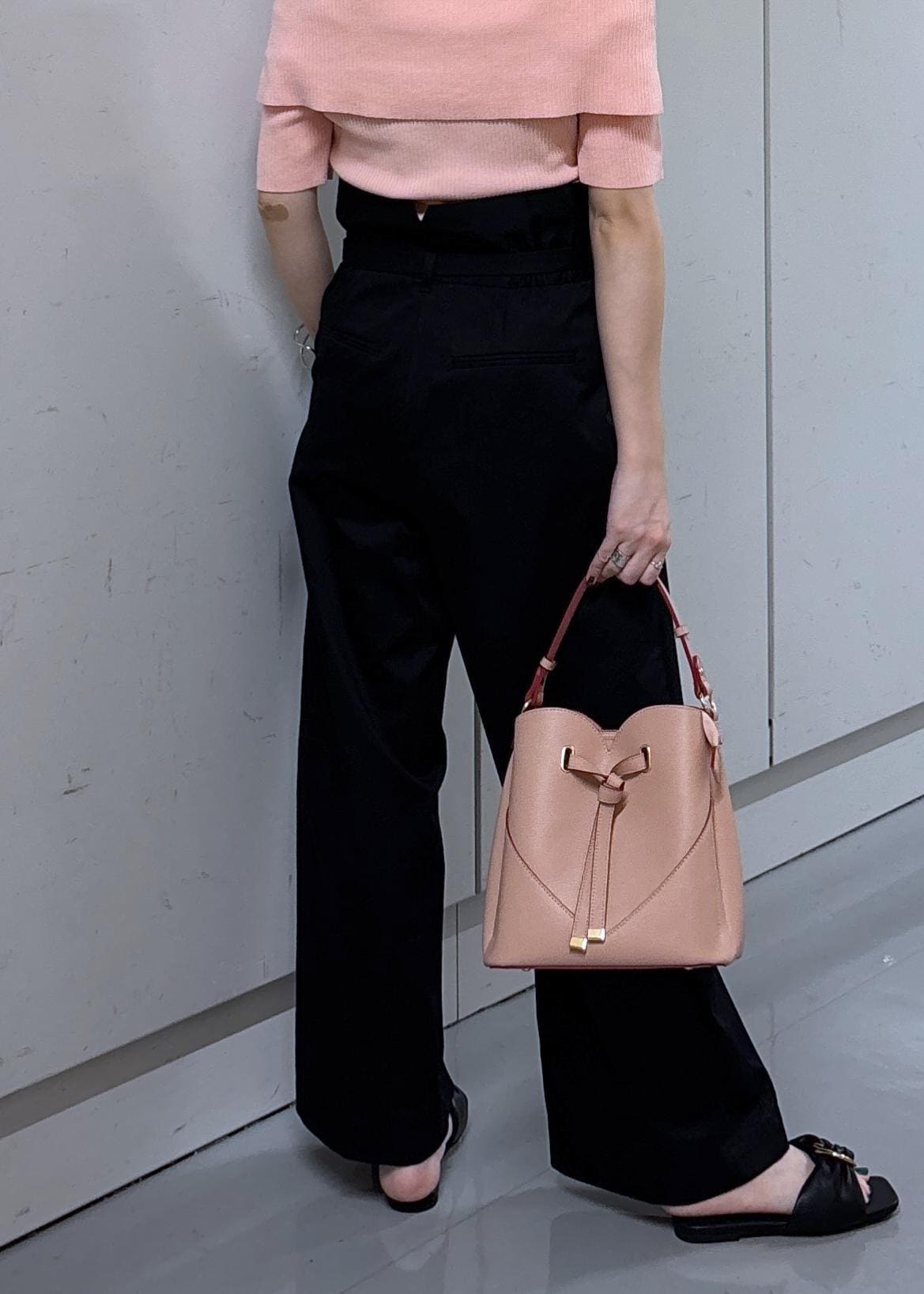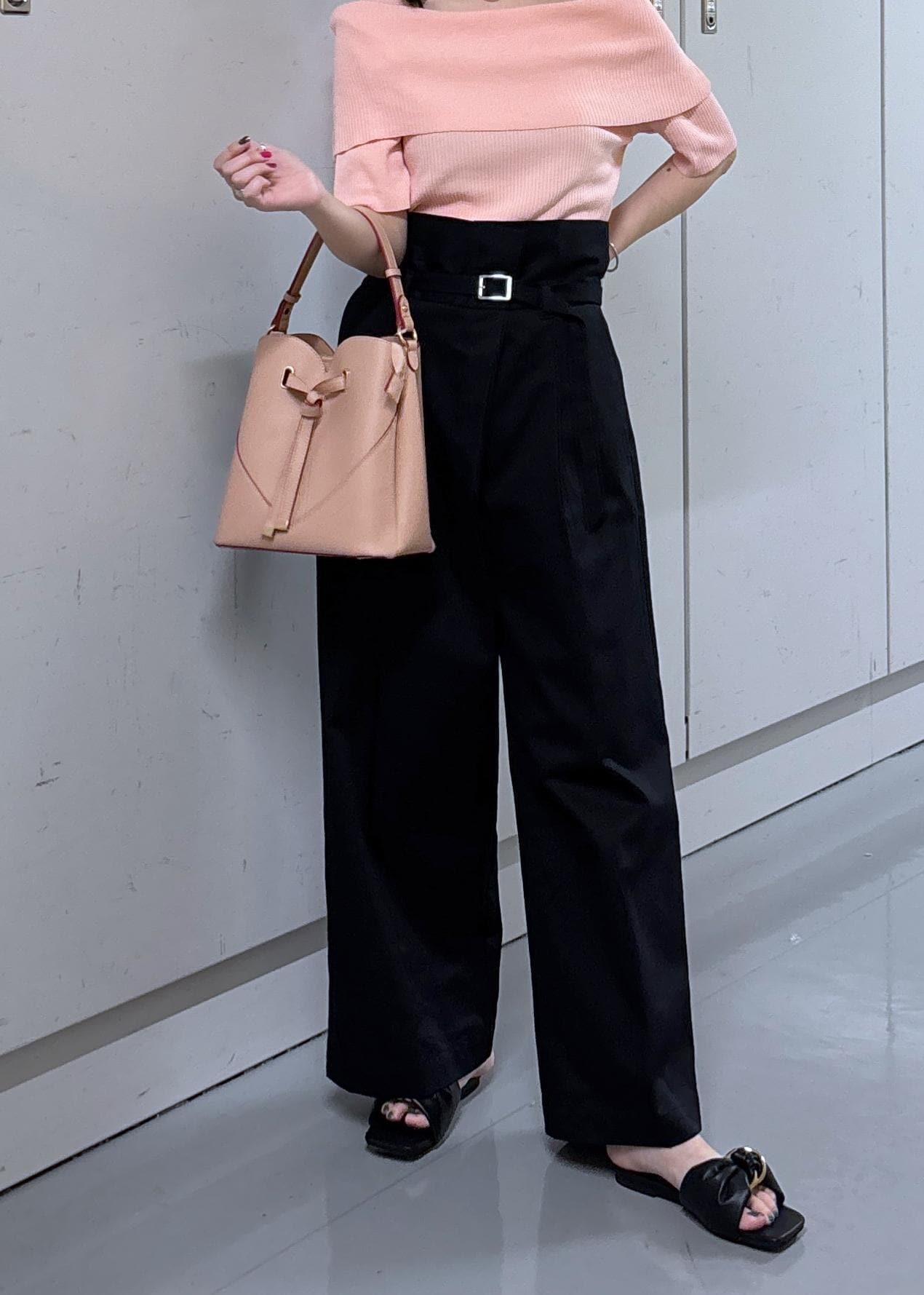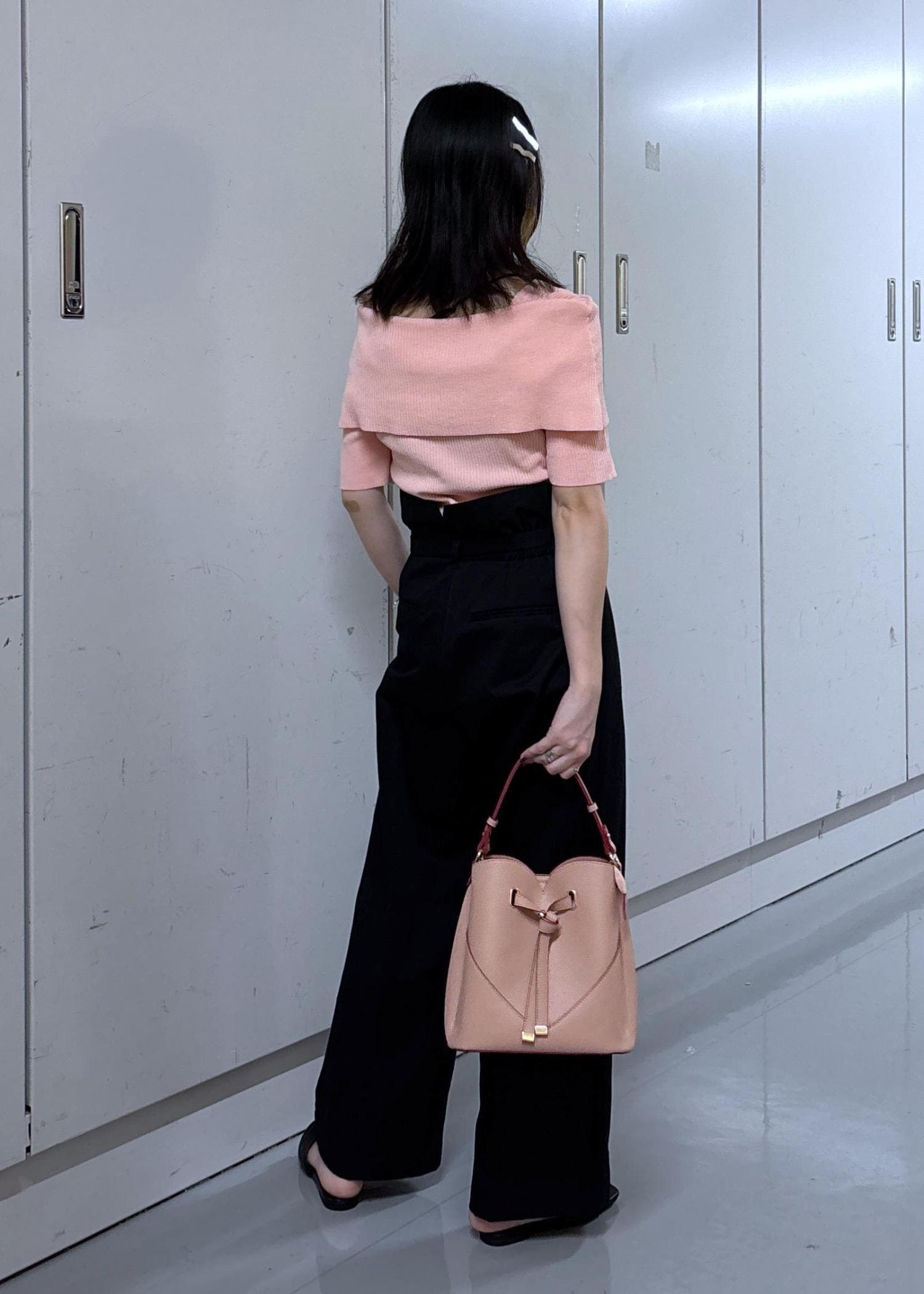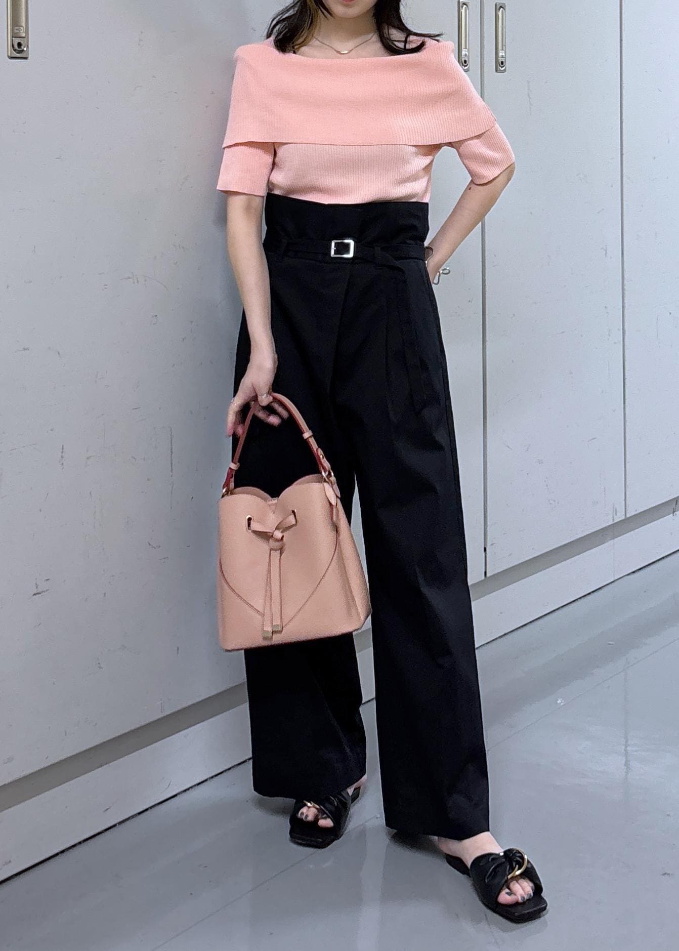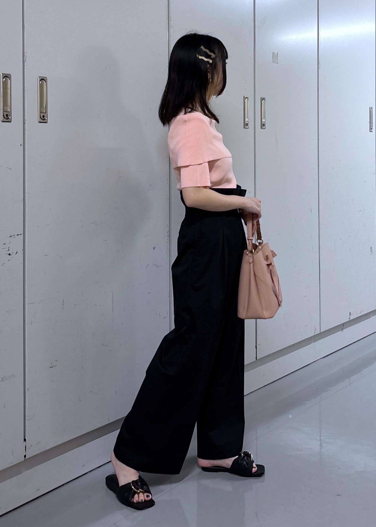 合わせたパンツは素材感がしっかりしていて少し太めなので、程よくカジュアルさも加わり甘すぎません◎