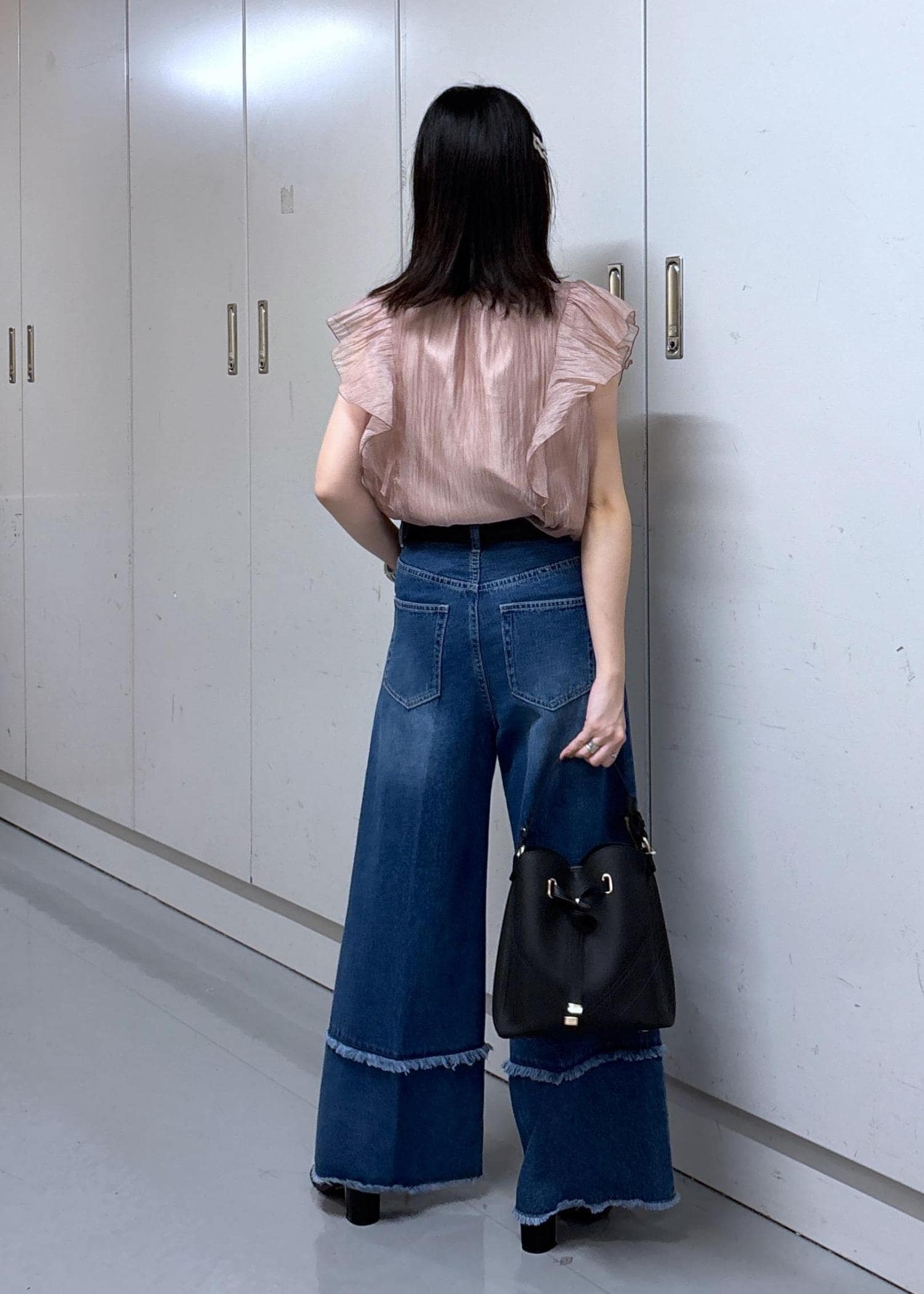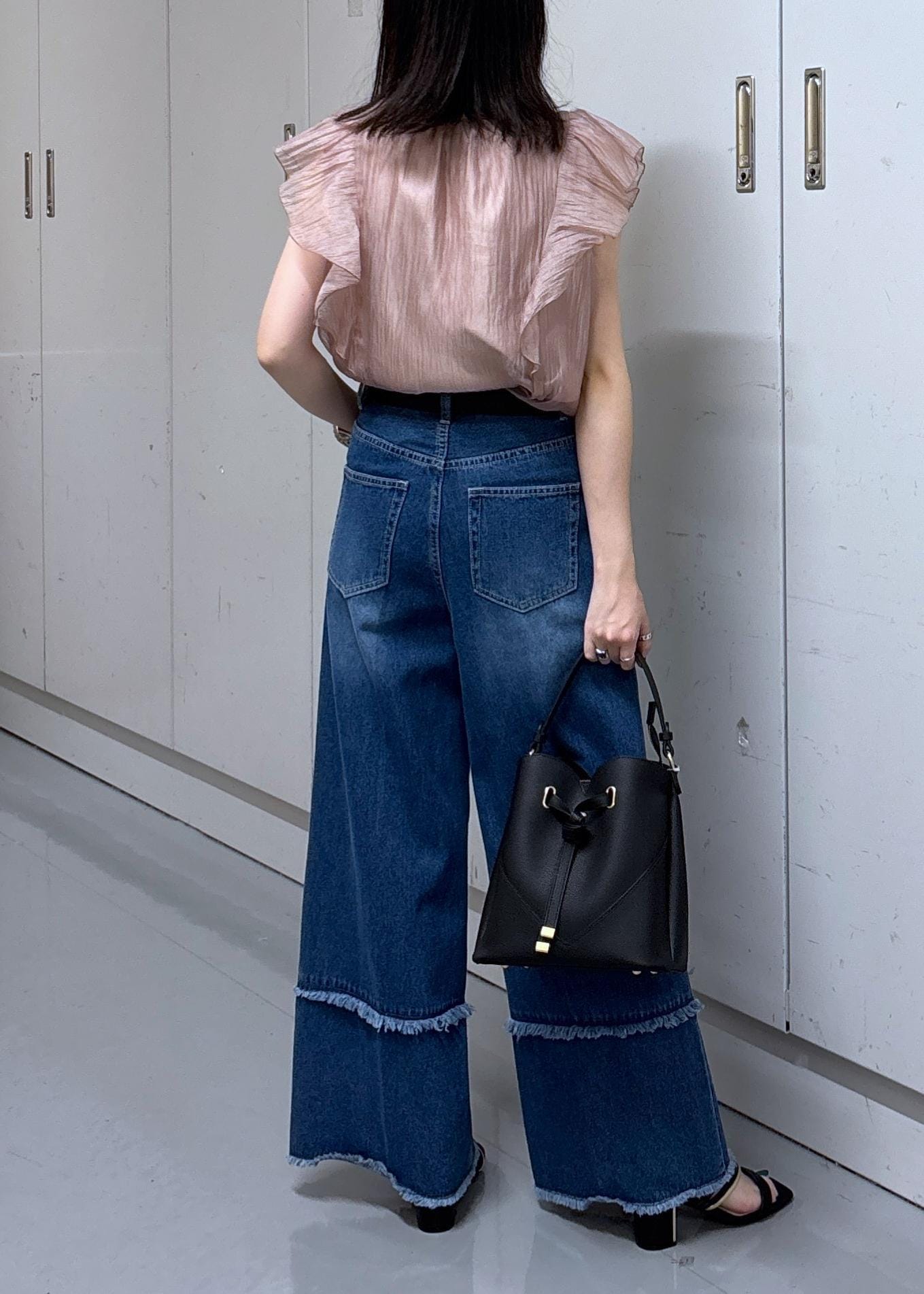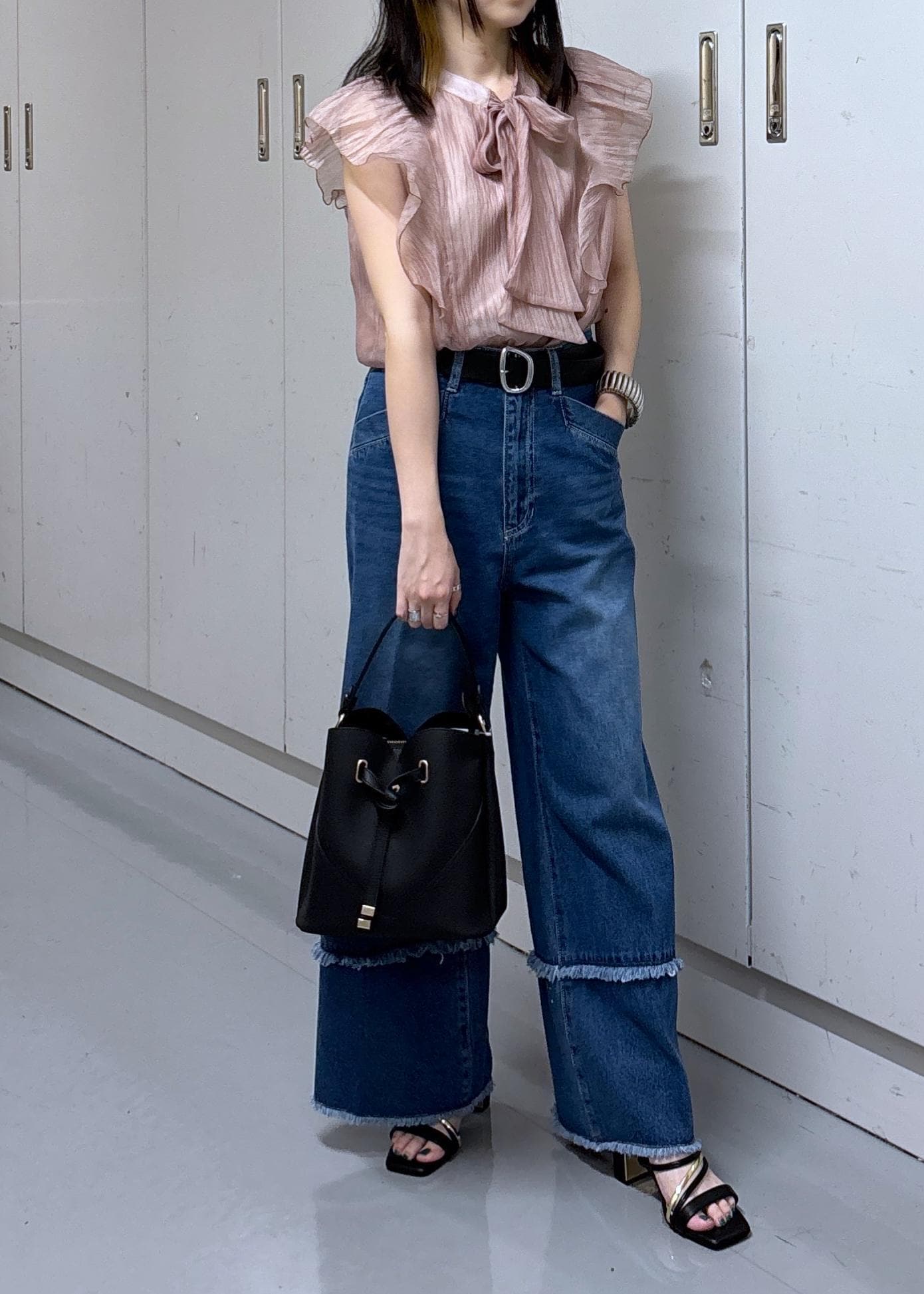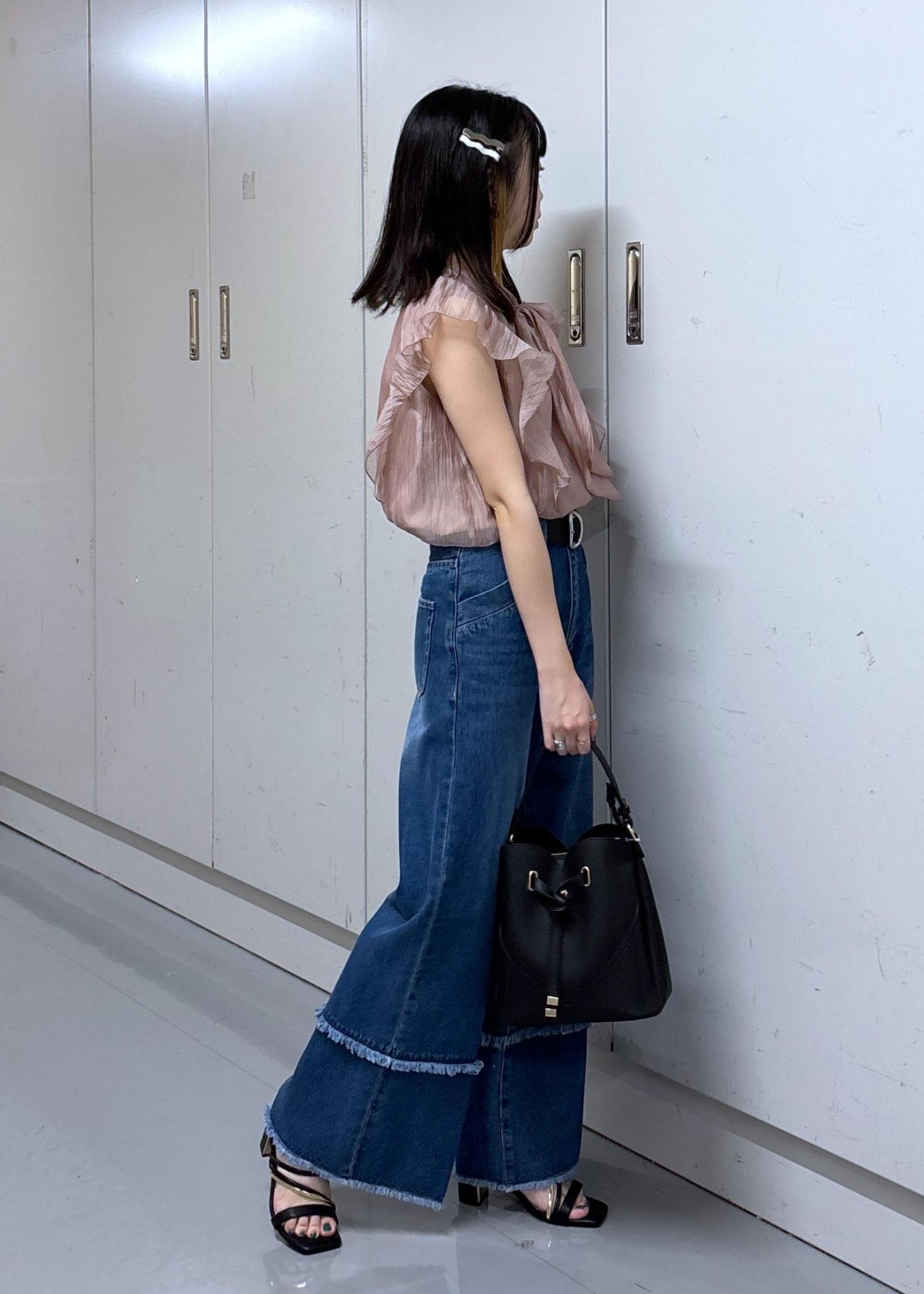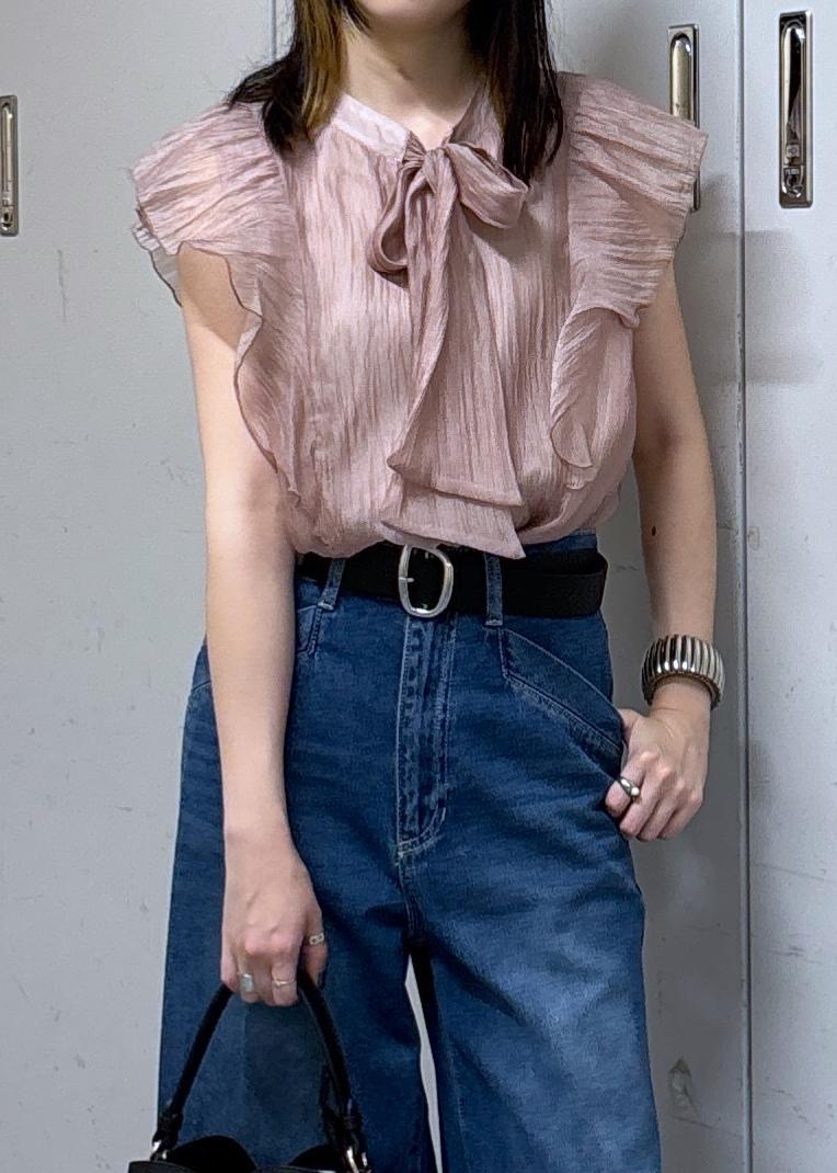 甘い印象が強いリボンブラウスですが、ワイドデニムと太めベルトを合わせてカジュアルなコーディネートに♩