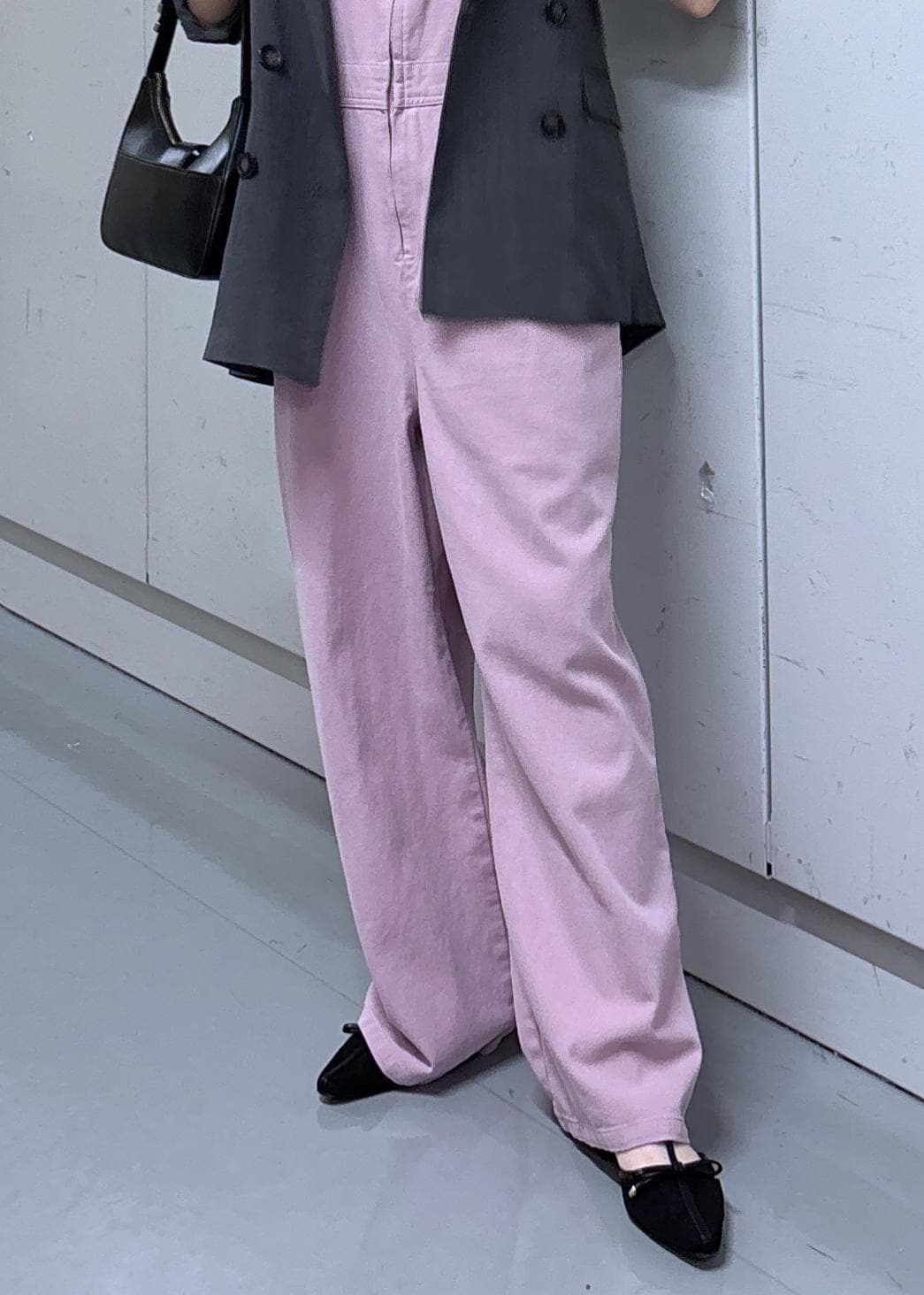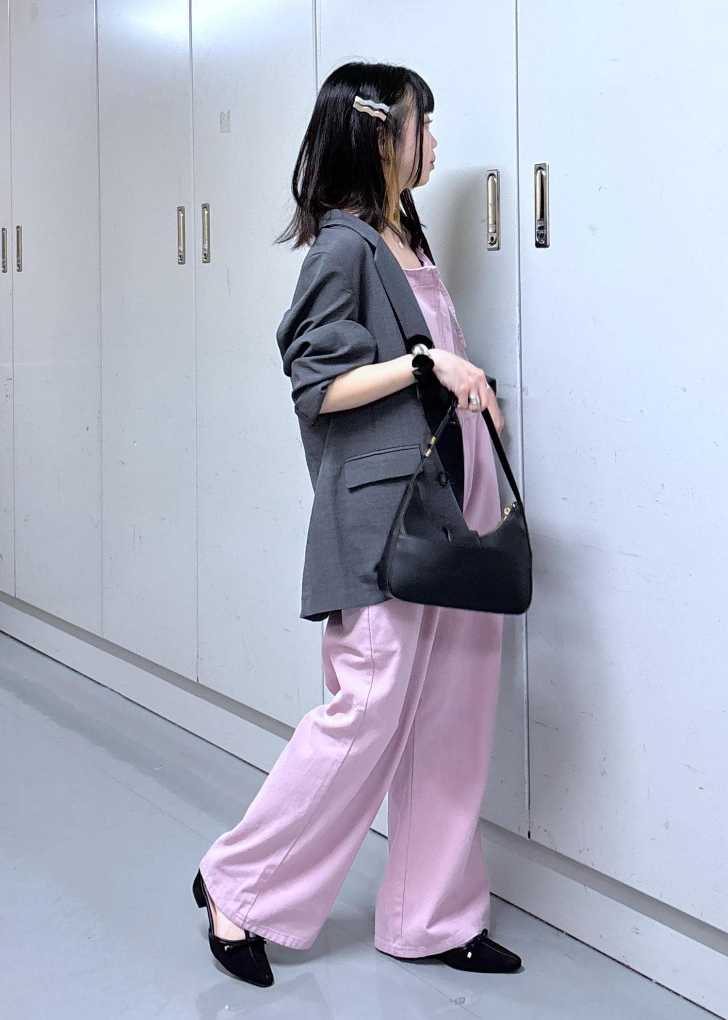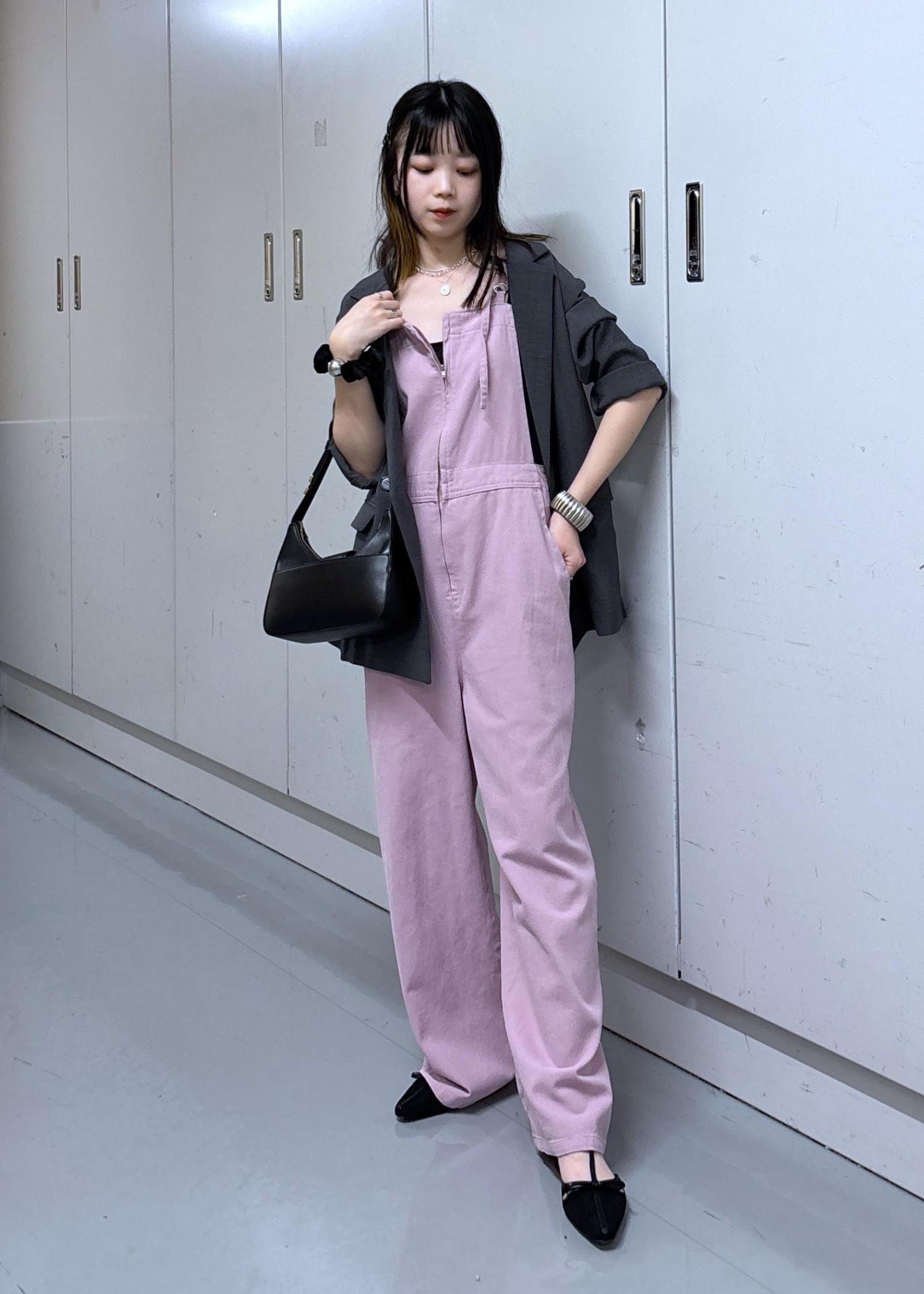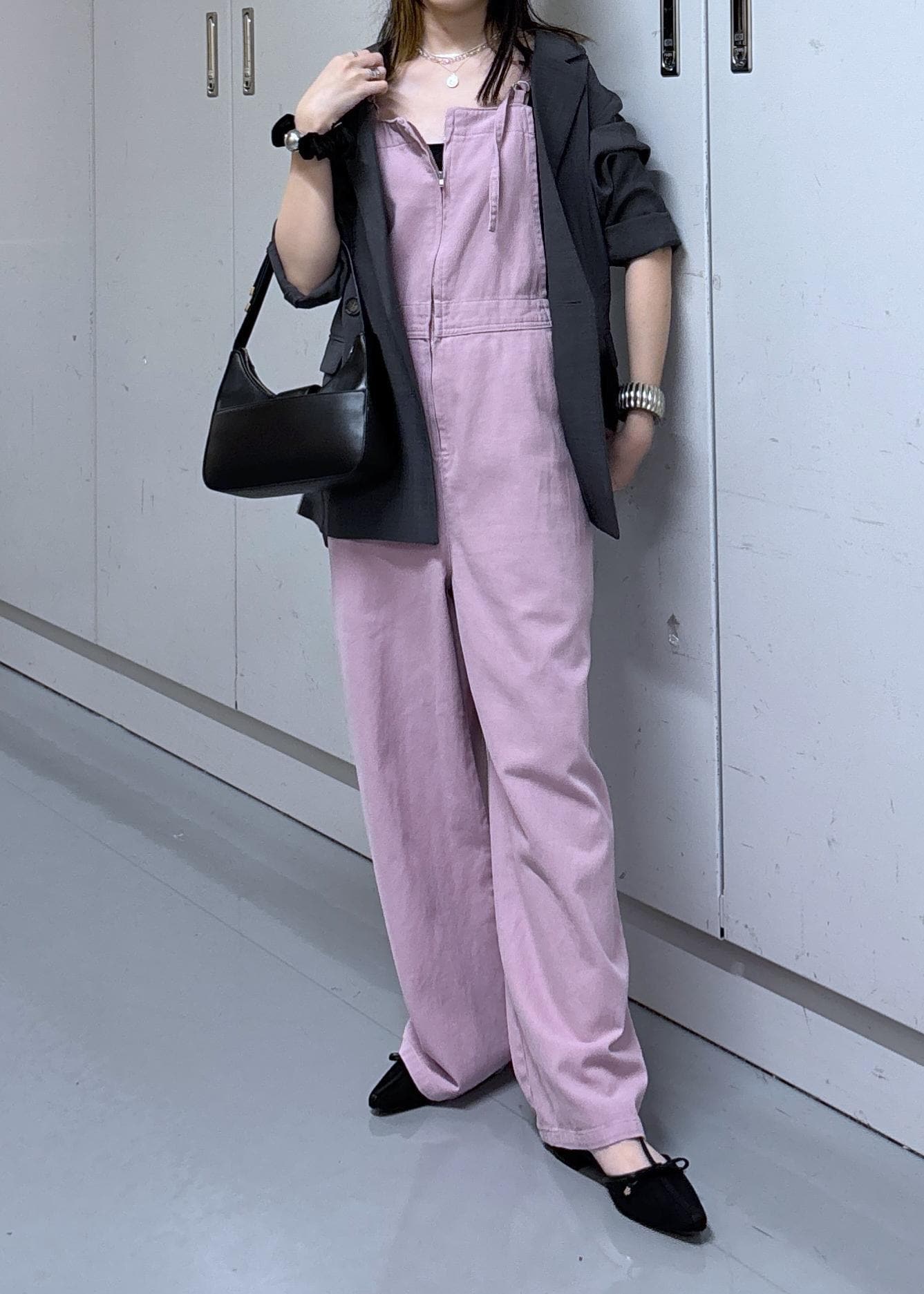 長袖ジャケットを羽織るので、サロペットのインナーは敢えてキャミソールで抜け感を意識!