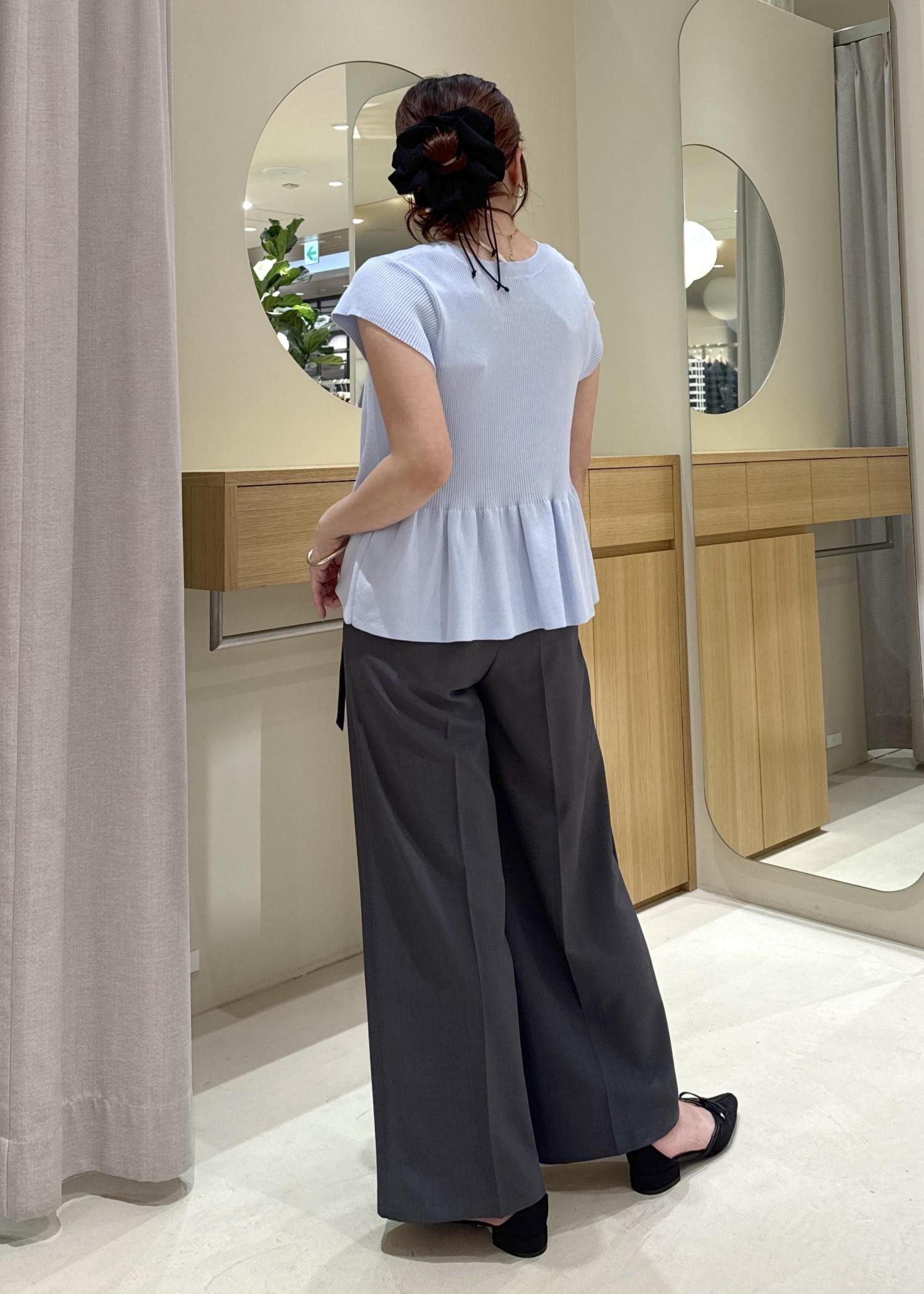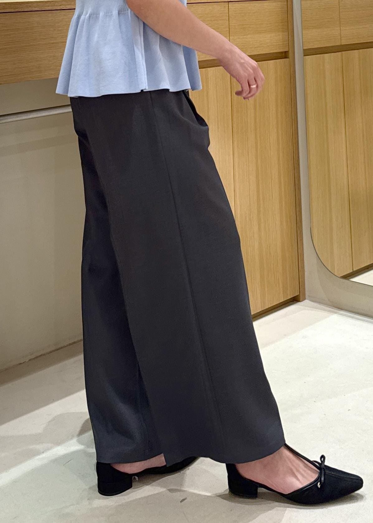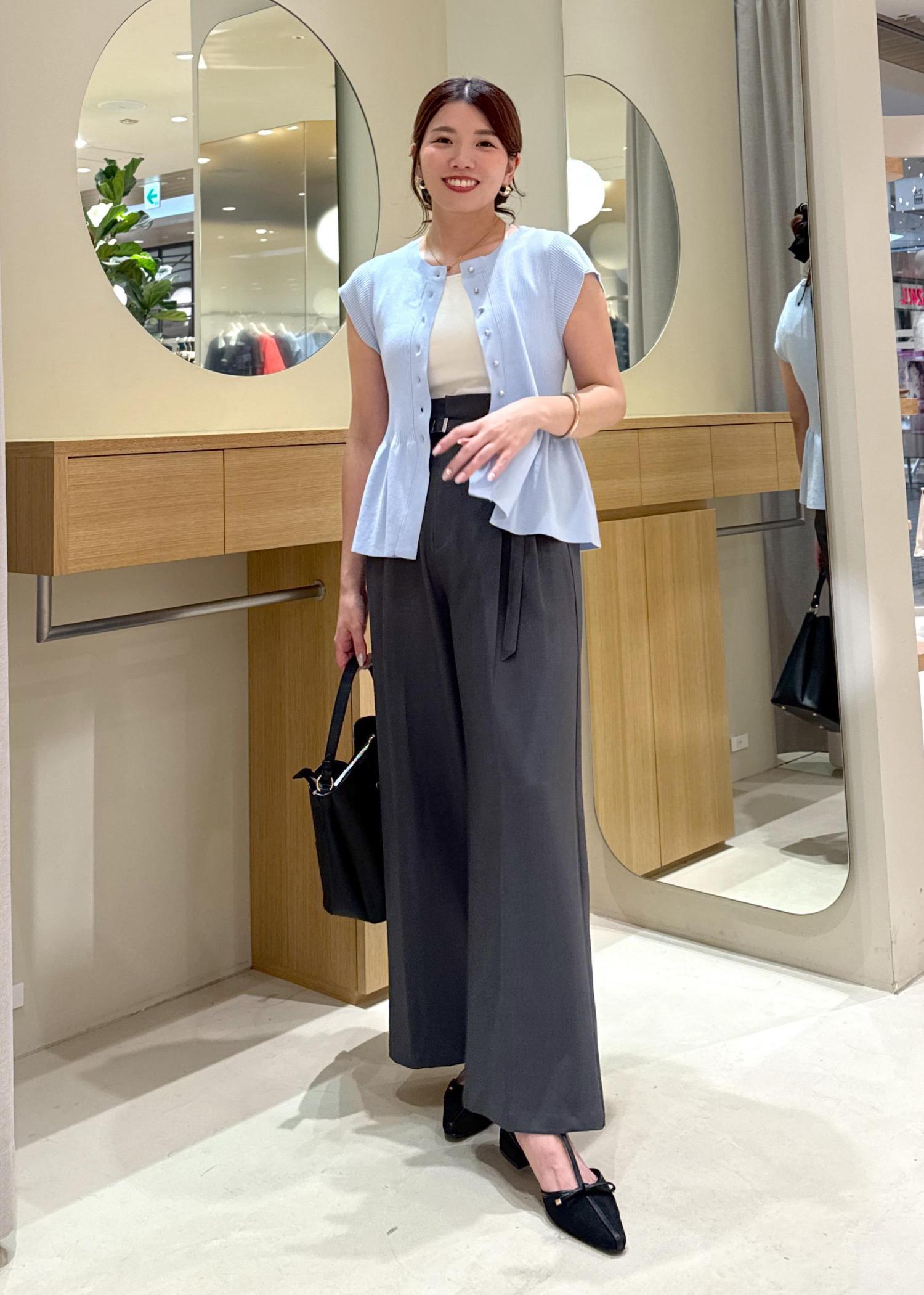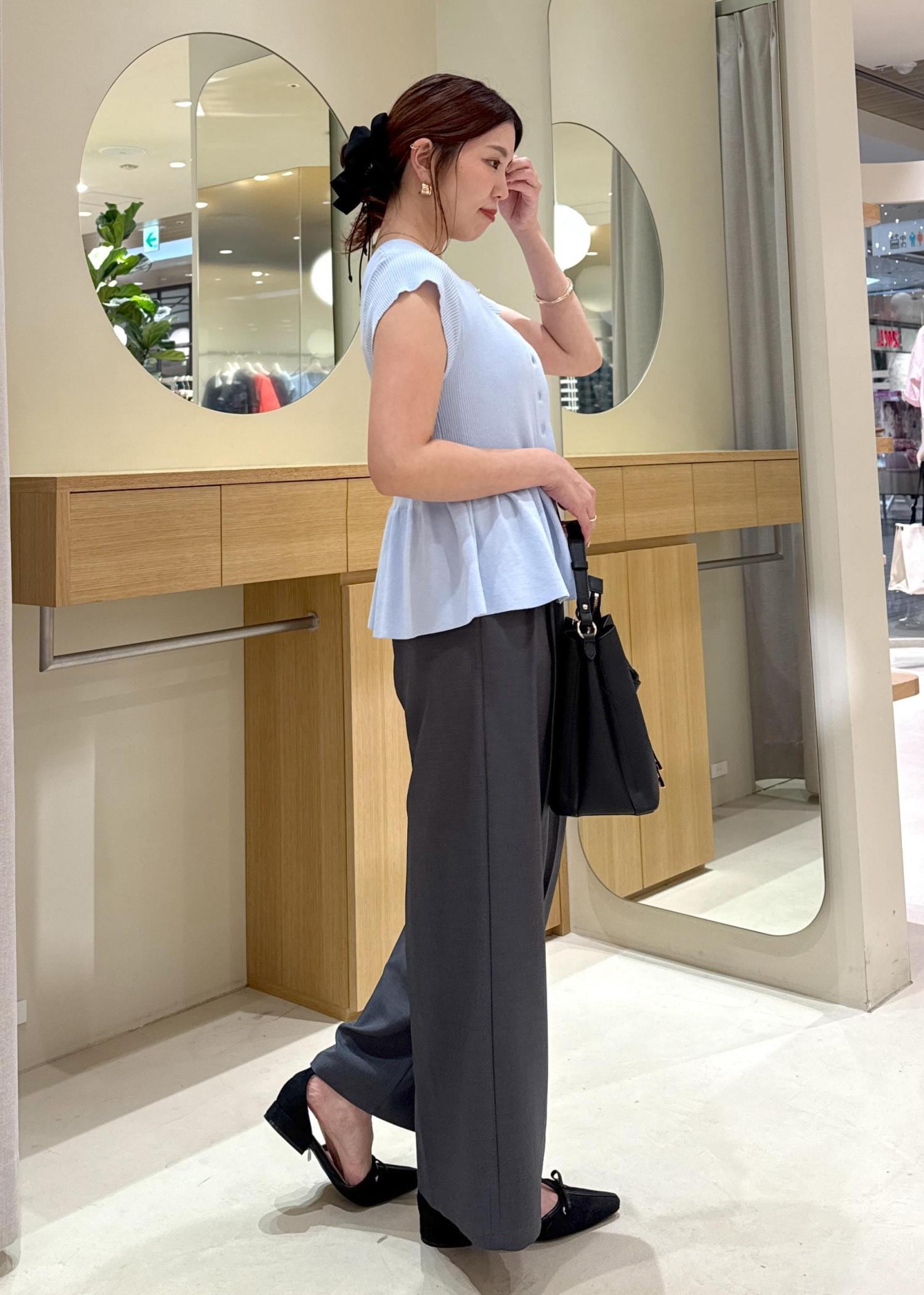 ブルーに馴染みやすいチャコールカラーのパンツを合わせました♡