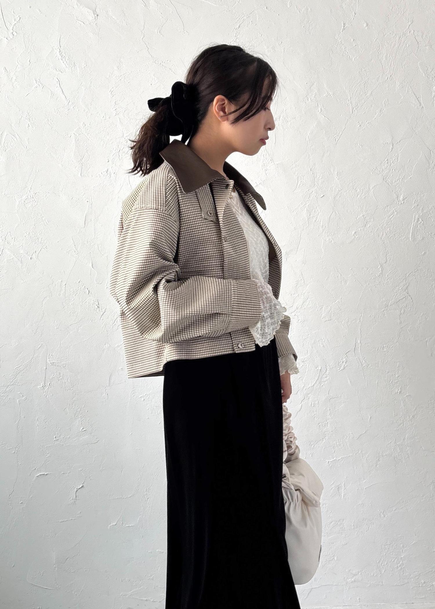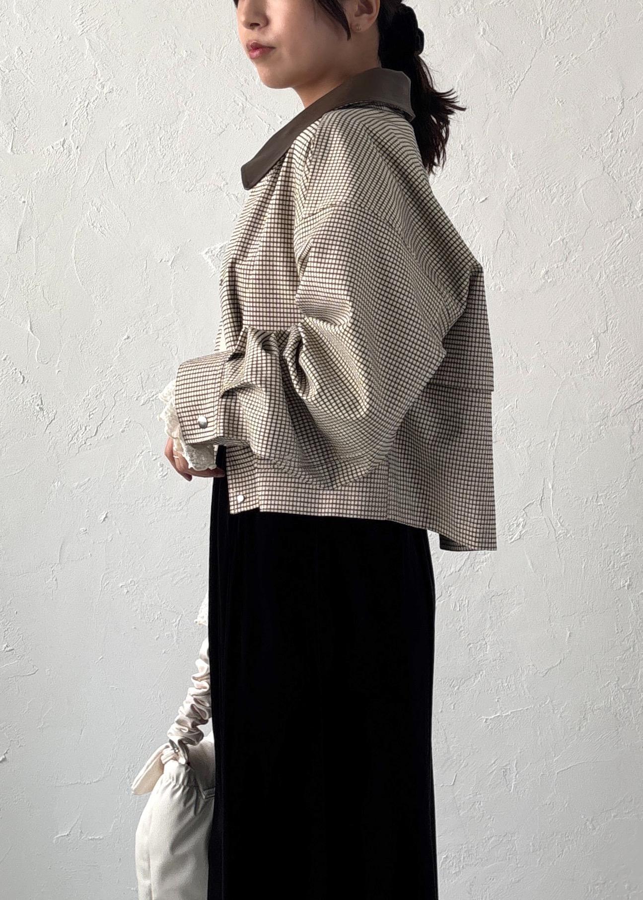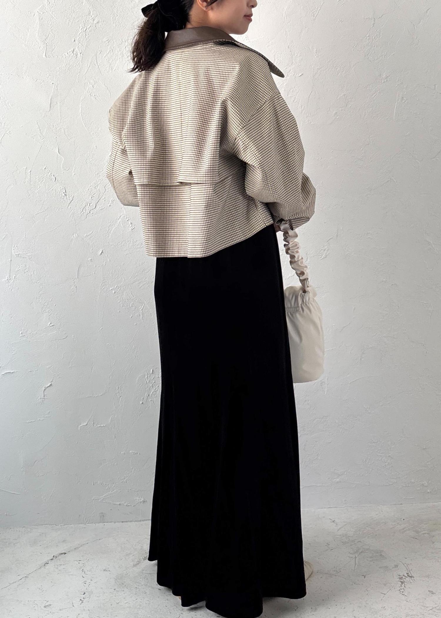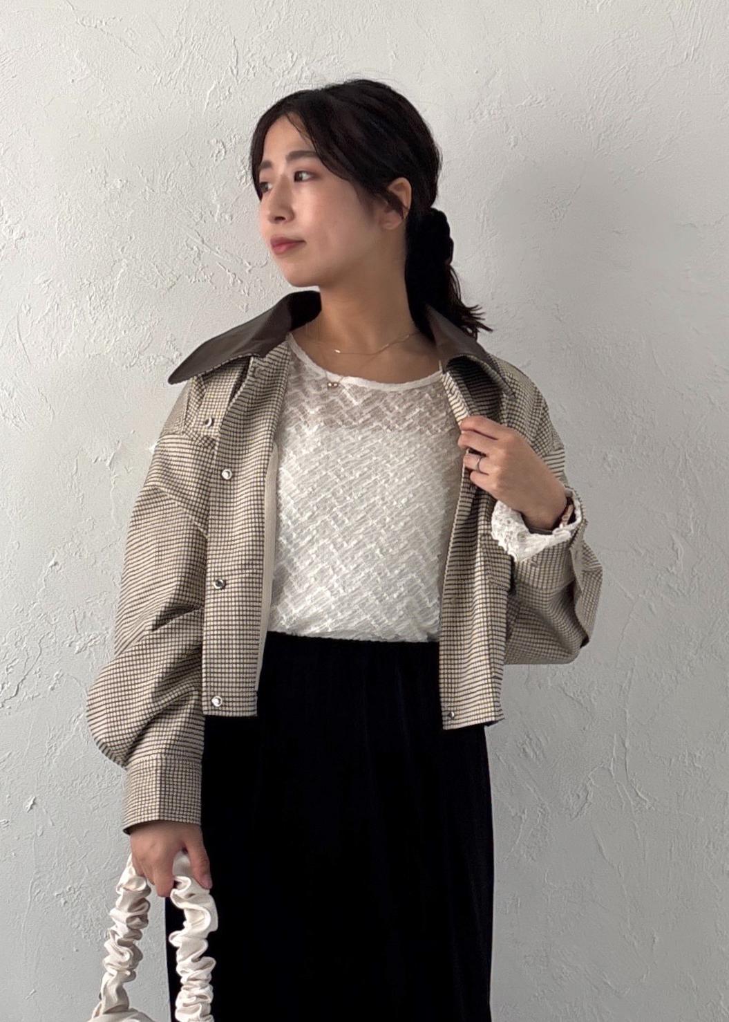 ハンサムな印象の短丈オーバーアウターを、女性らしいレースのインナーとスカートであわせ大人っぽい雰囲気にしました☺︎