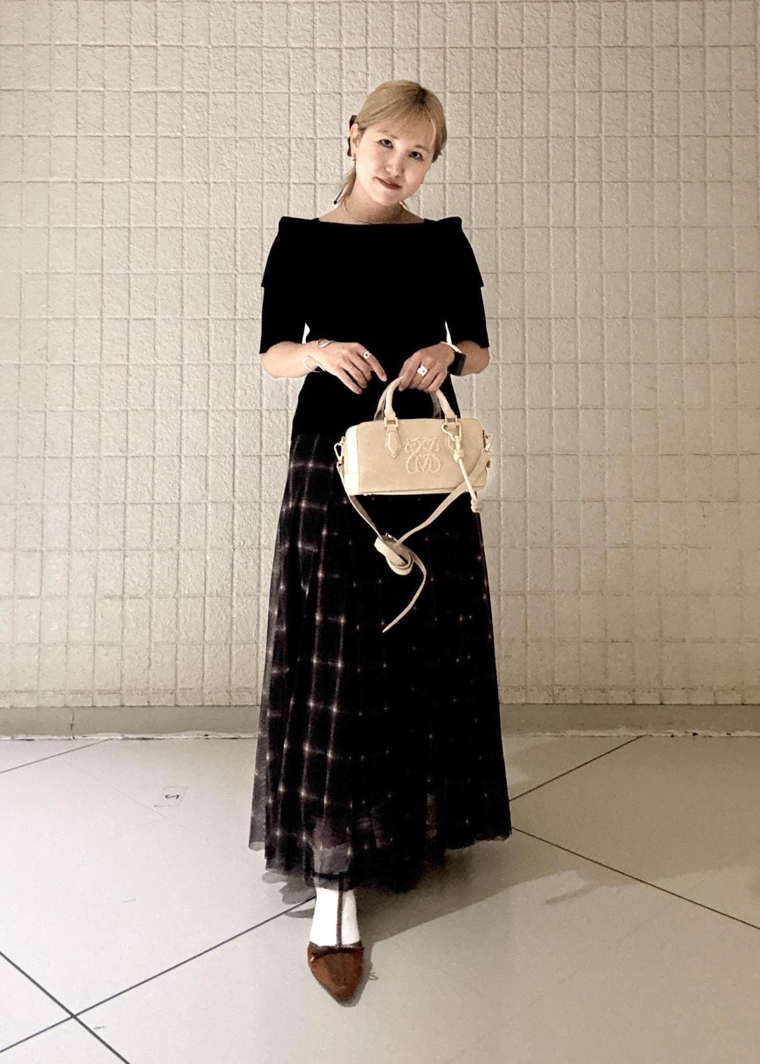 シュシュやチュールスカートなど甘めアイテムですが、全体的に落ち着いた色味で合わせて大人っぽい女性らしいコーディネートにしました。