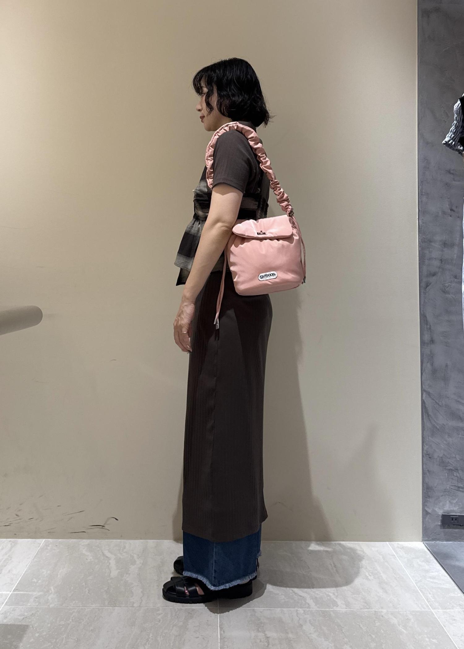 ショルダーバッグは、ショルダー部分のクシュクシュした部分が可愛らしさをよりプラスしてくれますし、