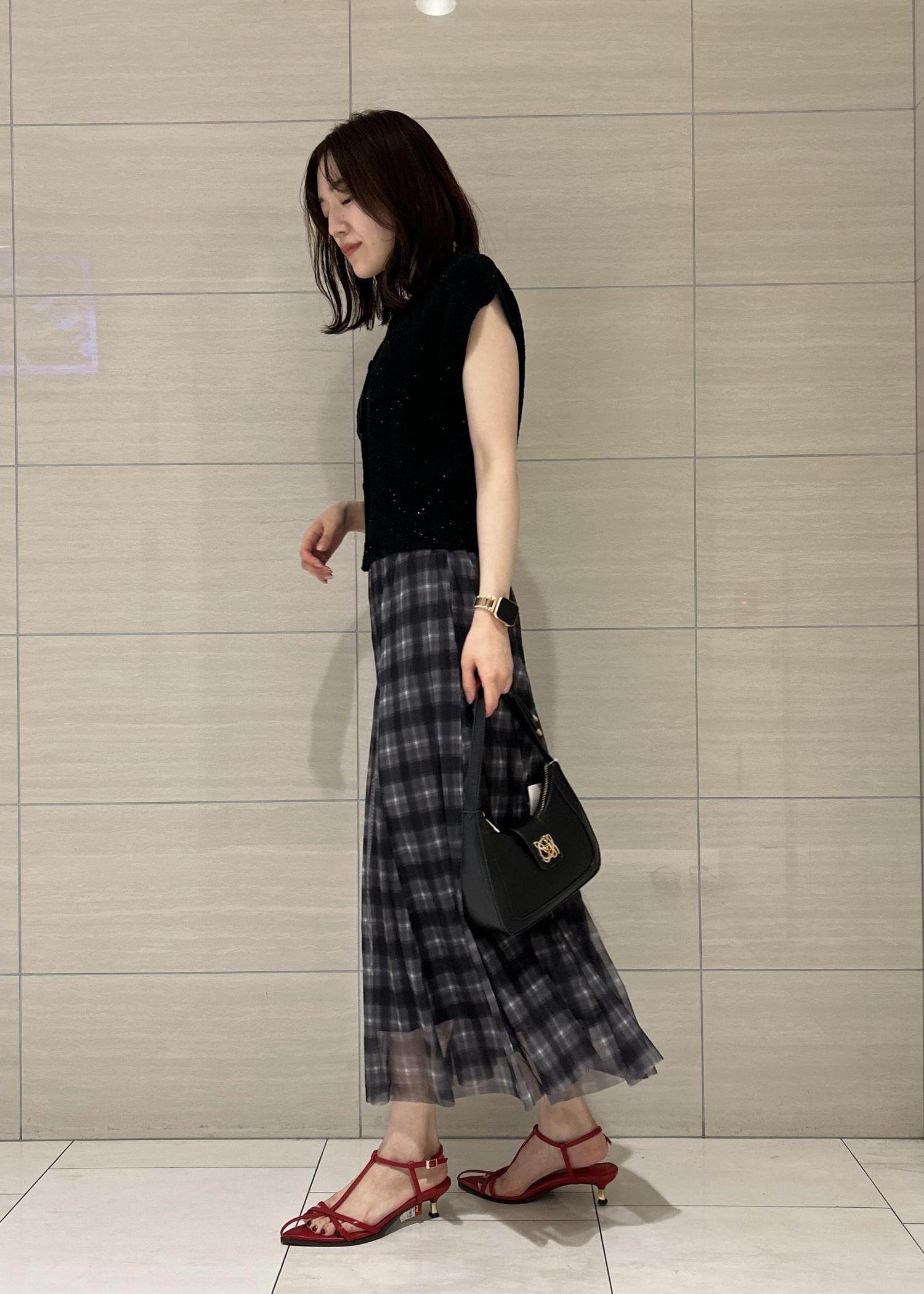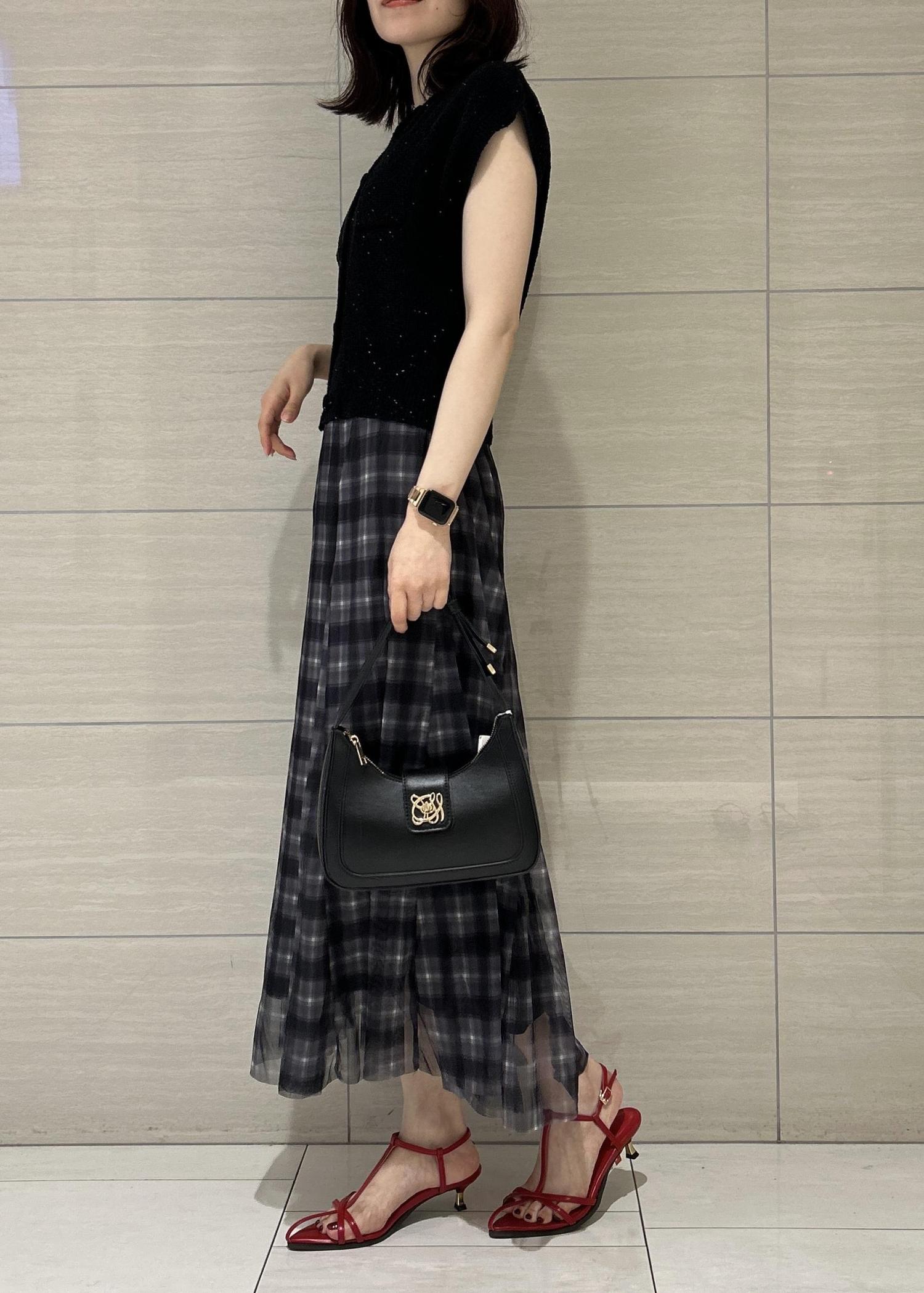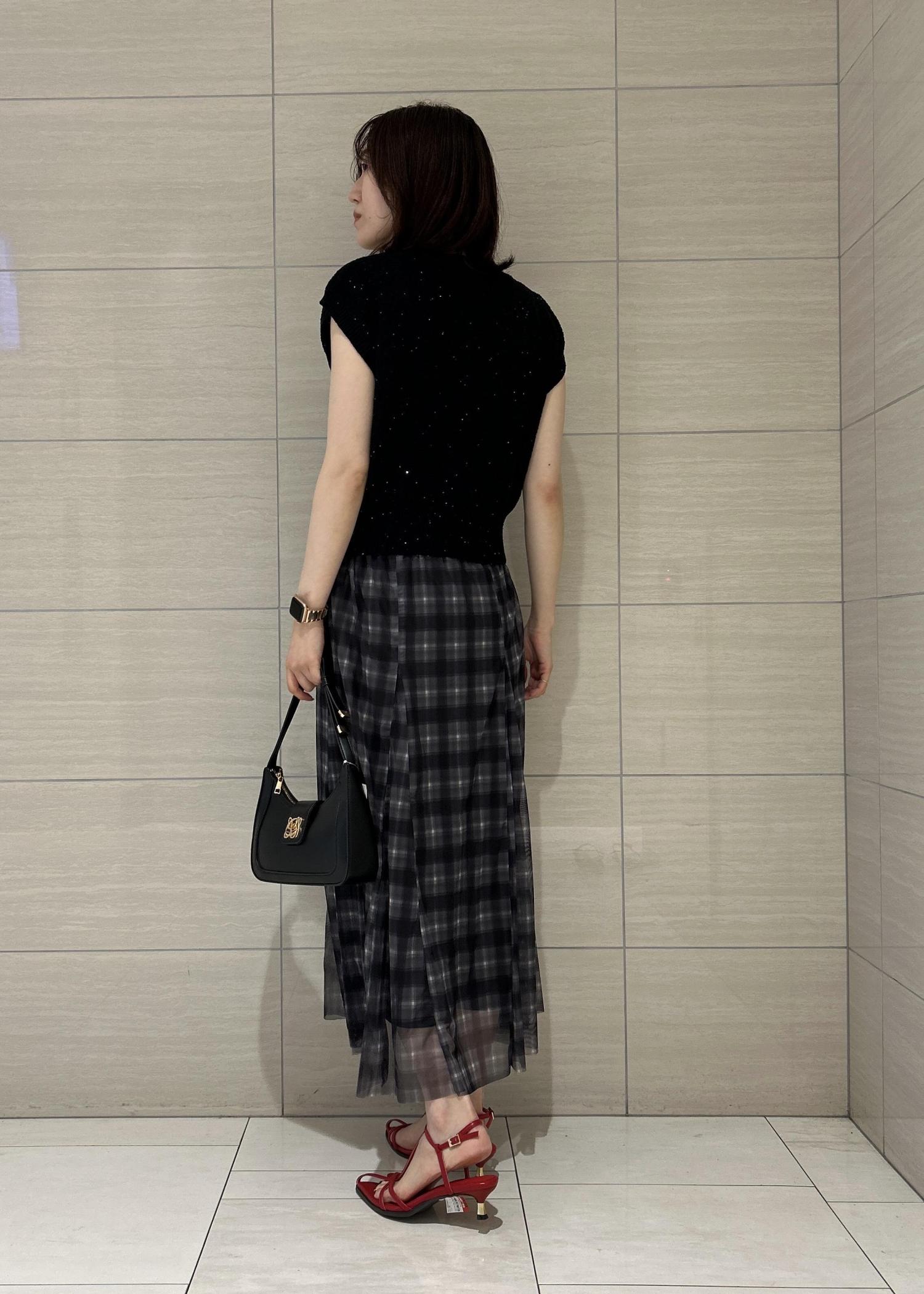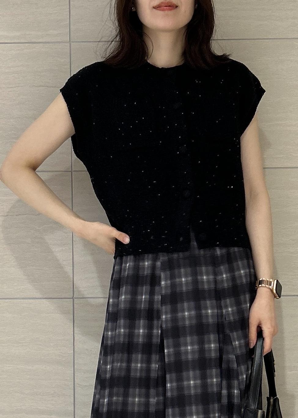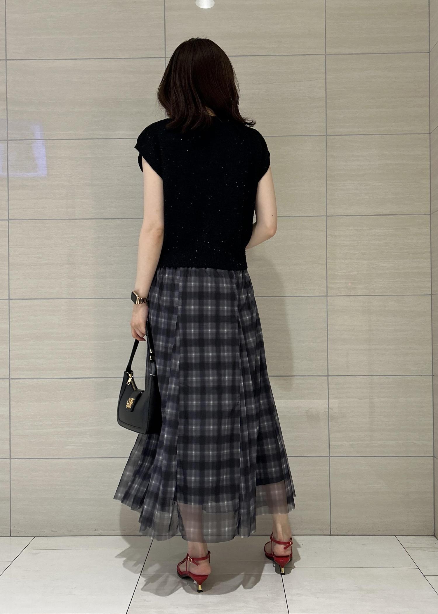 ラメ感のある黒のカーディガンをメインに今季トレンドのチェックスカートを合わせました♡
