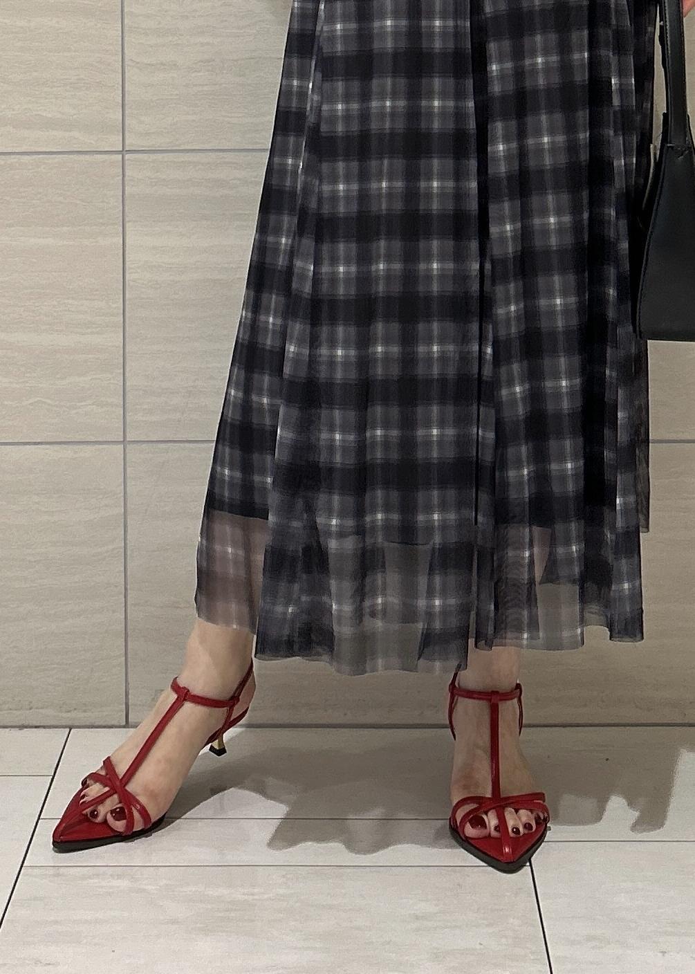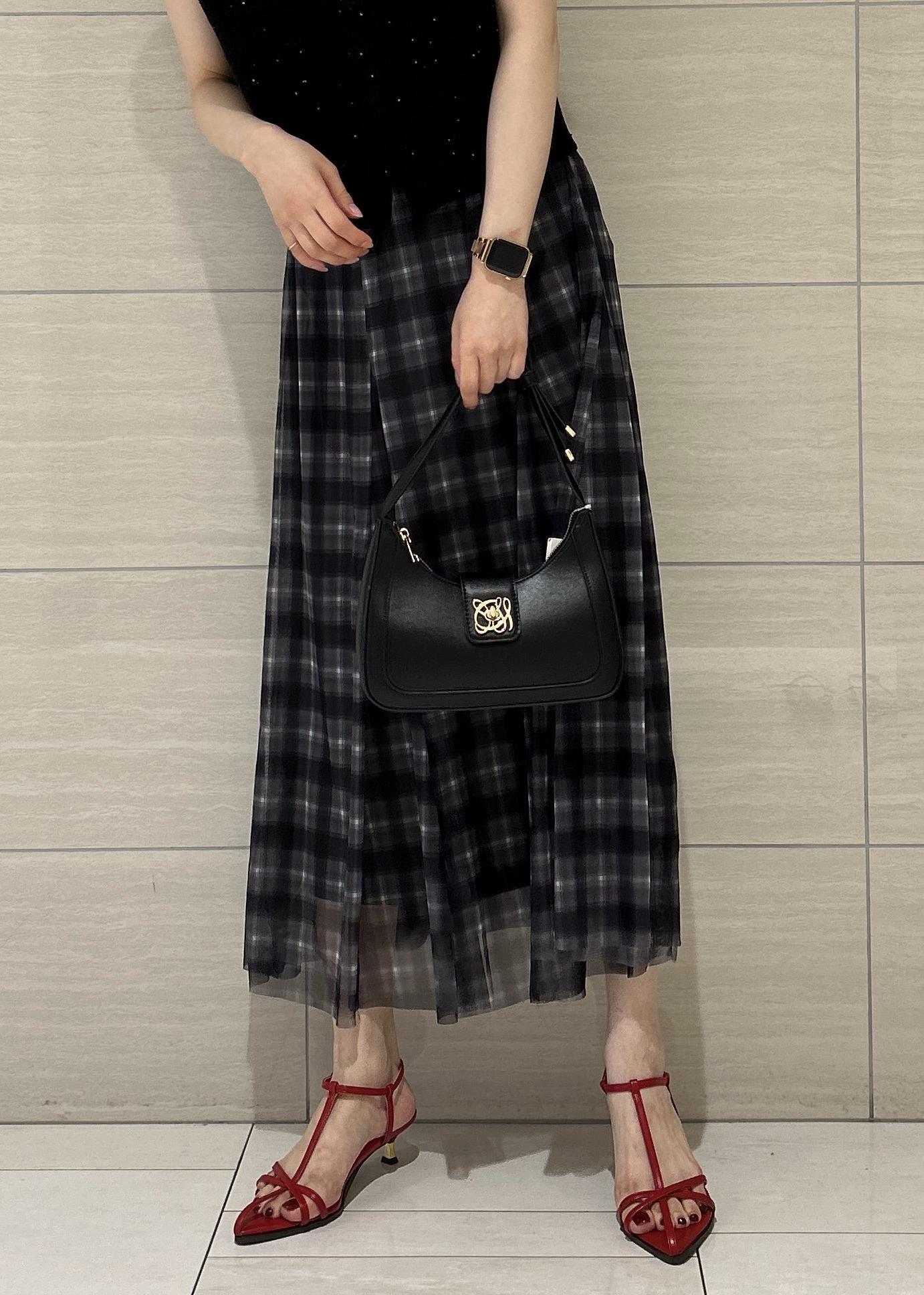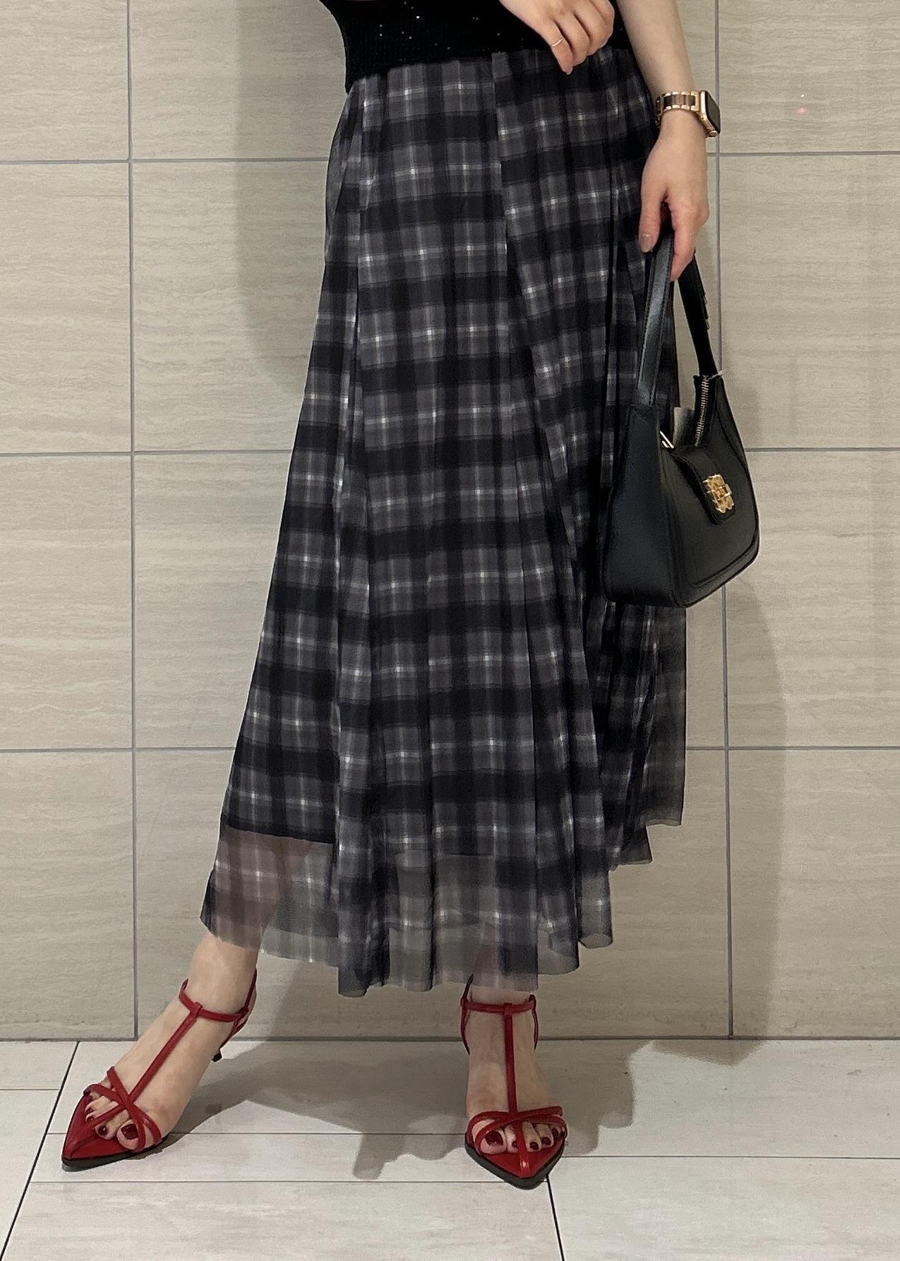 VIS【洗える】チュールプリントチェックスカートブラック系 / F¥4,612レビューウエストゴムですが大きすぎずラクに穿けます。