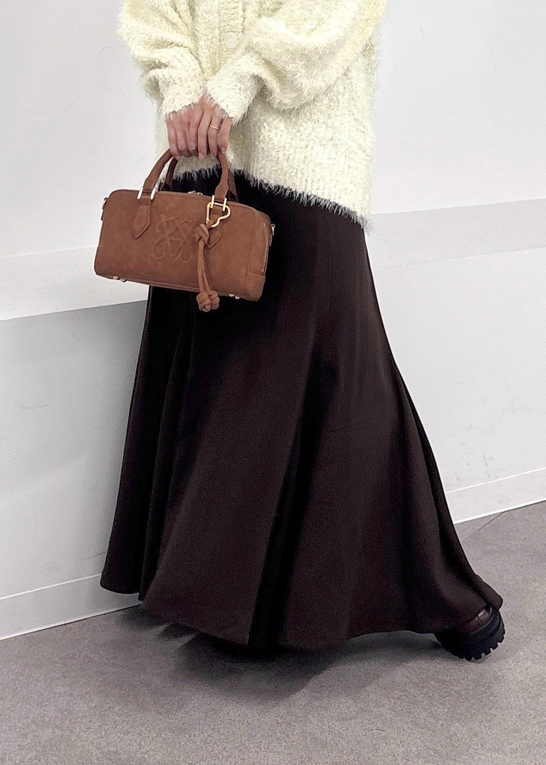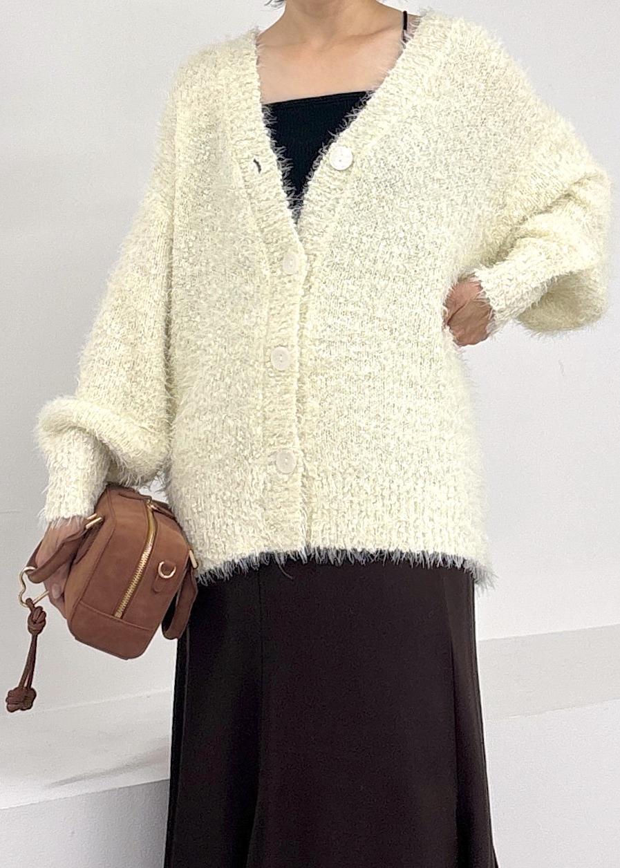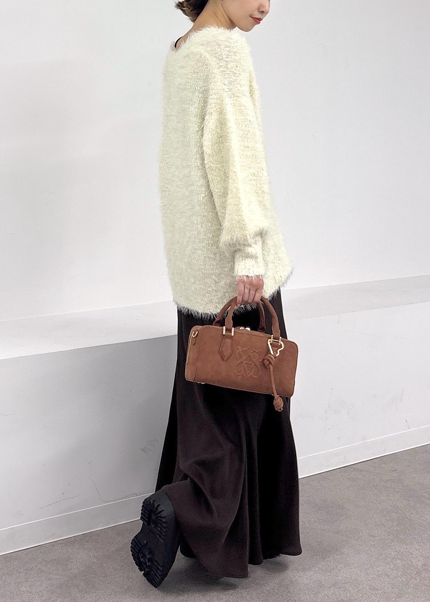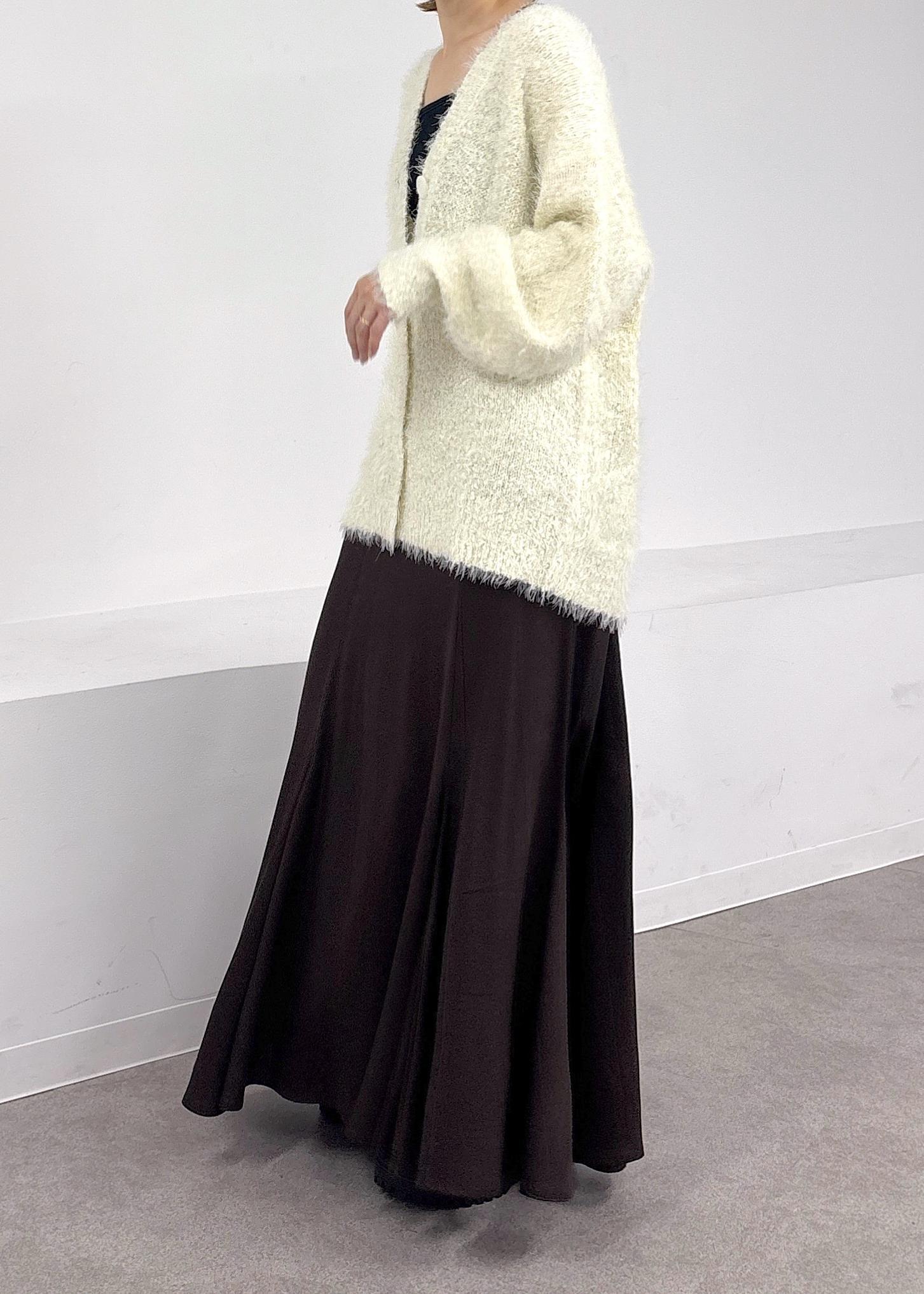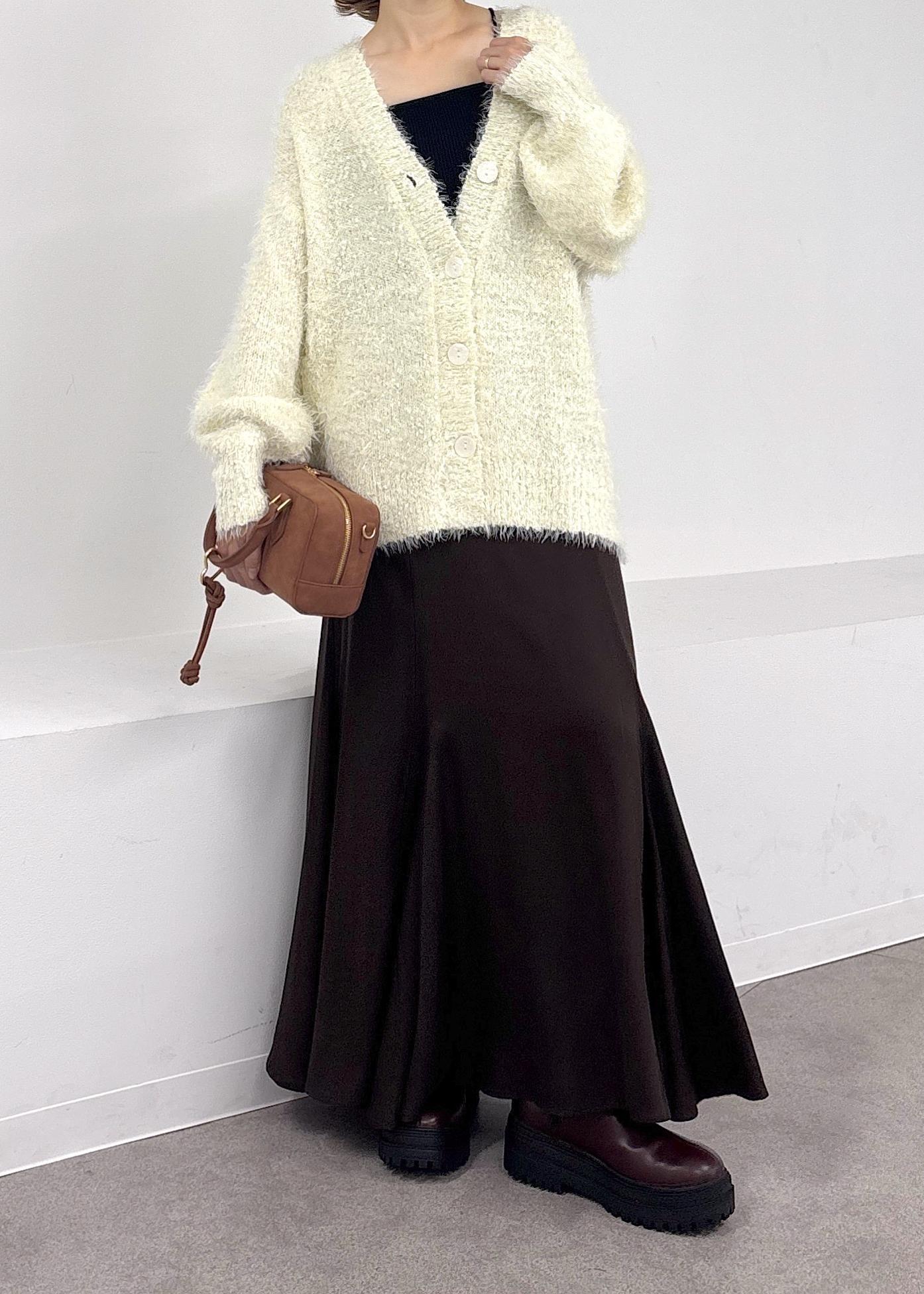 ふわふわ柔らかなフェザーニットカーディガンをポイントに、ブラウンのマーメイドスカートと合わせたカジュアルスタイル♪昨年も大人気シリーズのカーディガンはラメ使いが加わりアップデートされました!ポコポコと膨らみのあるデザインがとても肌あたりが良く、着心地◎ホワイト×ブラウン合わせが今年らしい。秋オススメの大人カジュアルコーデ。
