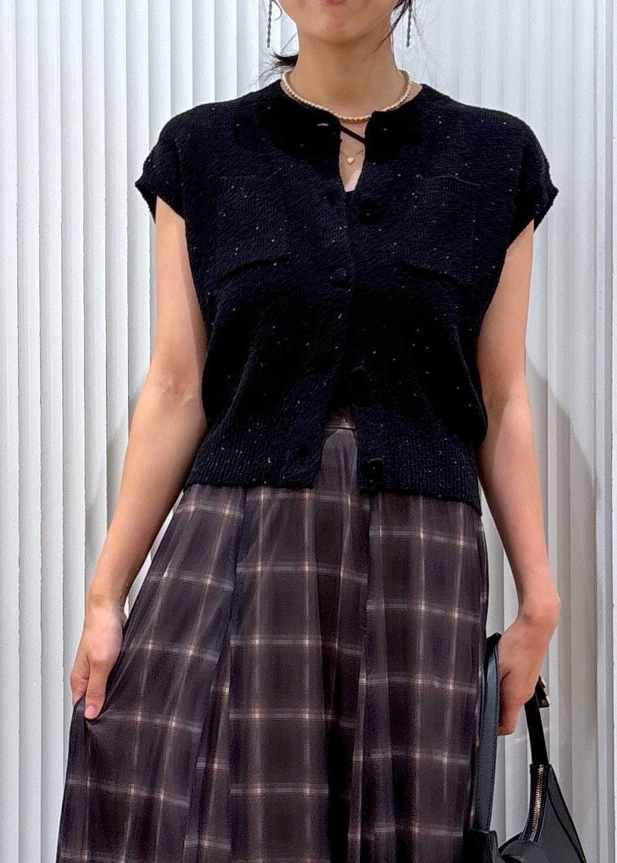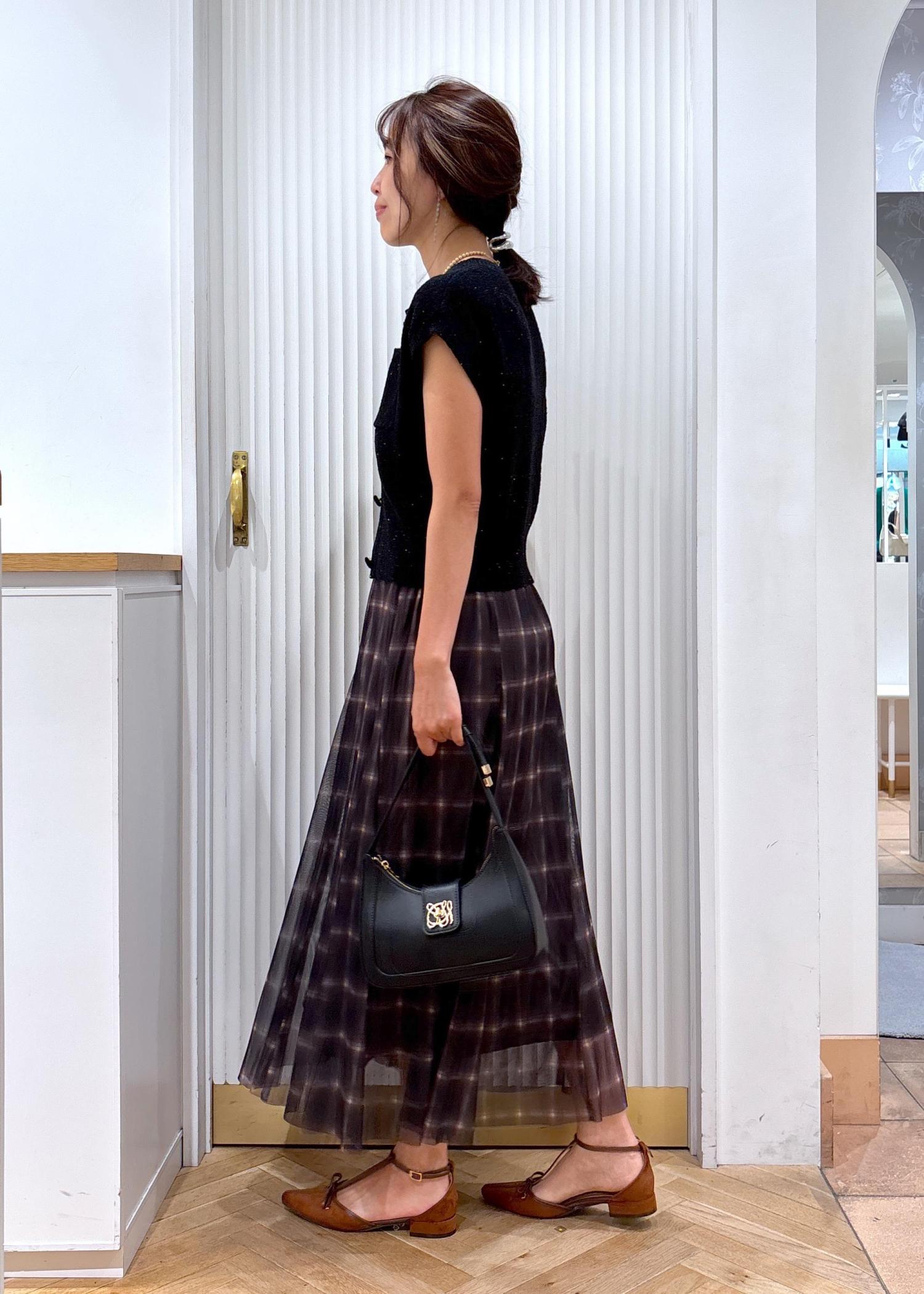 くるみボタンが上品なカーディガンとチェックスカートのコーディネート。