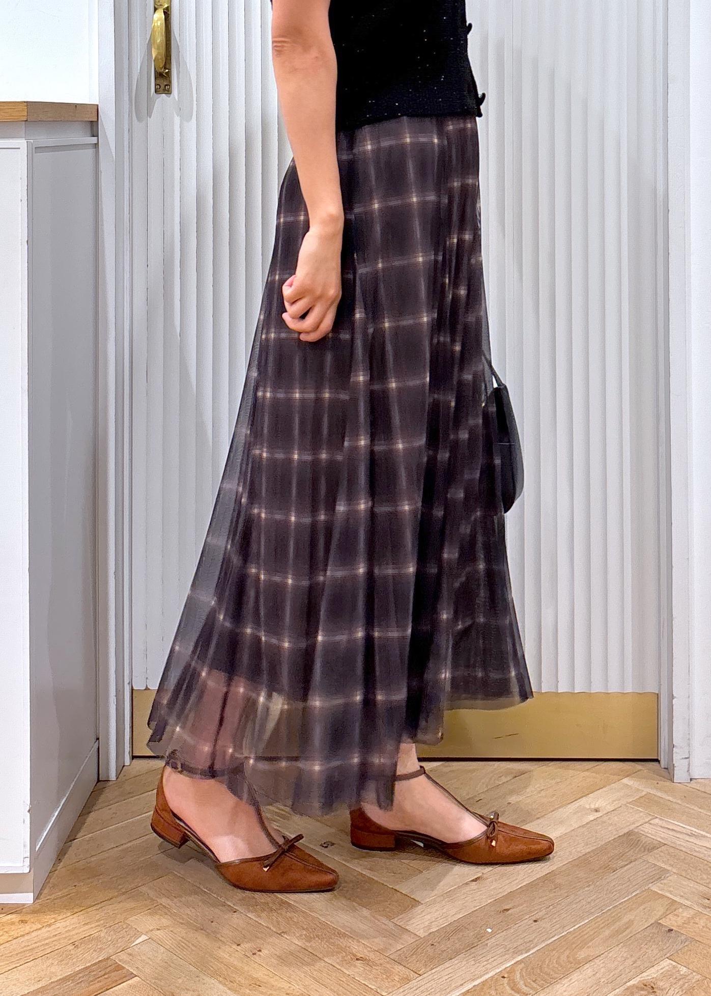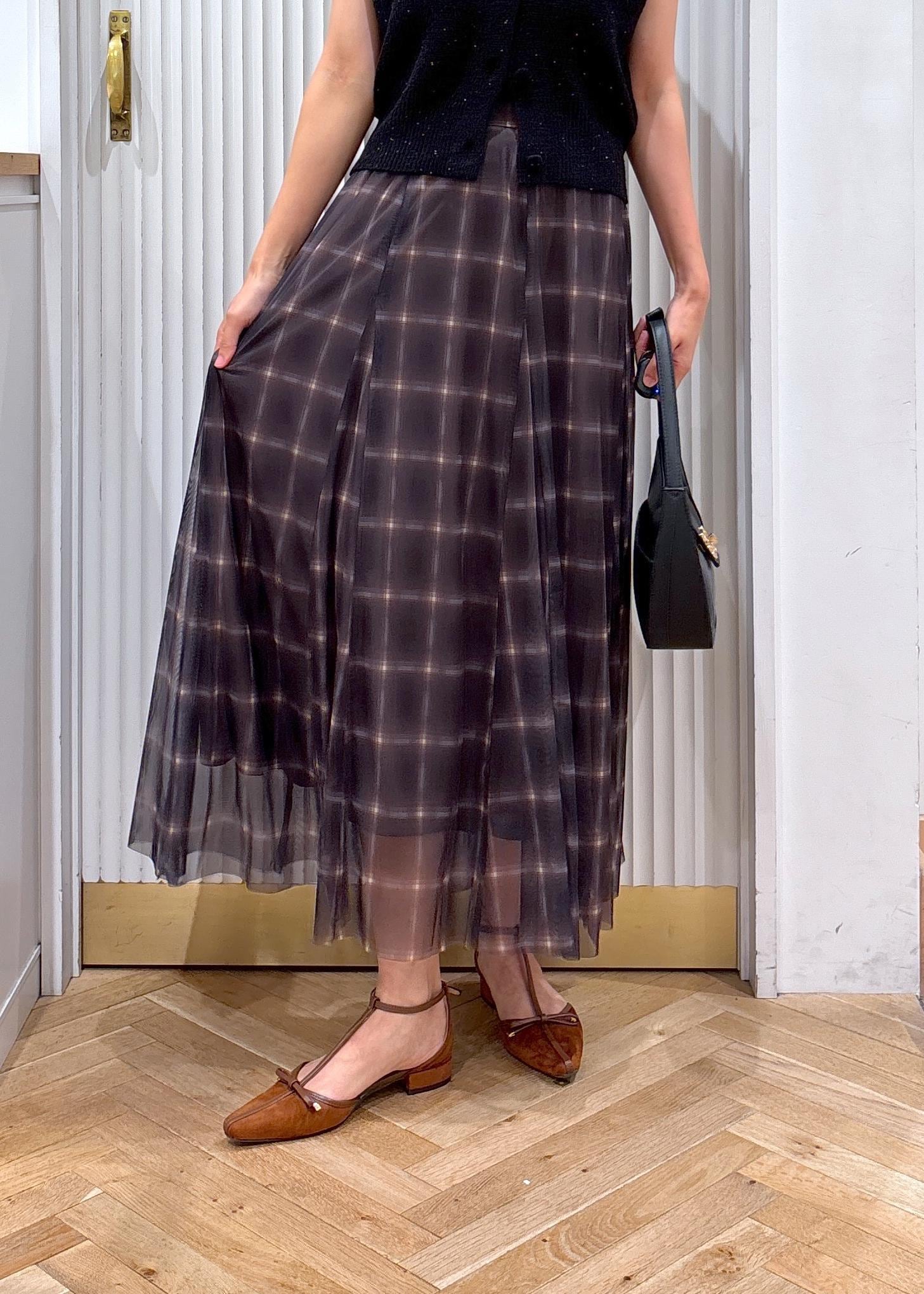 VIS【洗える】チュールプリントチェックスカートダークブラウン系 / F¥4,612レビュー身長164センチ、フリーサイズ着用です。