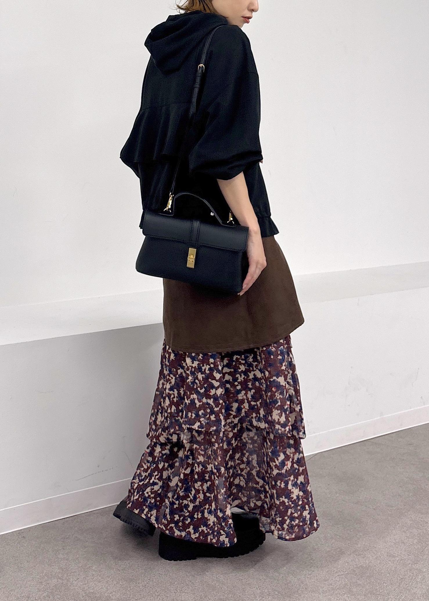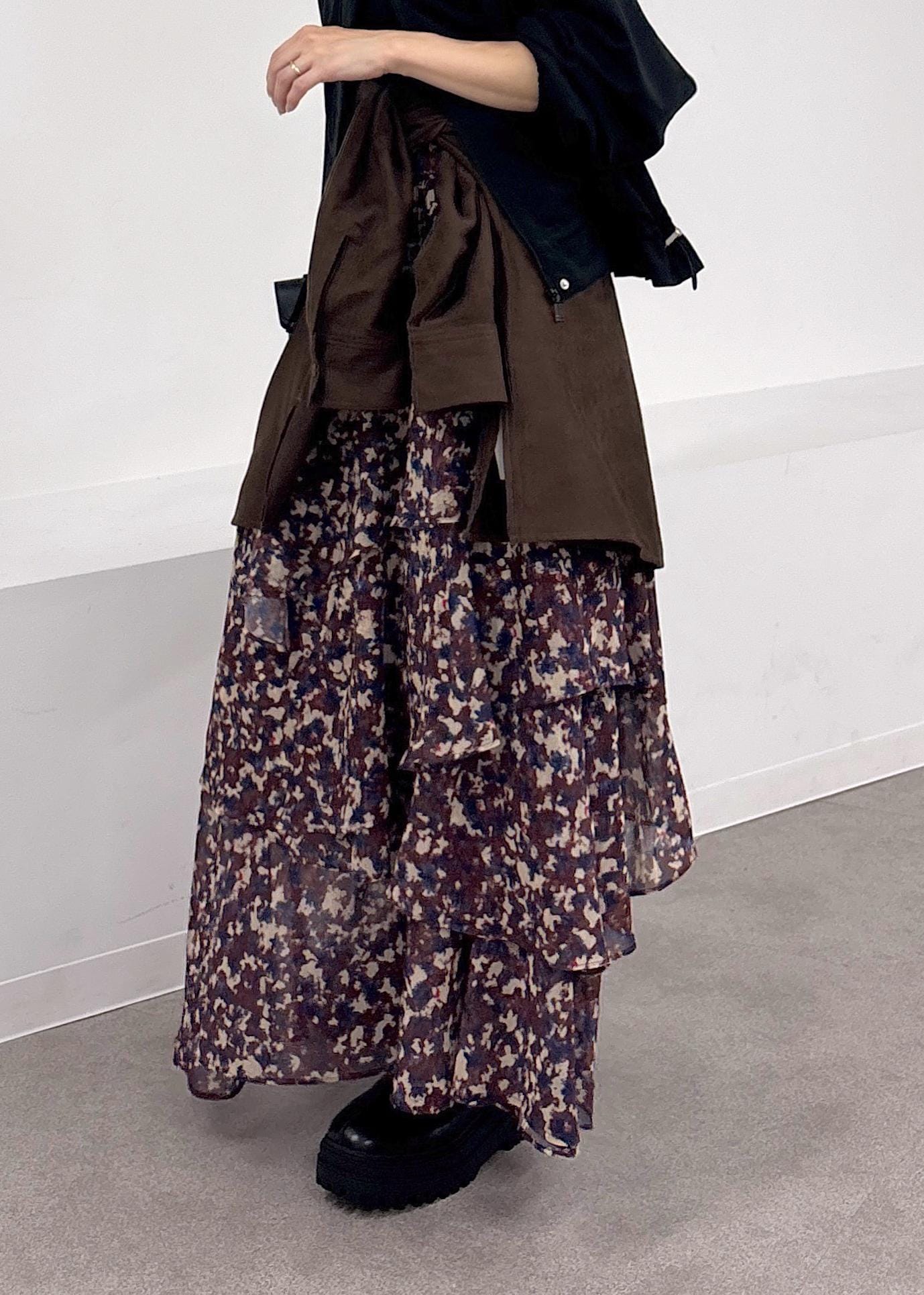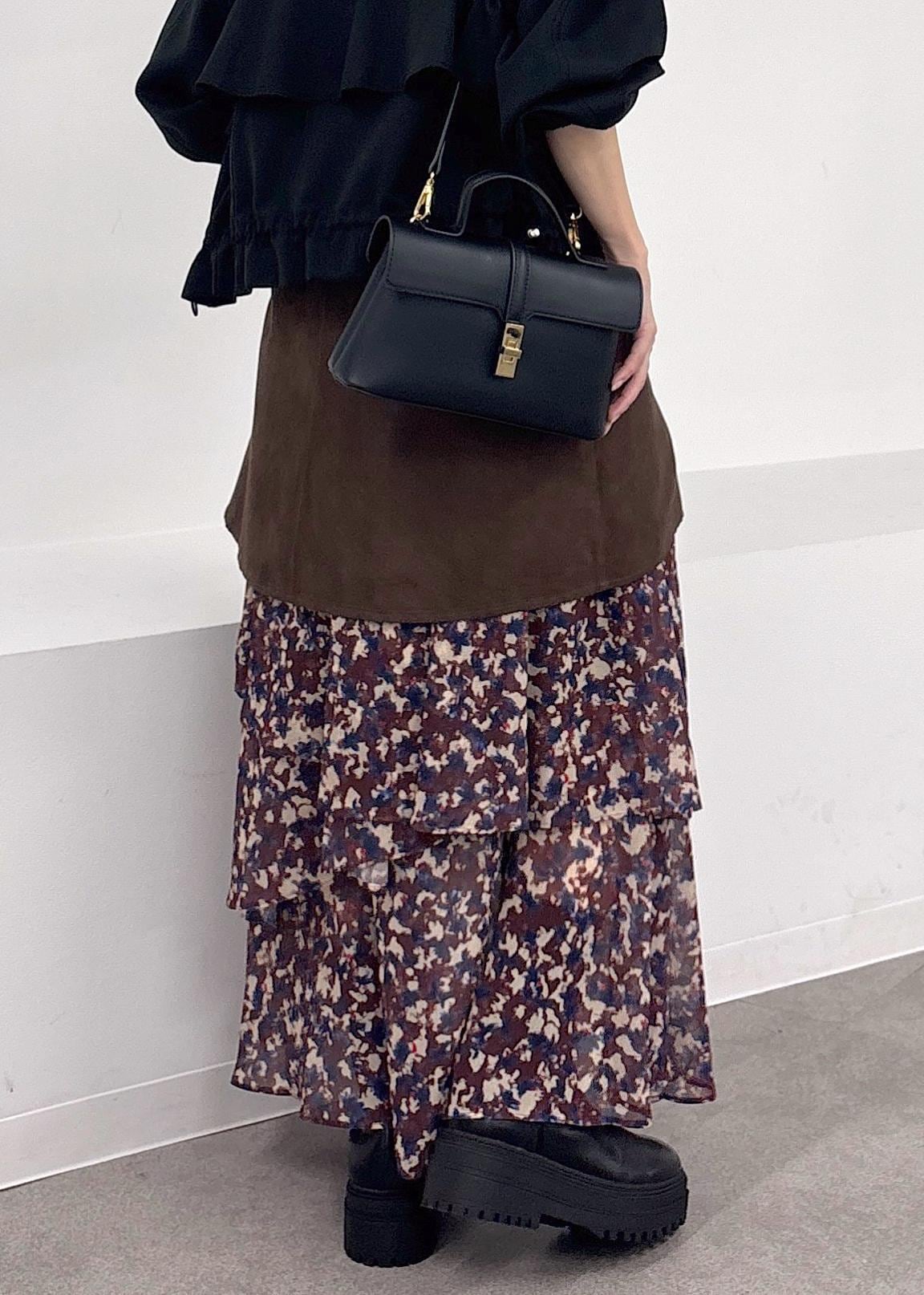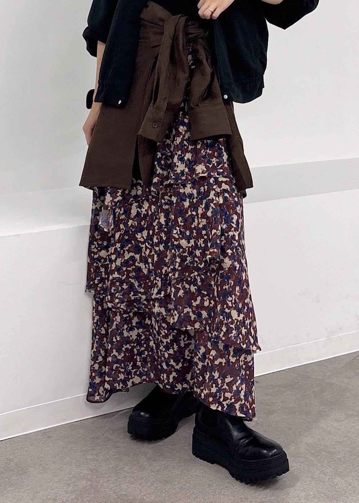 VIS花柄アソート楊柳ティアードスカートブラウン系 / F¥4,613レビュートレンドのティアードスカート♪4段ティアードがアシンメトリー風にあしらっている、大人可愛いデザイン。さらっとした着心地でとても軽くて着やすさ◎ウエストも半分近くゴムを使用しているためストレスフリー。全体的にほどよくゆったり、着丈は足首が少しだけ見えるくらいの長さでした。