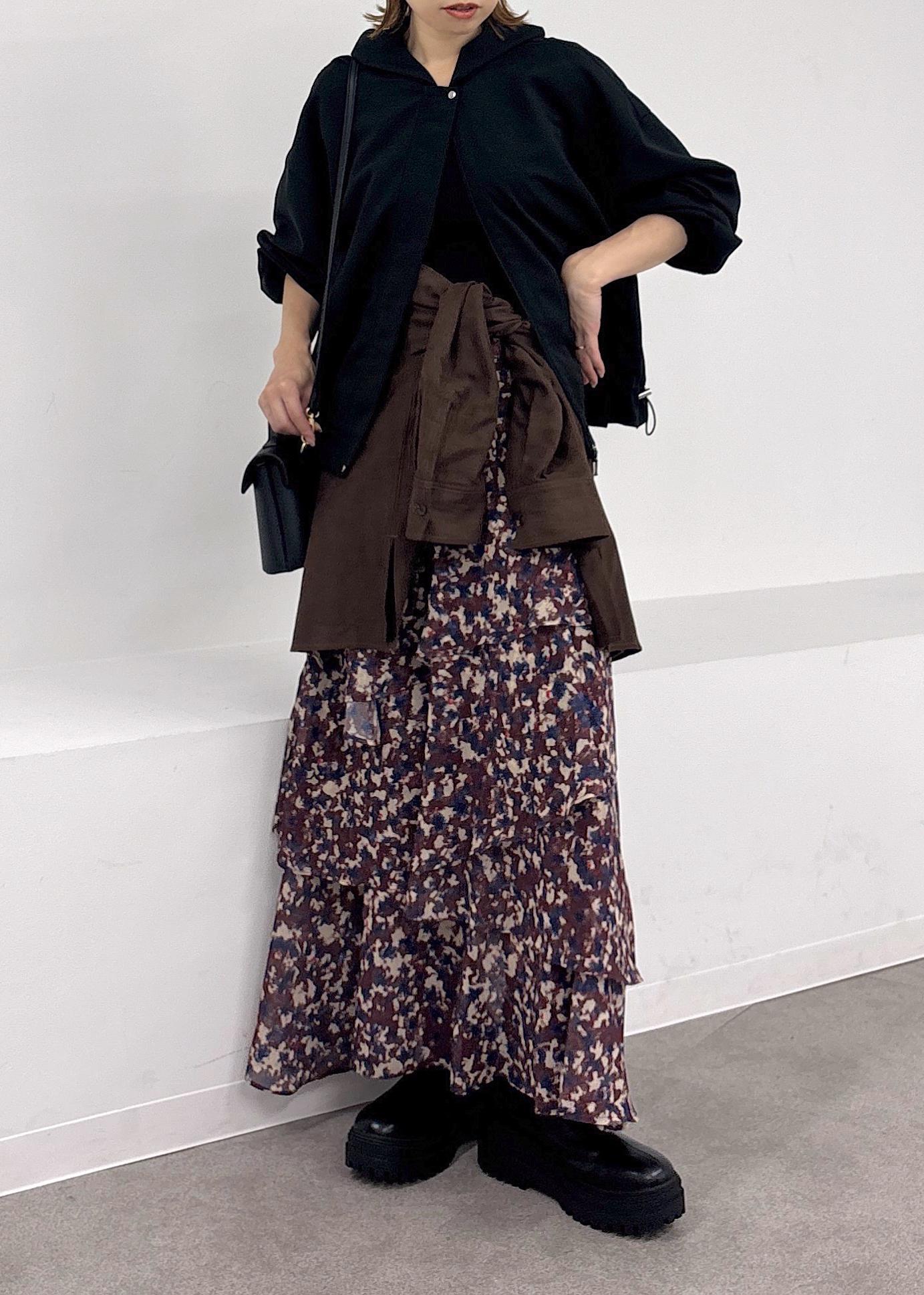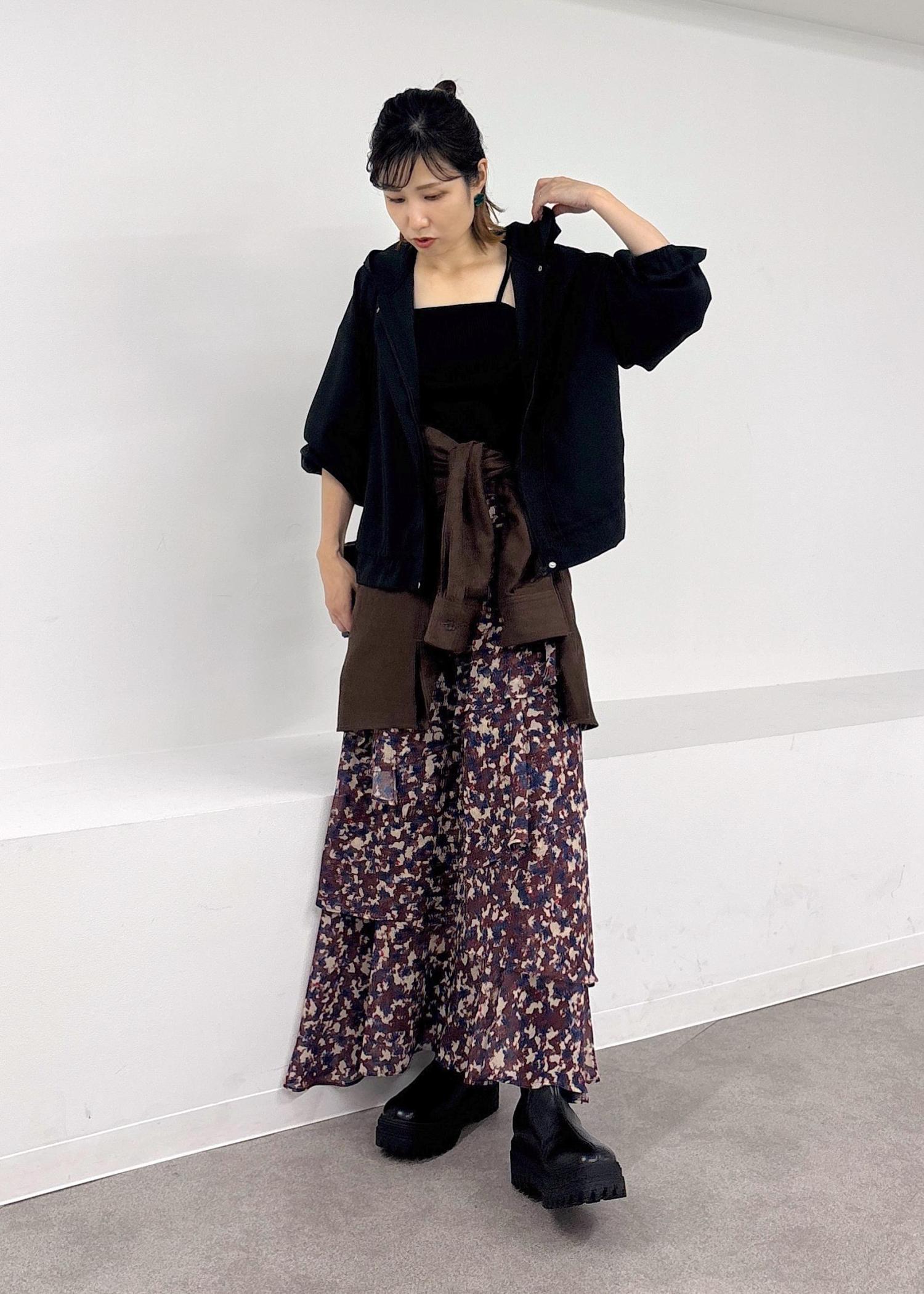 今時期の冷房対策としても使えるブルゾンをトップス風に、トレンドのティアードスカートとスエード調のシャツを腰巻きしたカジュアルスタイル♪シャツは少し高めの位置で巻くことでスタイルup見え+こなれ感が出せてオススメです◎季節をまたぐ時期に先まで着れる大人カジュアルコーデ。