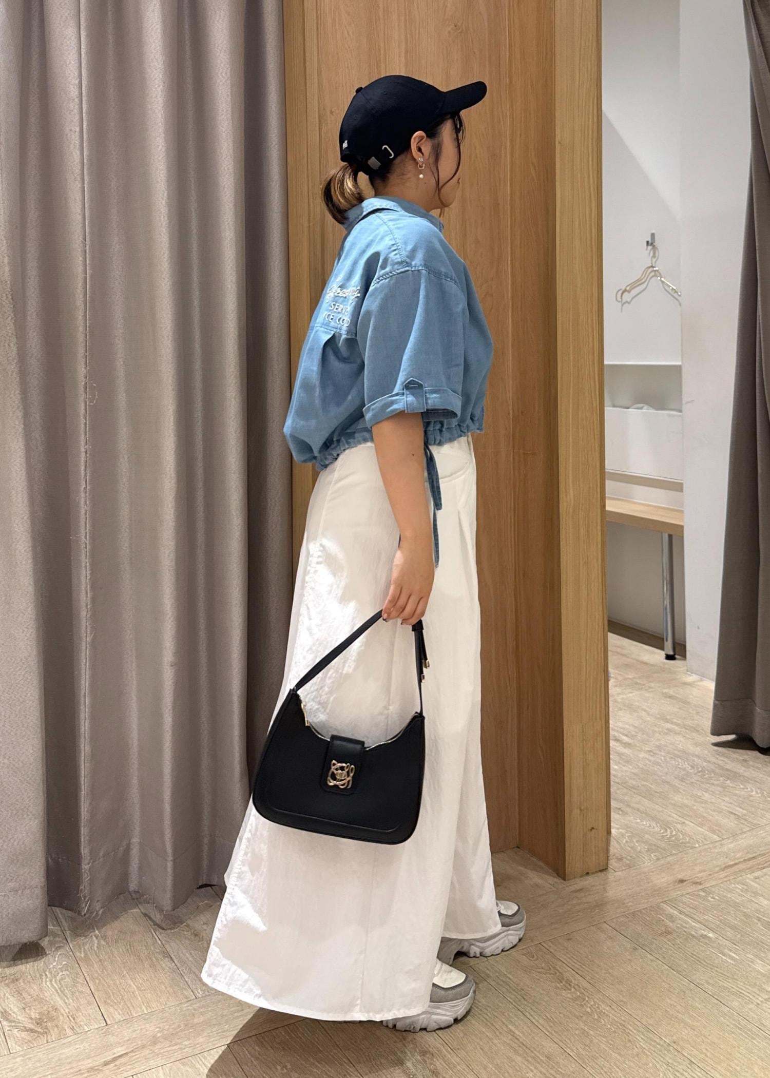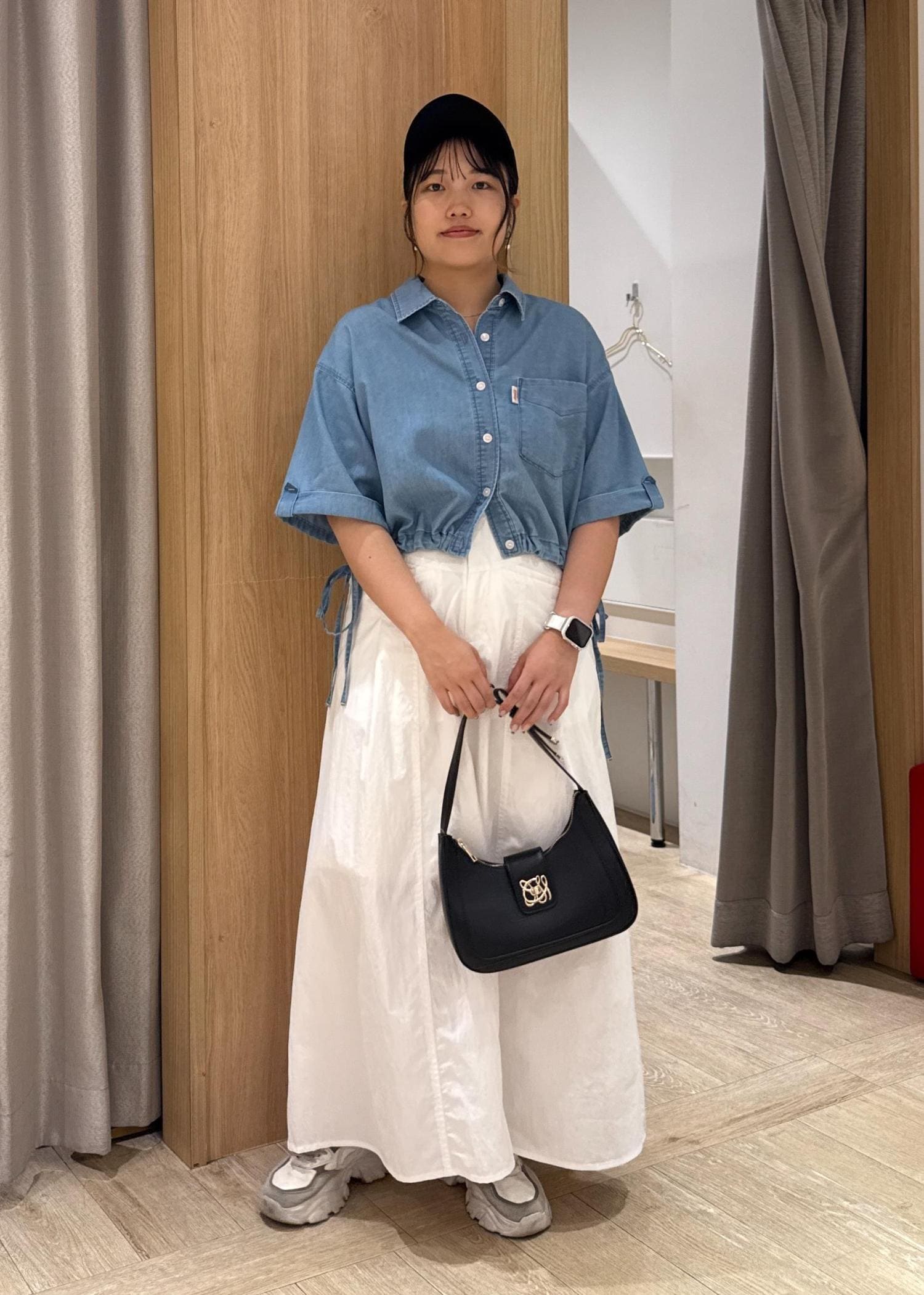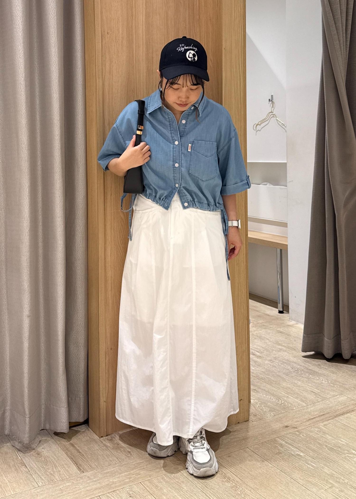 ボリューム感のあるシャツなので、一番下のボタンを開けて抜け感を出してます◎