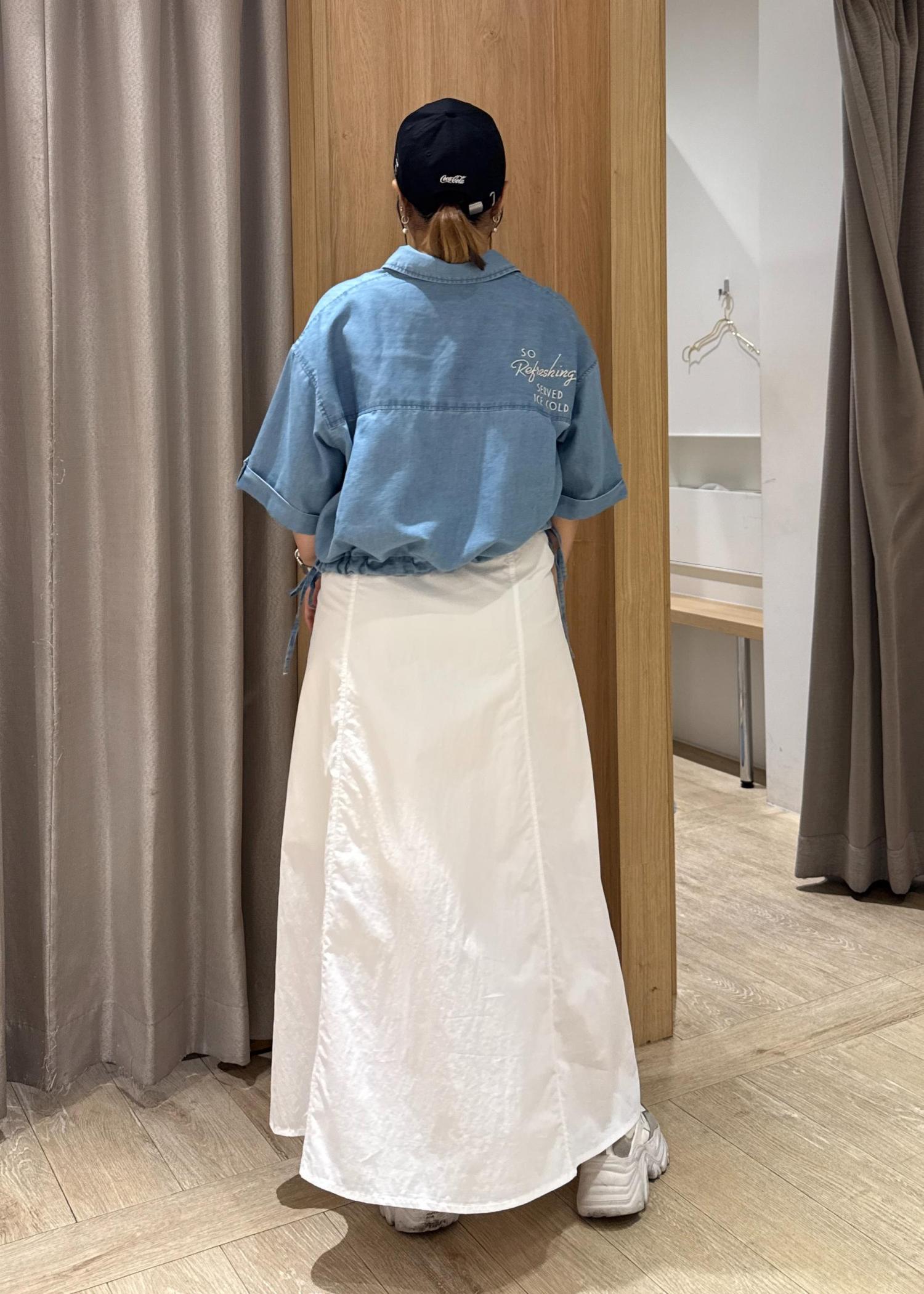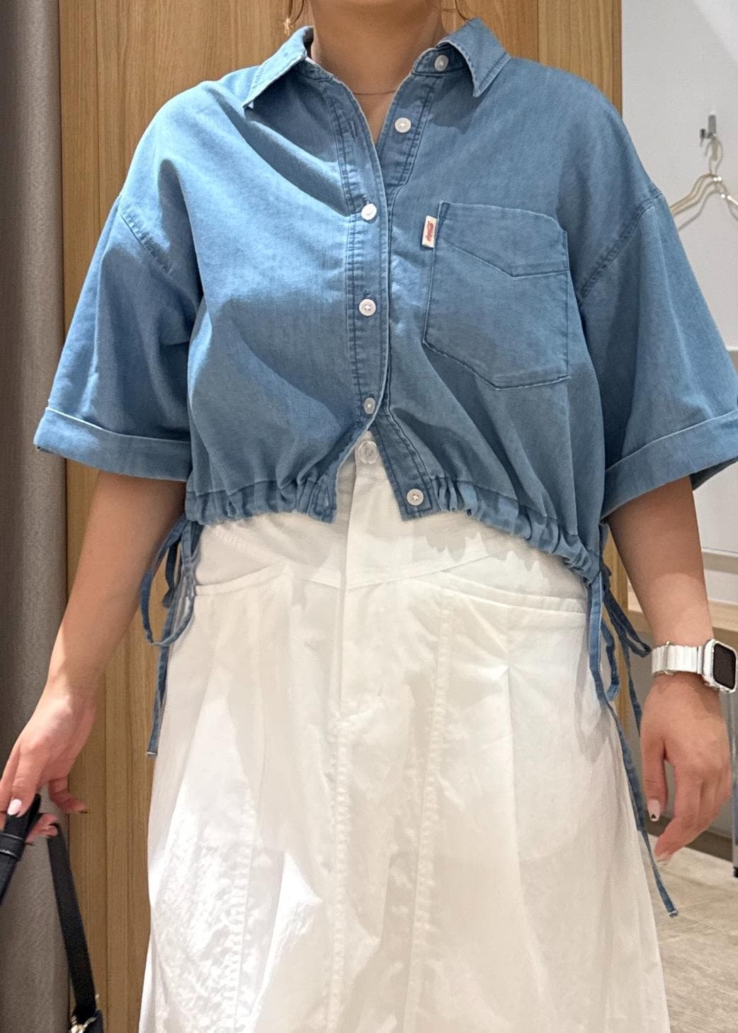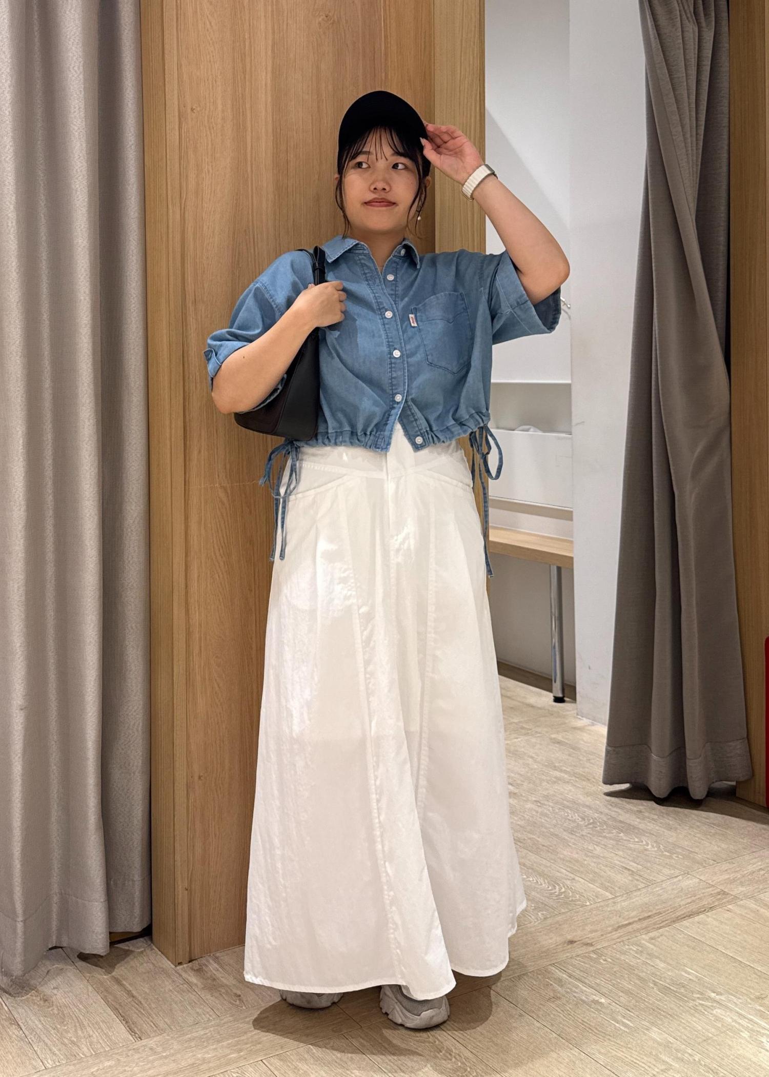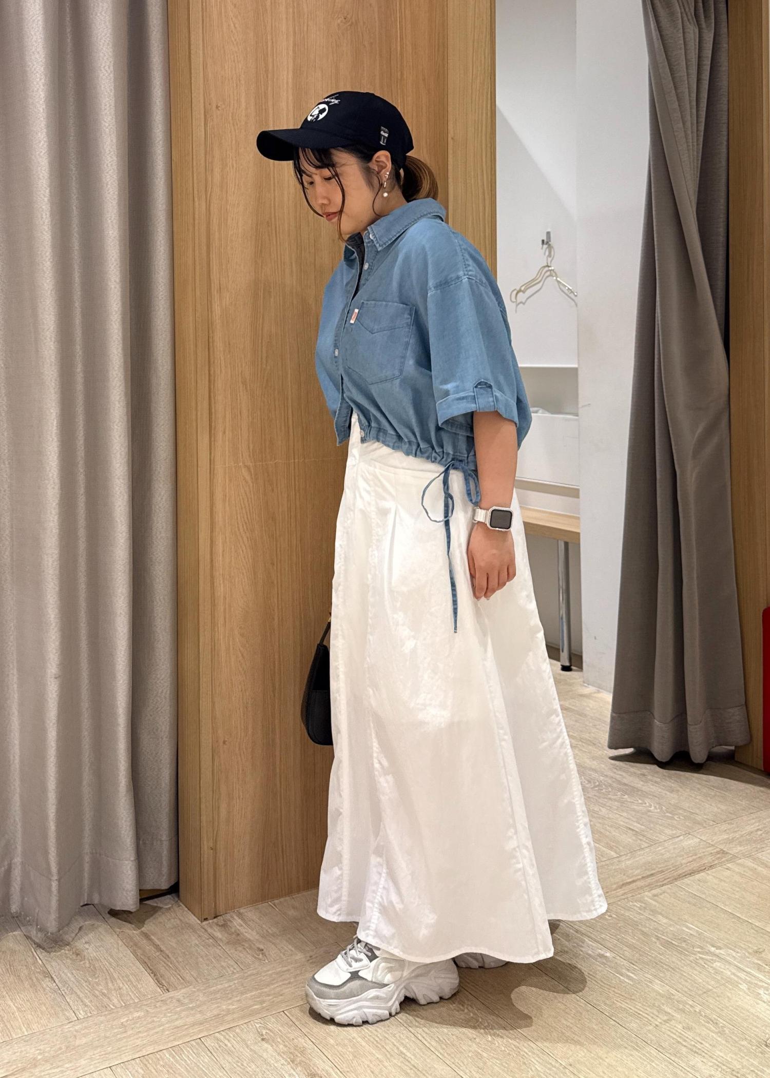 ボリューム感のあるシャツなので、一番下のボタンを開けて抜け感を出してます◎