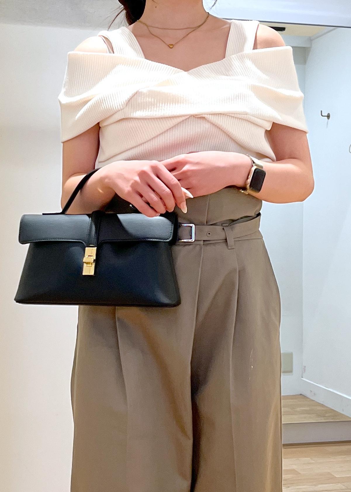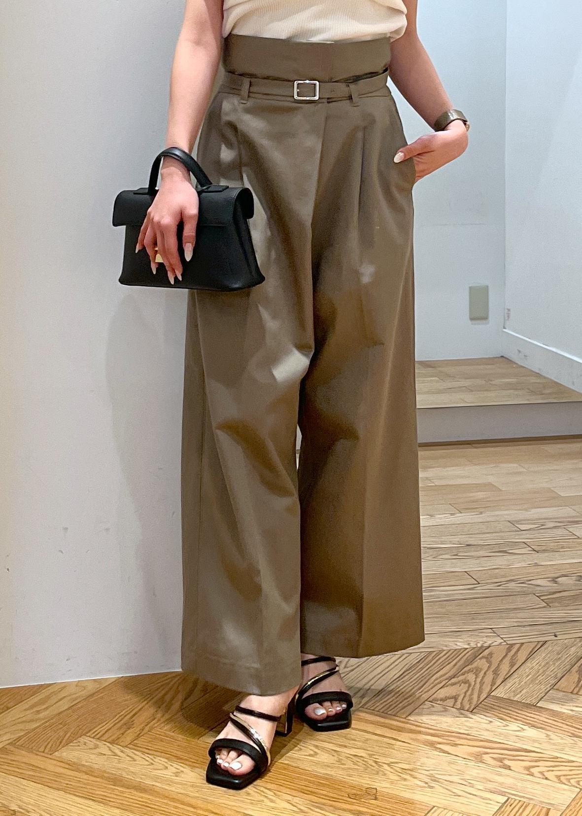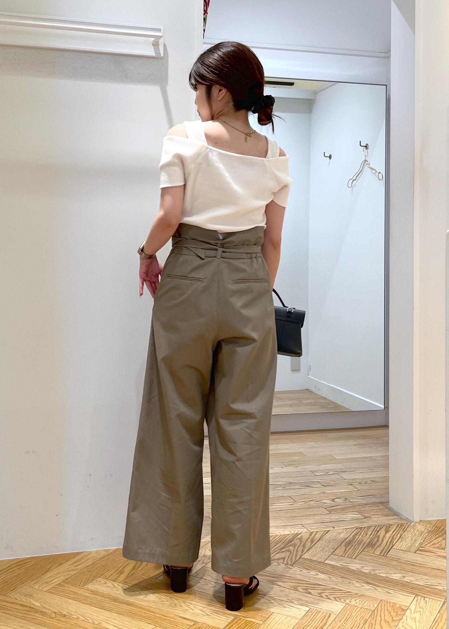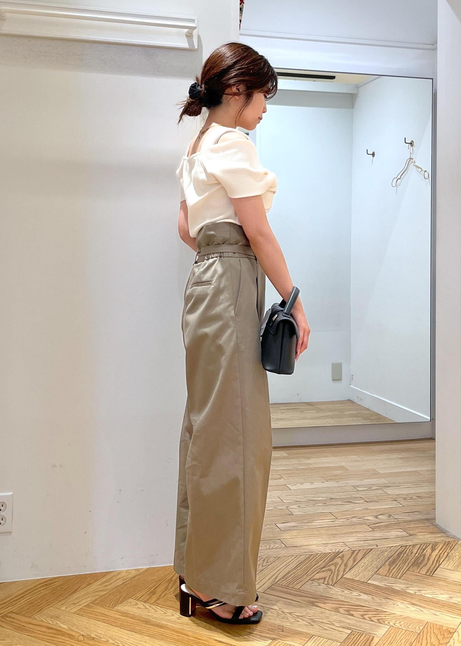 オフショルプルオーバーにカーキのワイドパンツを合わせて、大人なモードな雰囲気に!