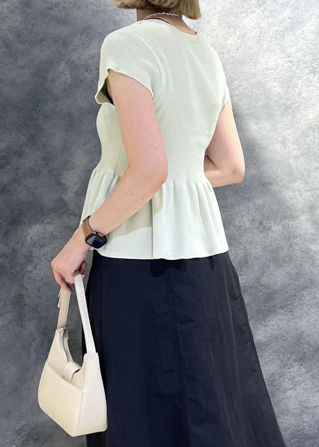 VIS【アンチピリング/洗える】美SMARTショートスリーブペプラムニットライトグリーン / F¥5,489レビュー前回5部袖バージョンをリアルバイして大活躍!
