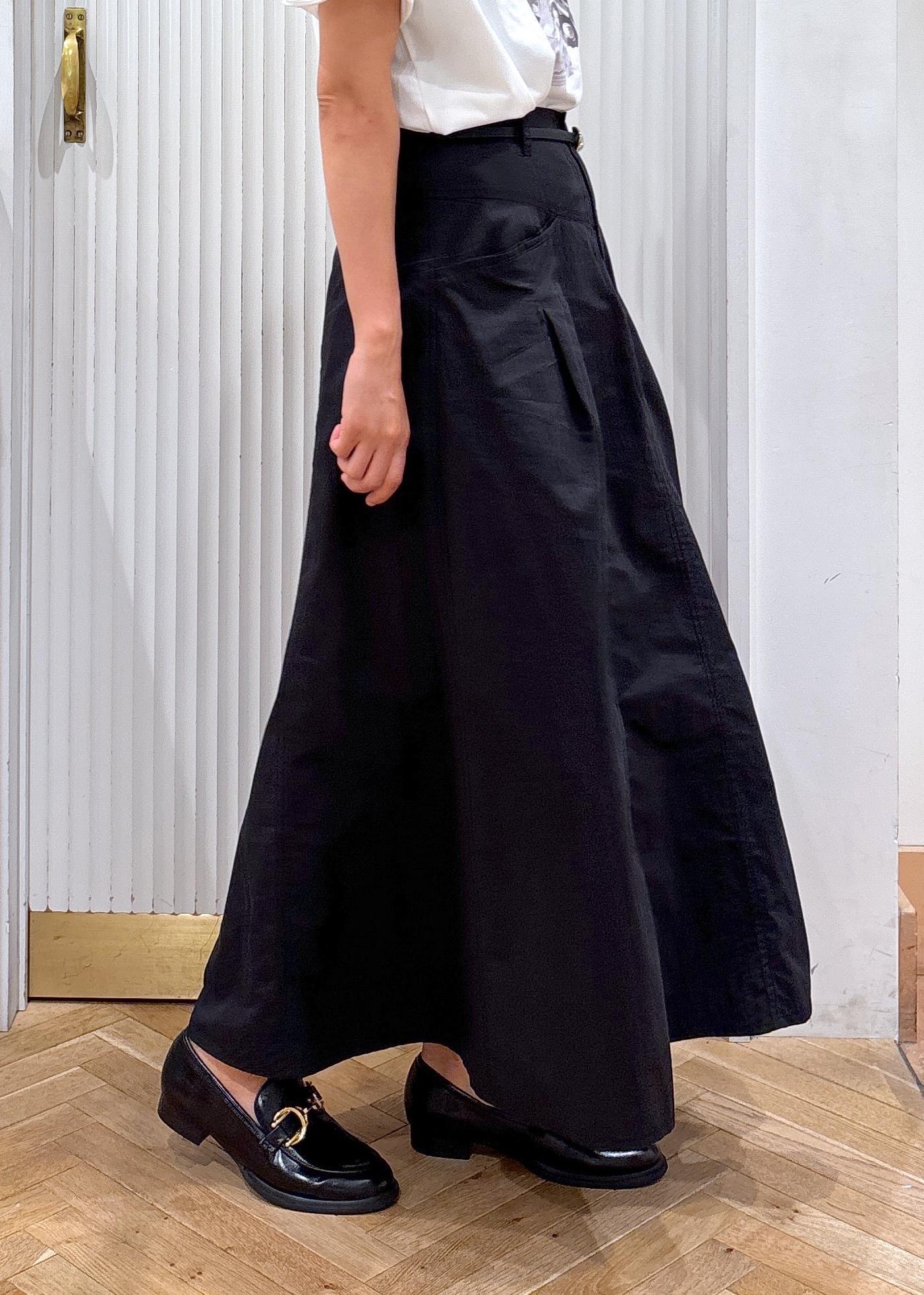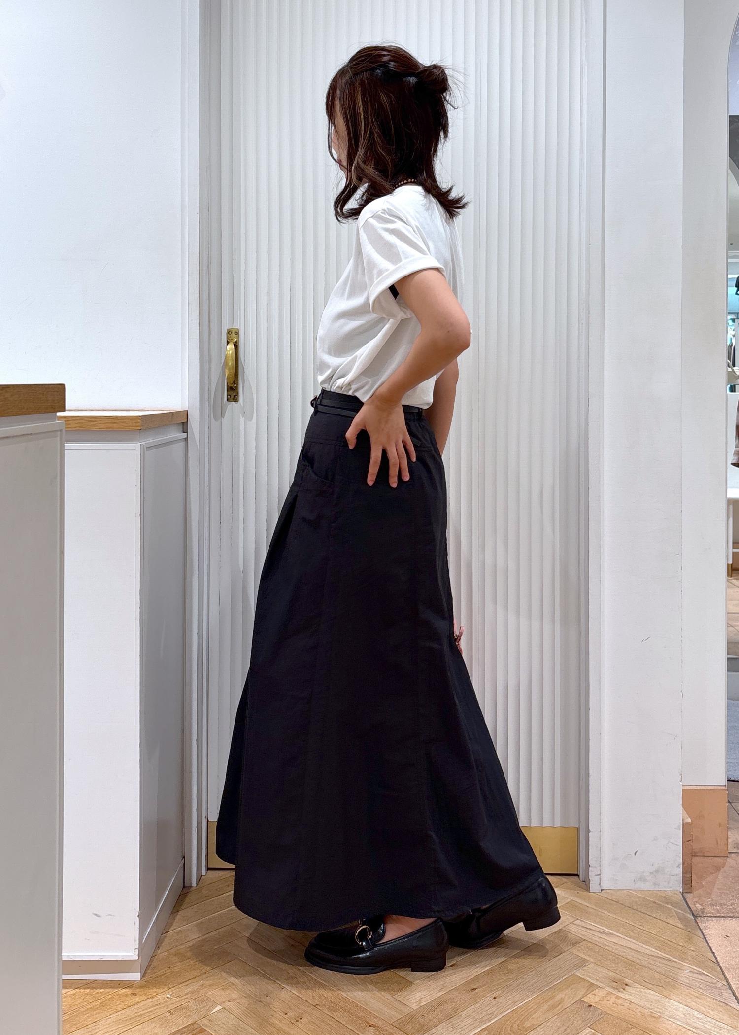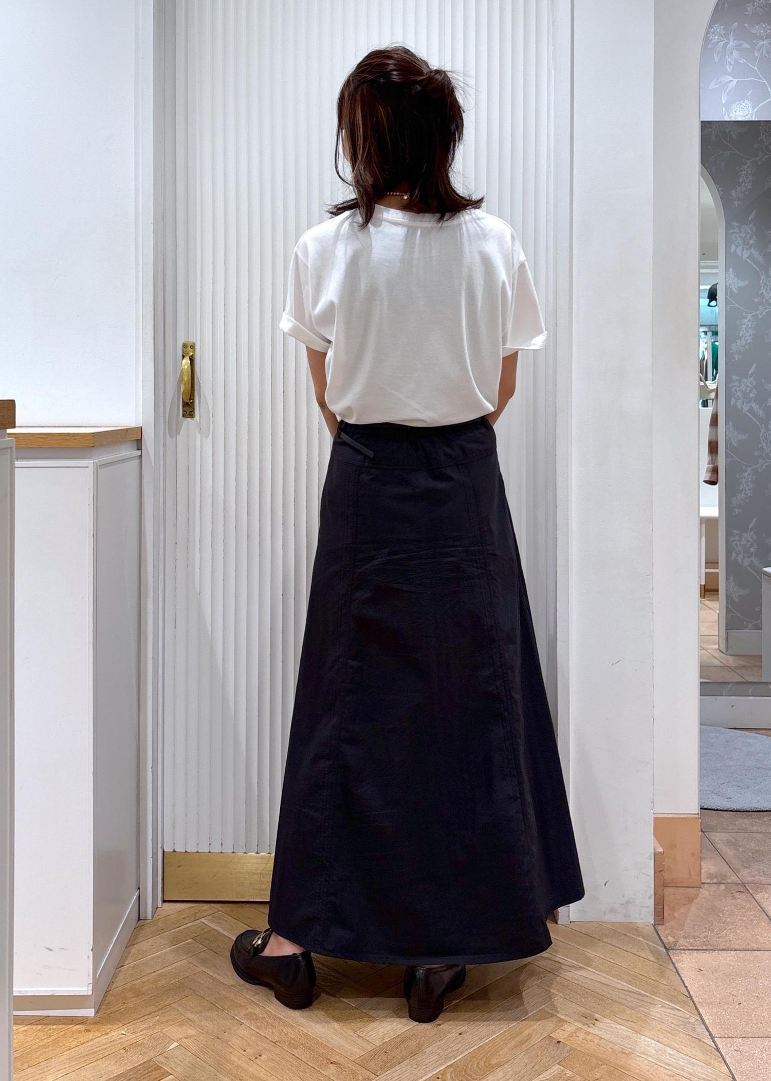 プリントが可愛いTシャツとブラックのスカートを合わせたスタイリングです。