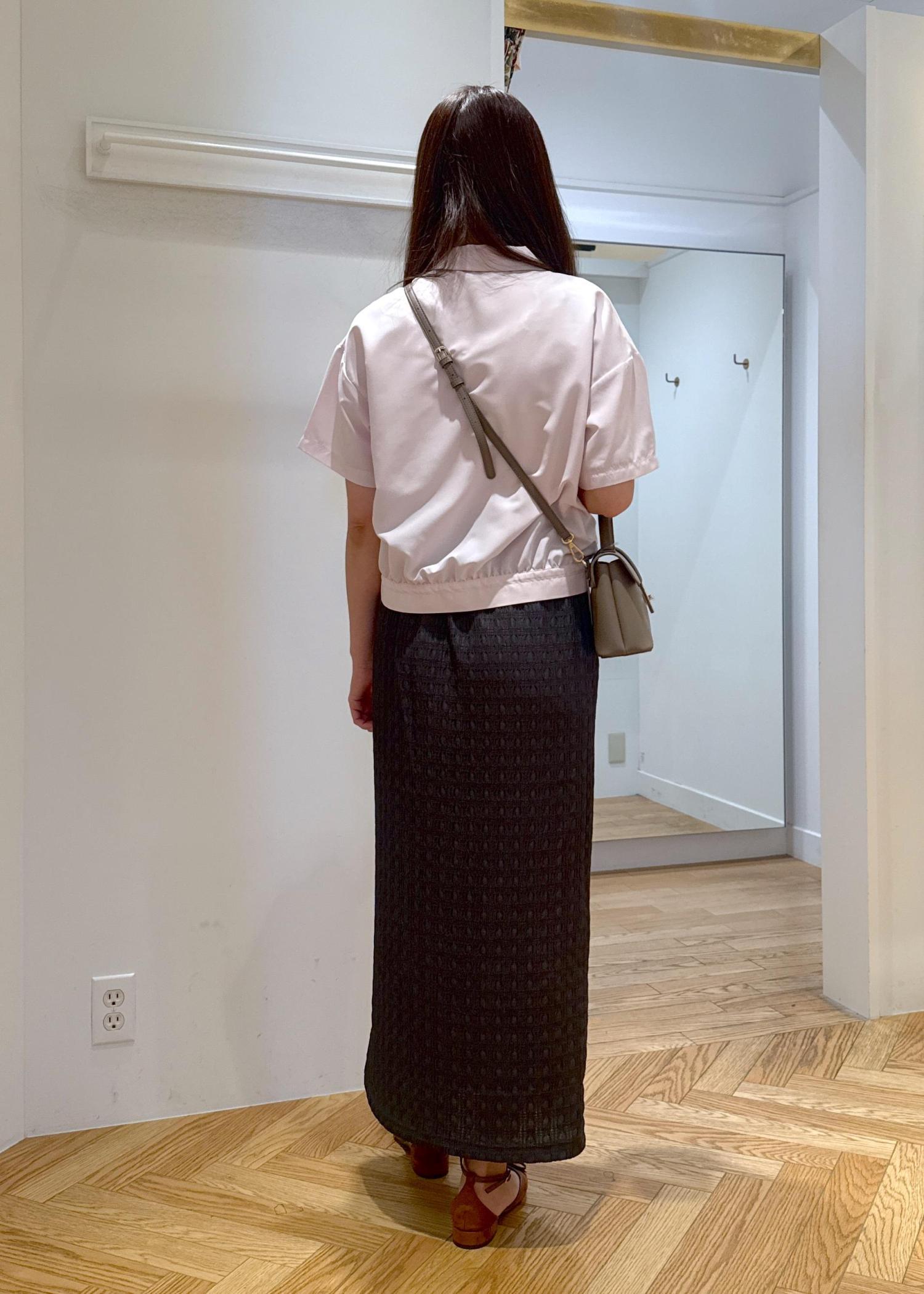 淡いピンクカラーがかわいいシャツにジャガードスカートを合わせた大人きれいめコーデです!