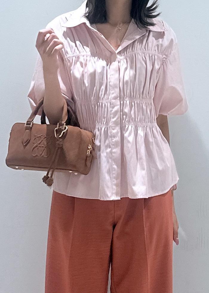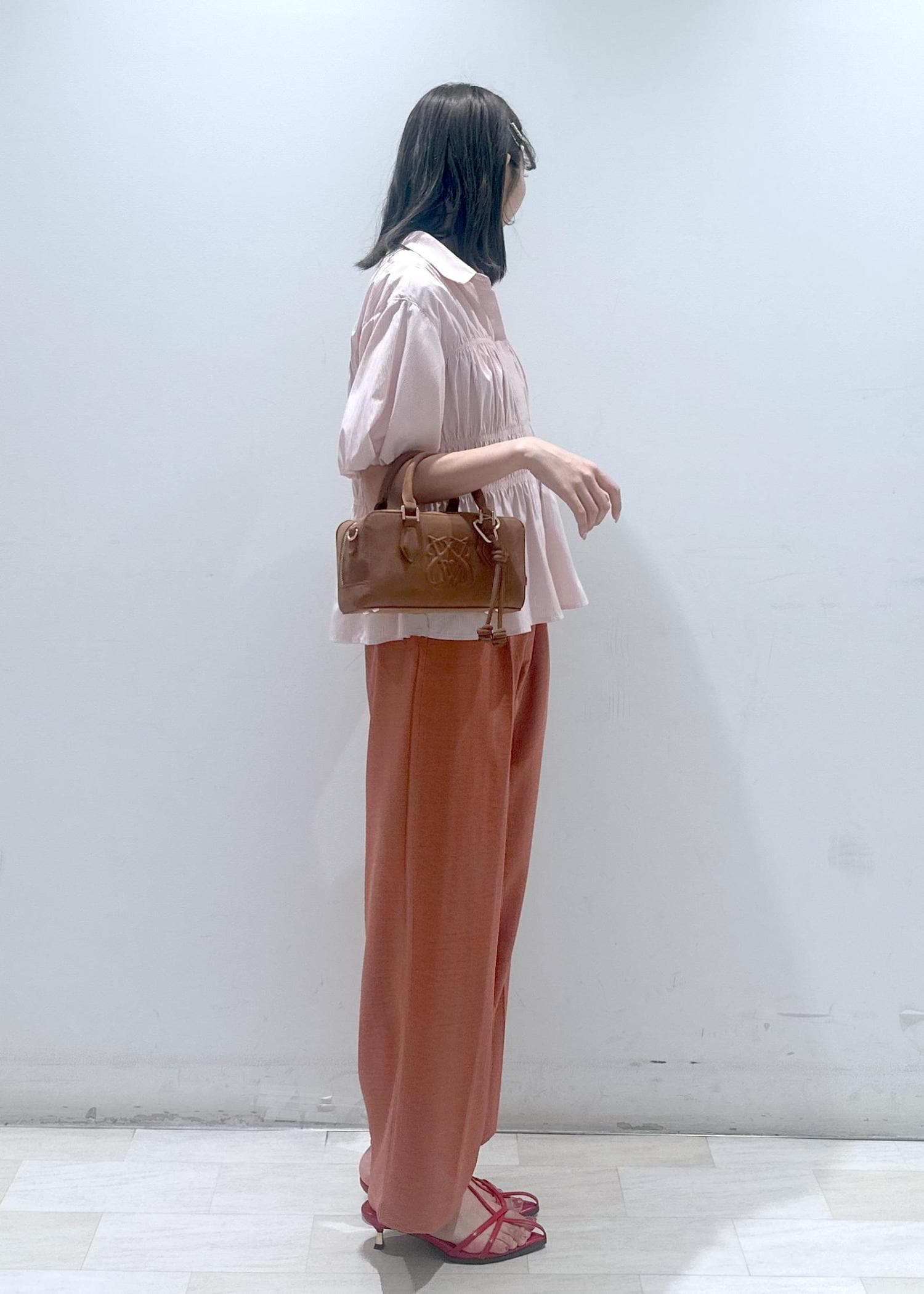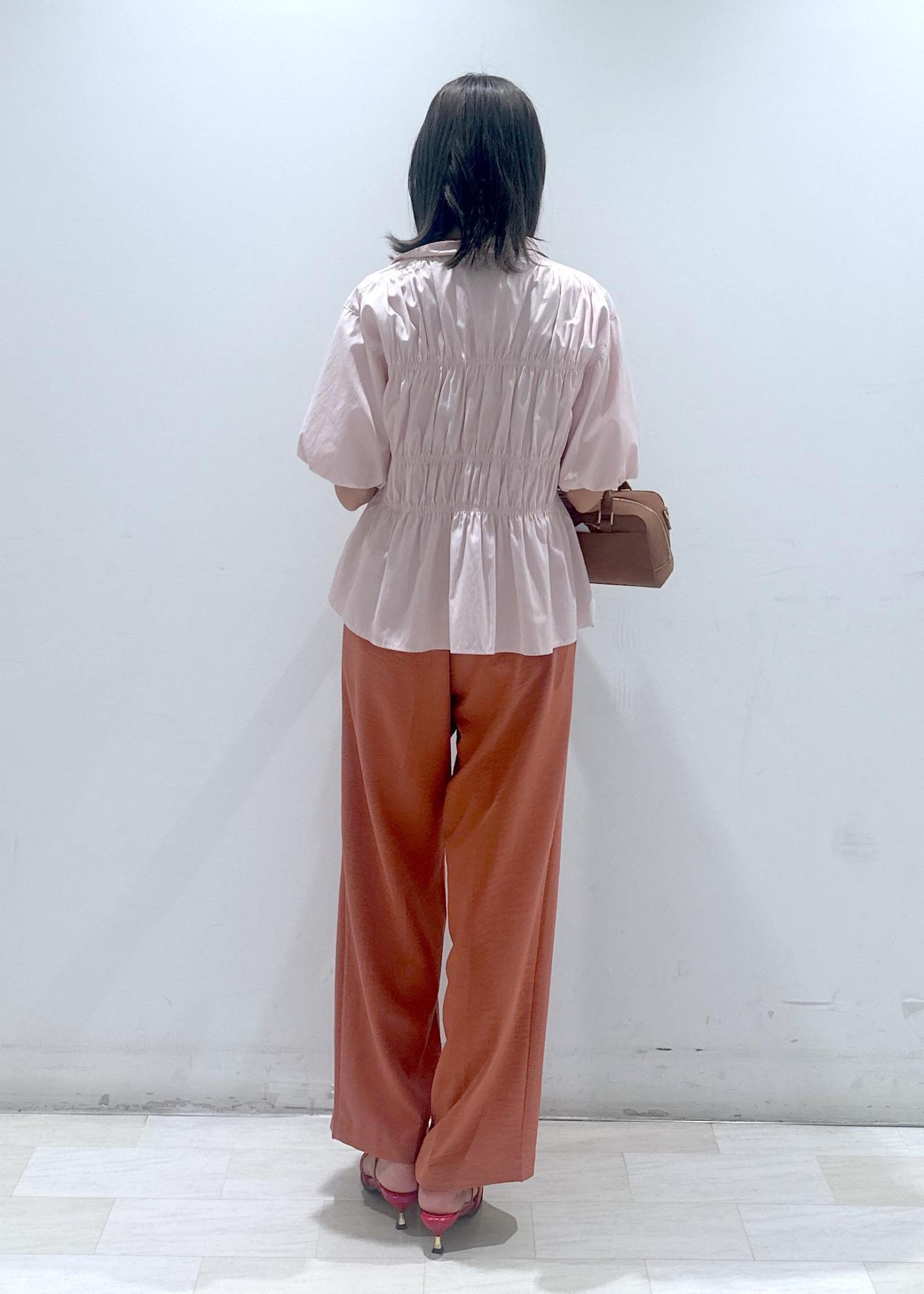 ふんわりとしたシルエットのブラウスと、ゆったりとしたワイドパンツの組み合わせは、リラックス感がありつつスッキリとした印象になります。