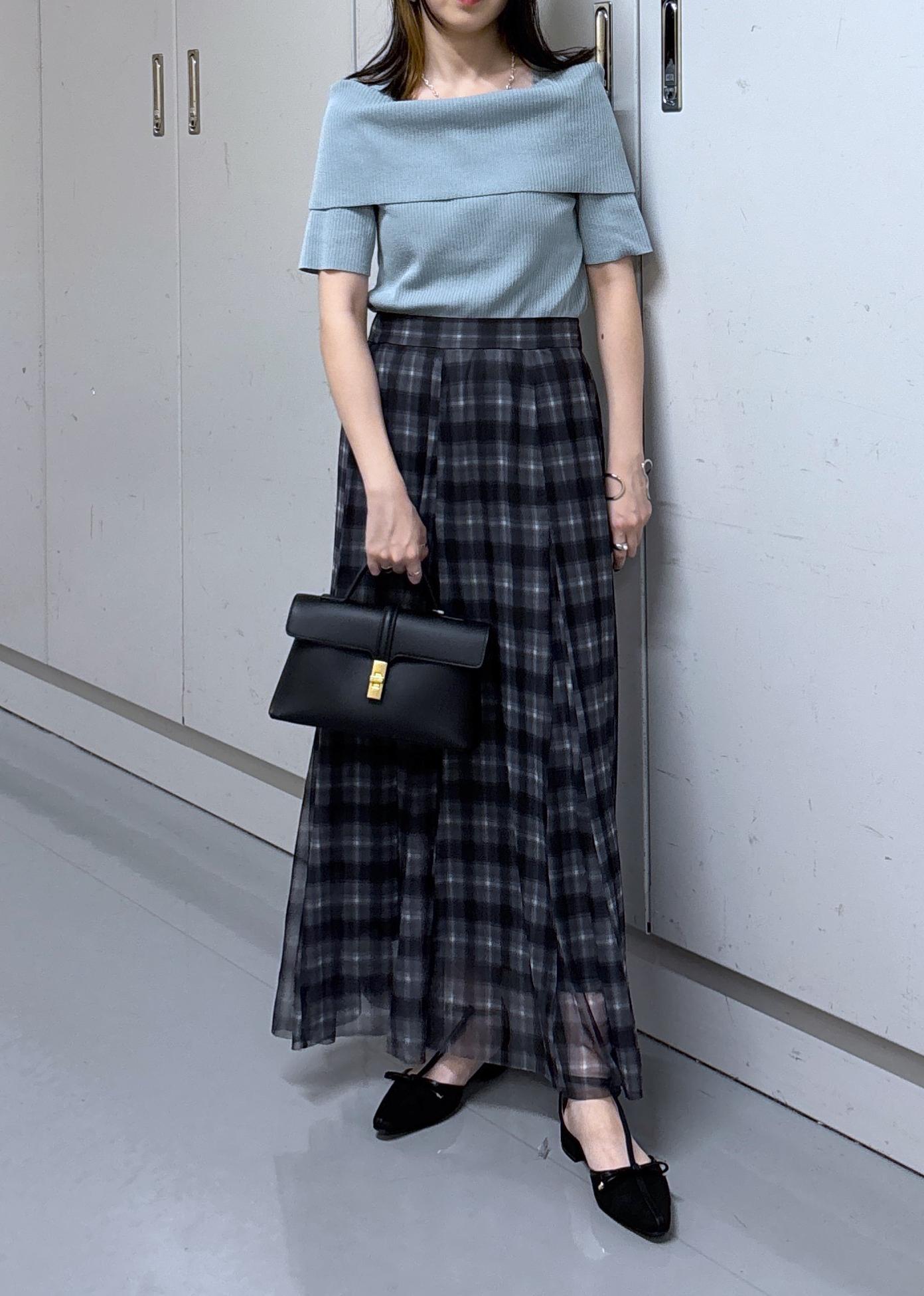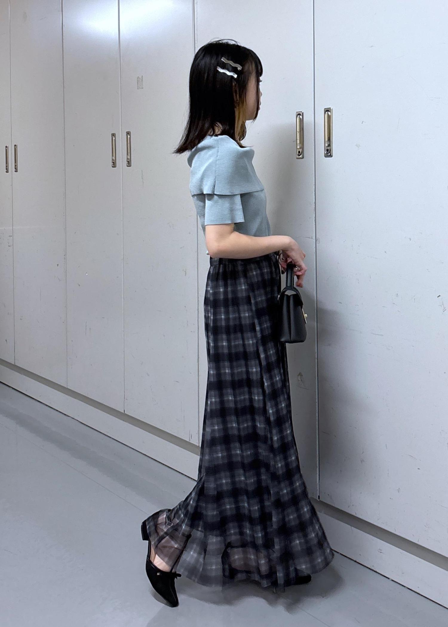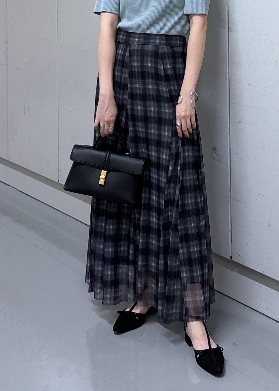 チェックシアースカートは、ブラック系を選んで甘すぎない印象にまとめました!