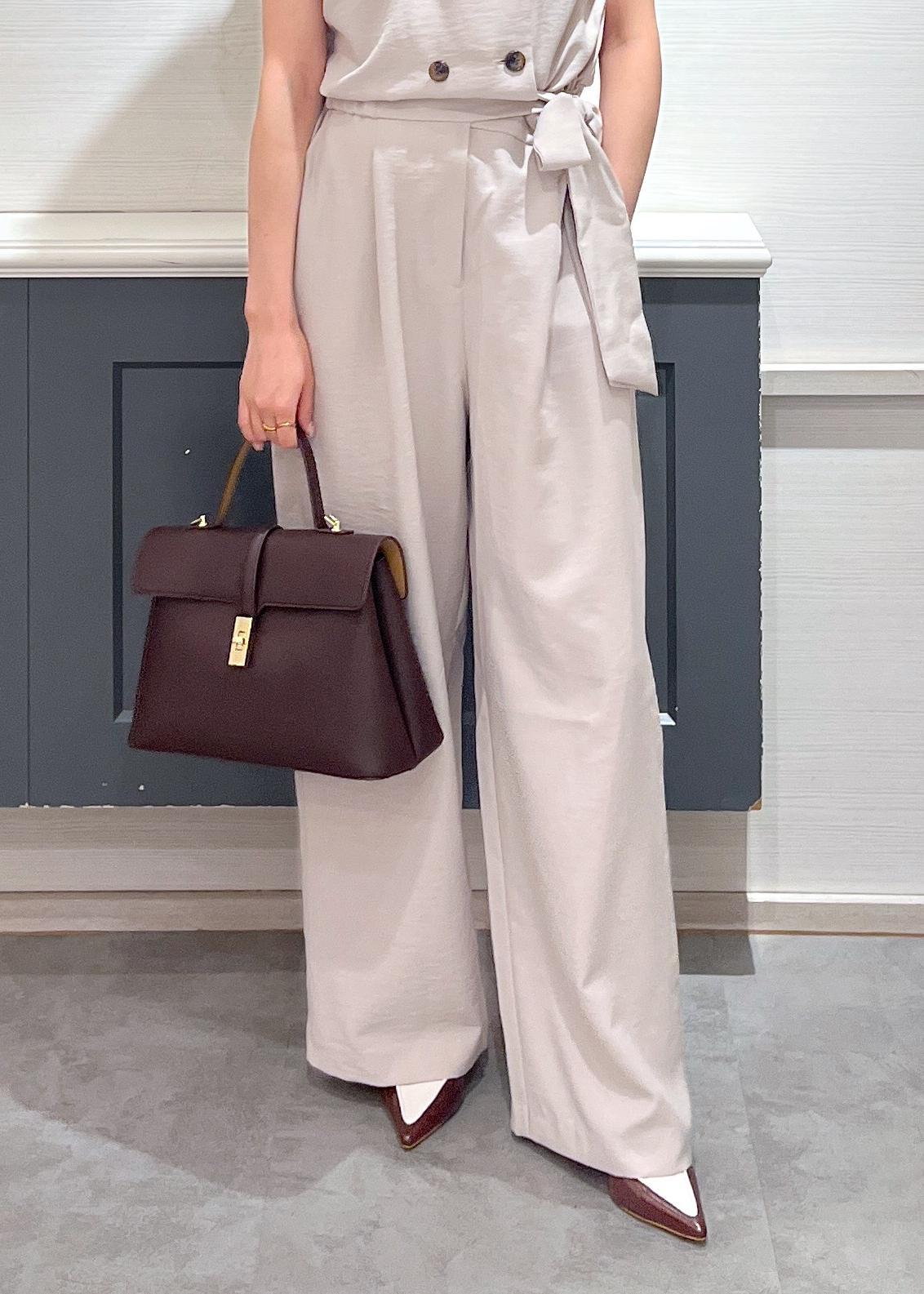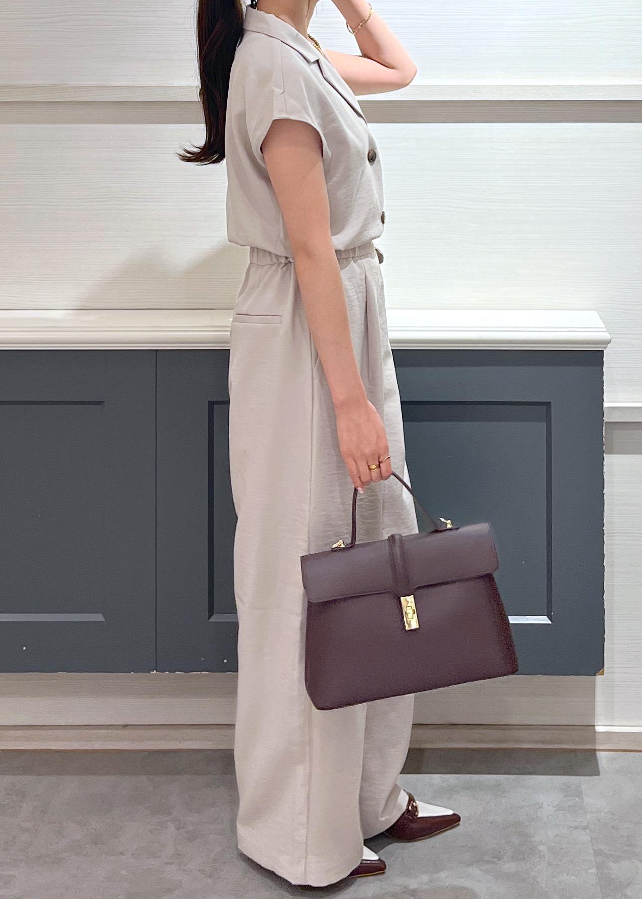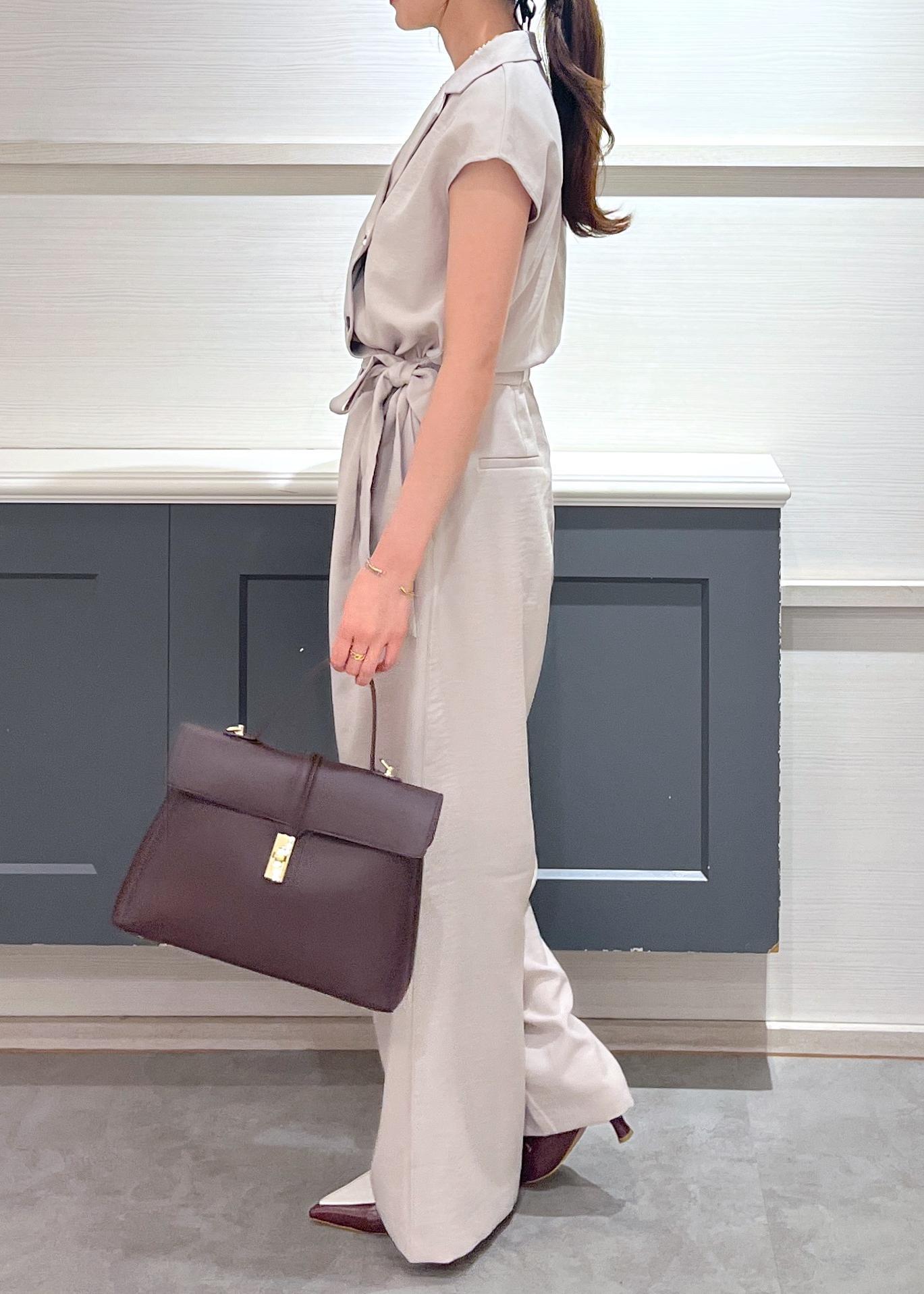 ベージュのオールインワンに合わせて小物もブラウン系で統一しました!