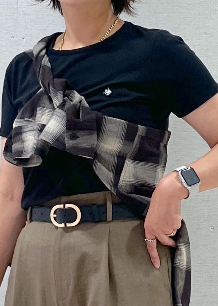 それだけだとシンプルなのでチェックシャツの肩掛けやベルトなどで少し秋らしいオシャレポイントを足しました。
